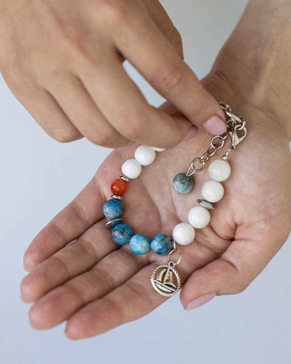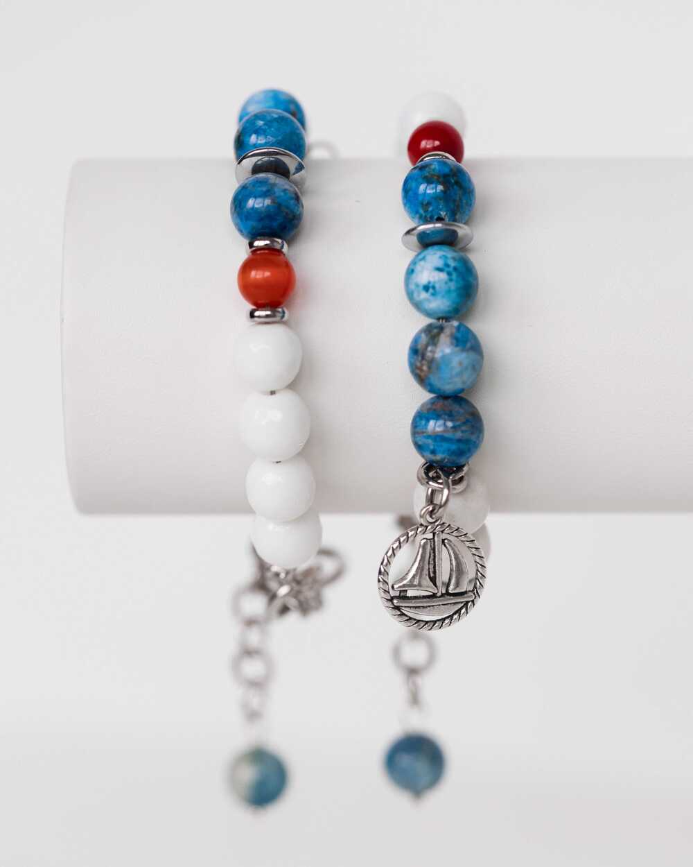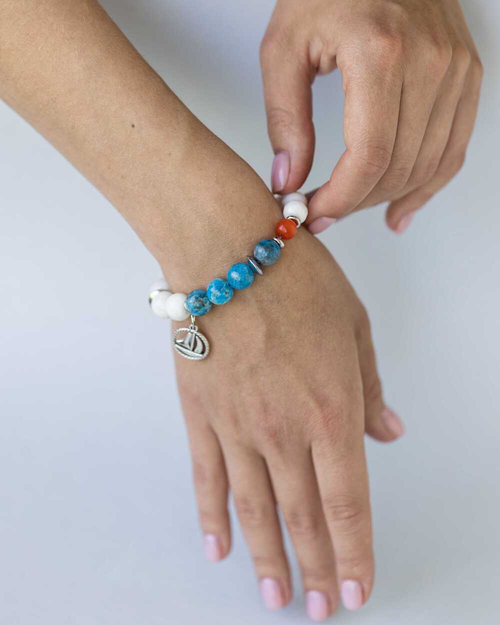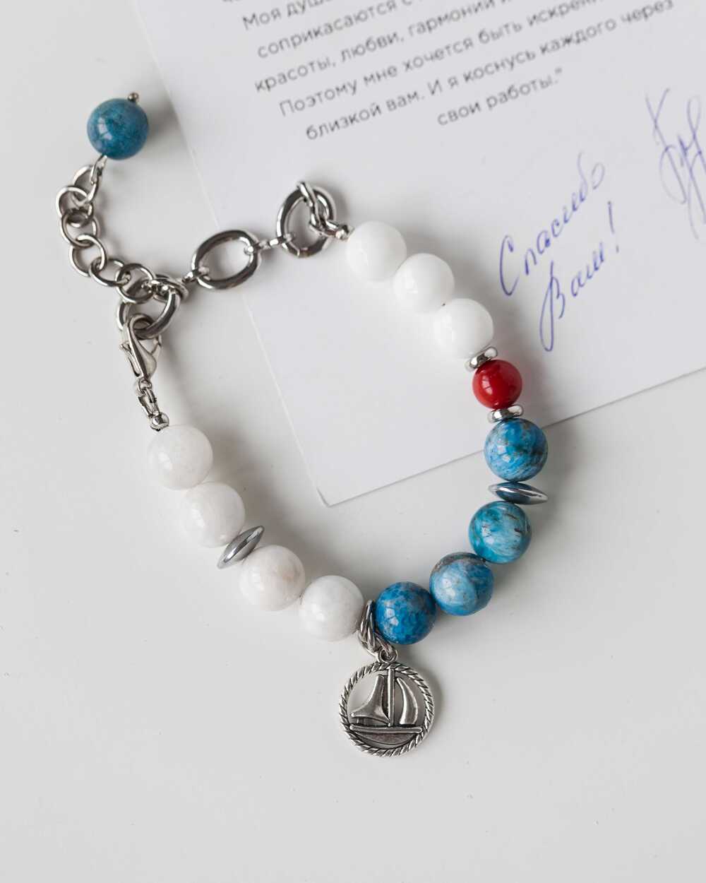 Браслет выполнен вручную из натуральных природных минералов- белого Лунного камня премиальной огранки, синего Апатита и Коралловой вставки.