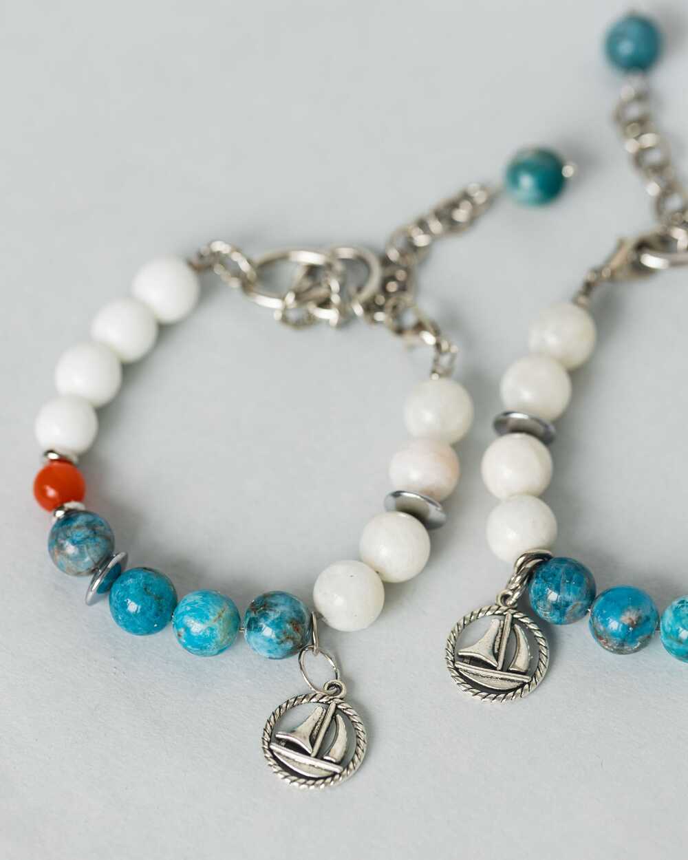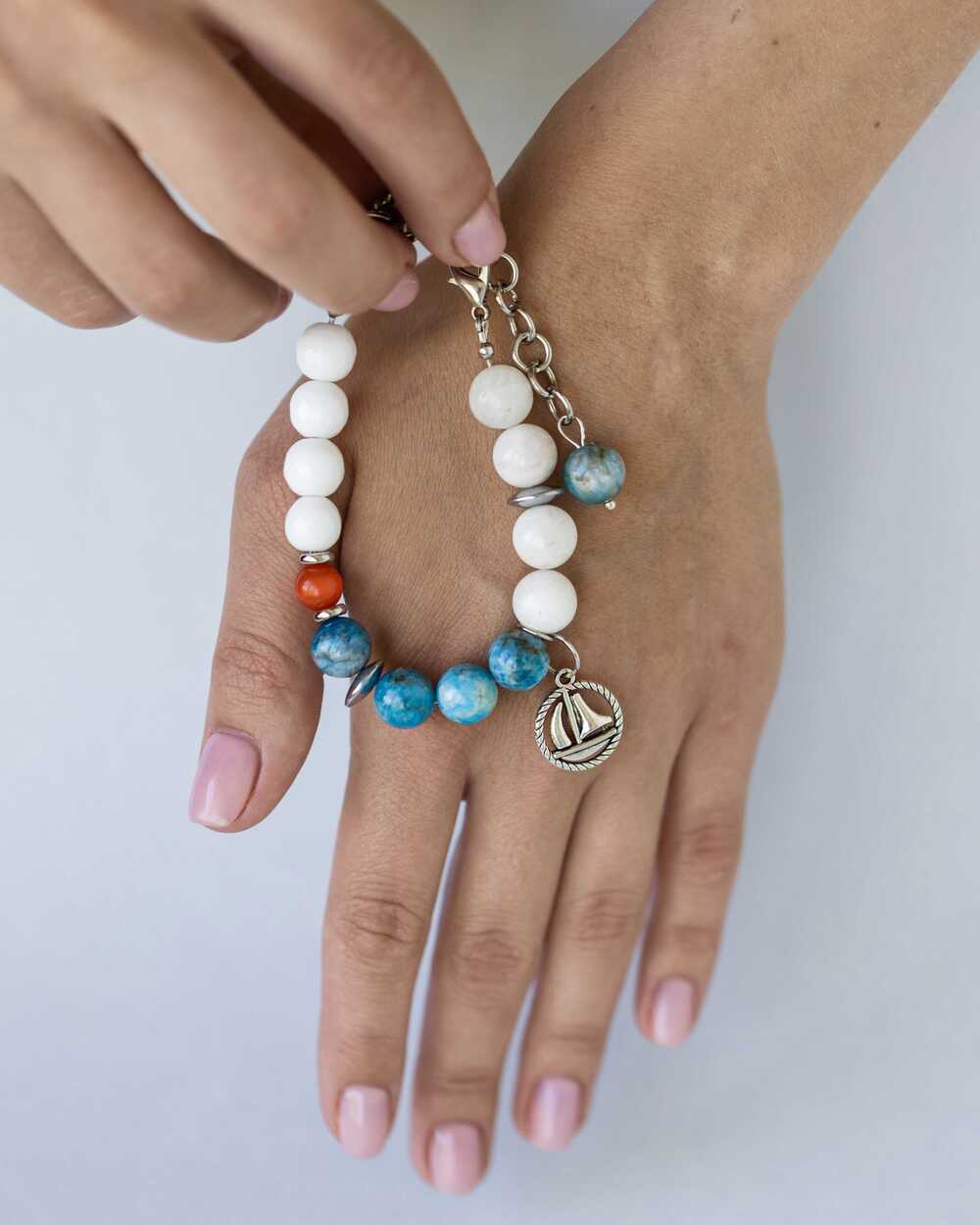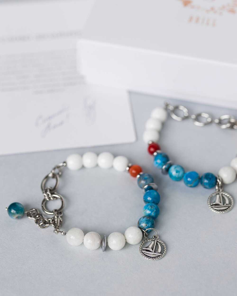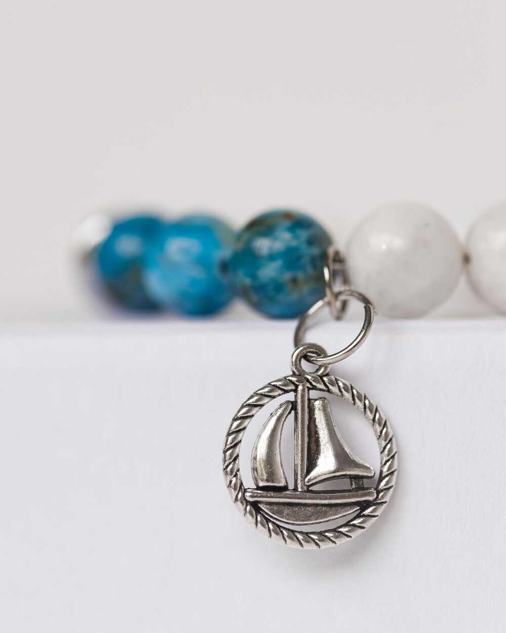 Браслет выполнен вручную из натуральных природных минералов- белого Лунного камня премиальной огранки, синего Апатита и Коралловой вставки.
