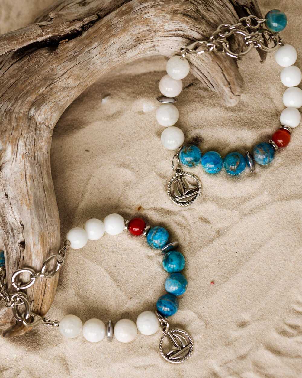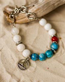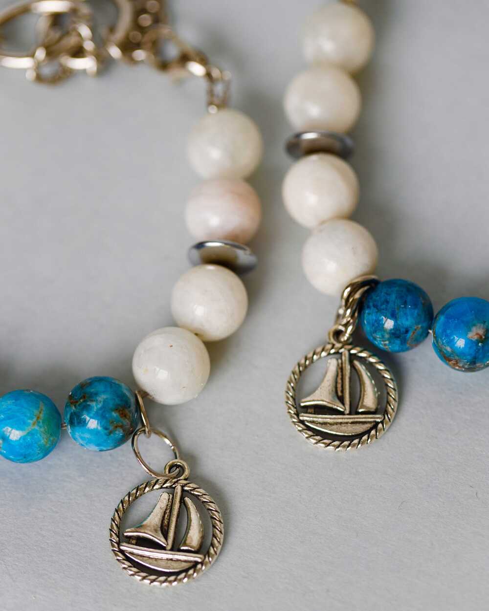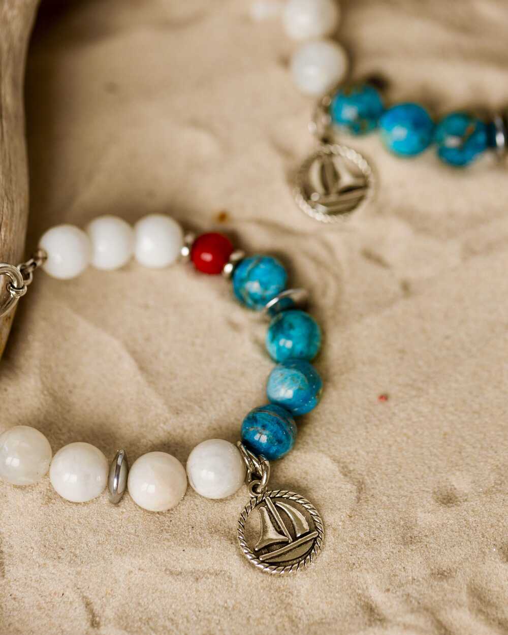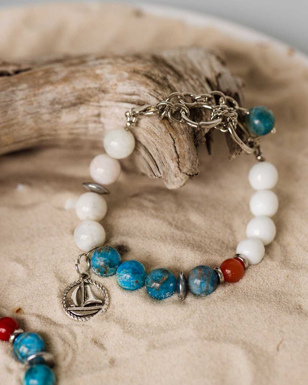 Браслет выполнен вручную из натуральных природных минералов- белого Лунного камня премиальной огранки, синего Апатита и Коралловой вставки.