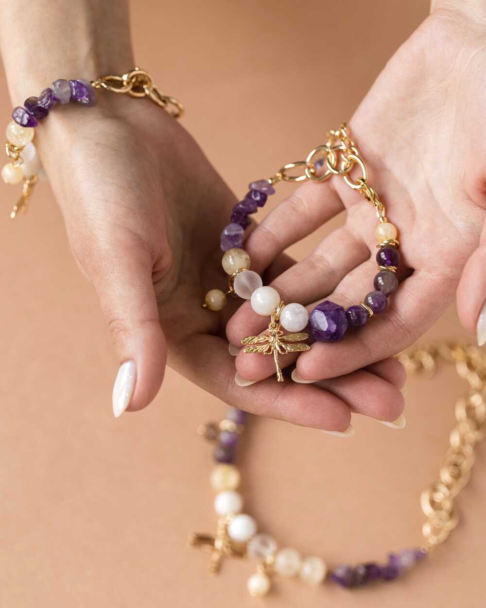 Браслет выполнен вручную из натуральных природных минералов- Лунного камня, Аметиста, Цитрина, Кварца
