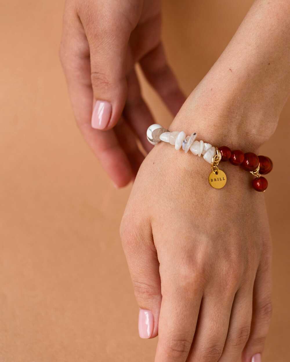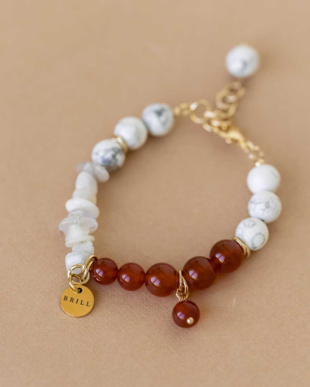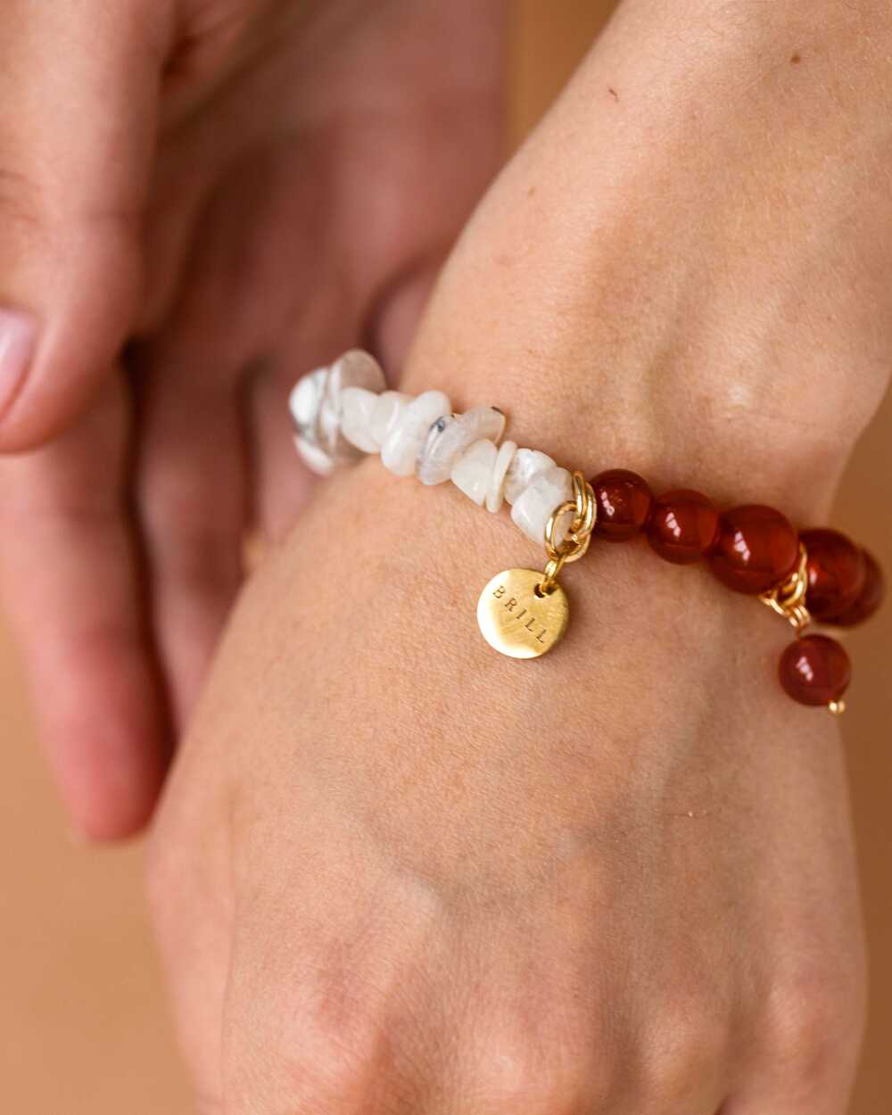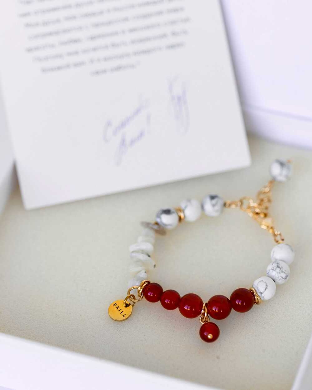 Браслет выполнен вручную из натуральных природных минералов- кахолонг, лунный камень и сердолик.