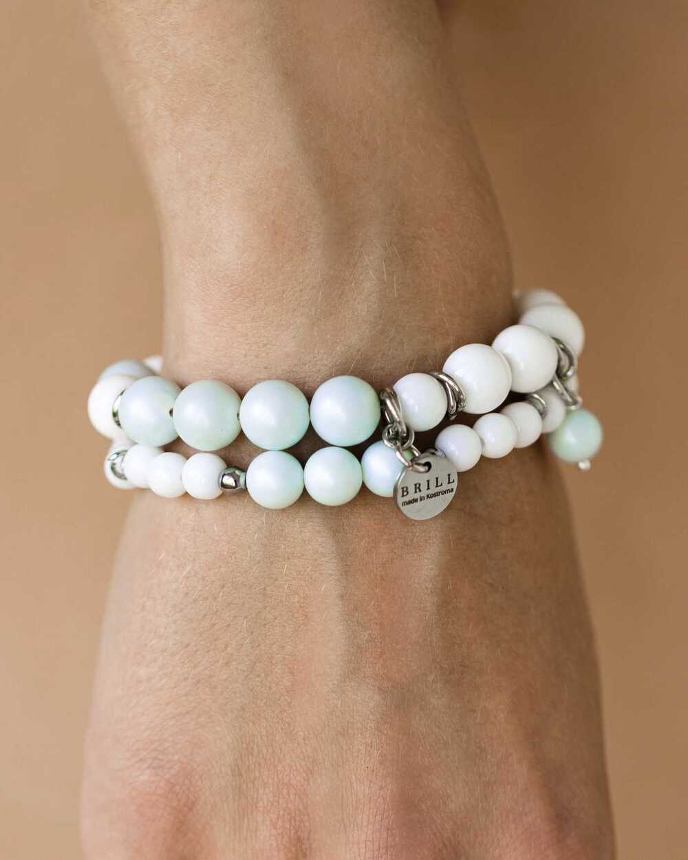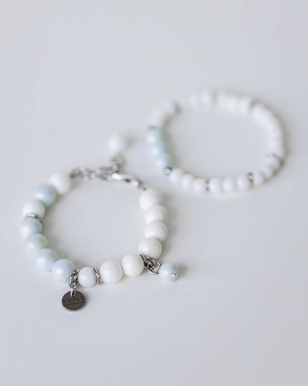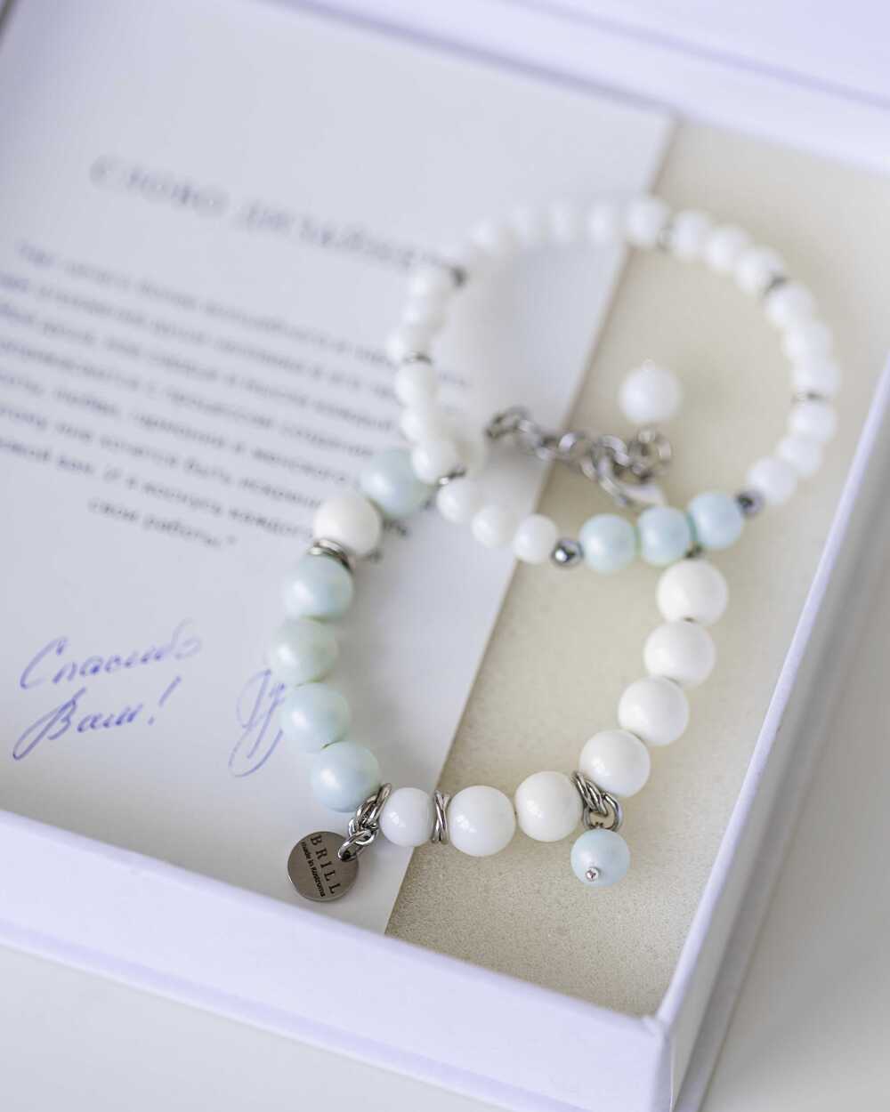 Второй браслет базовый на резиночке, дополняет основной браслет. Он состоит из белого агата и жемчуга «Майорка».