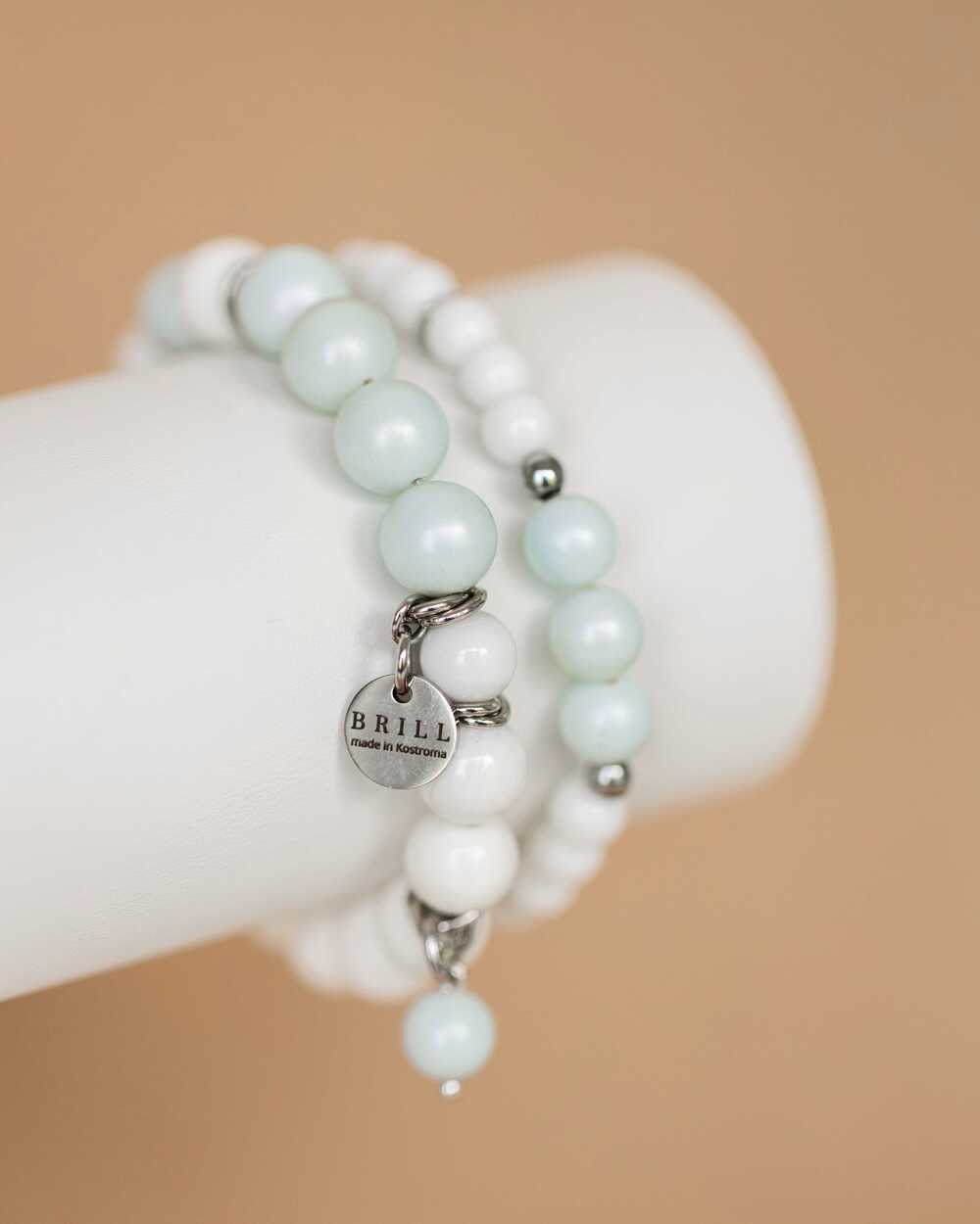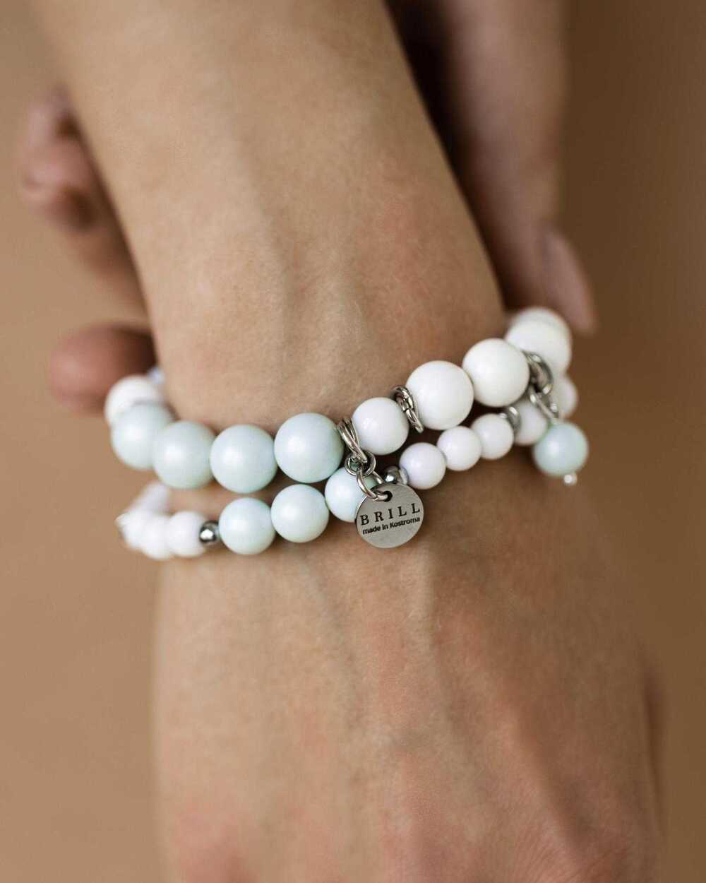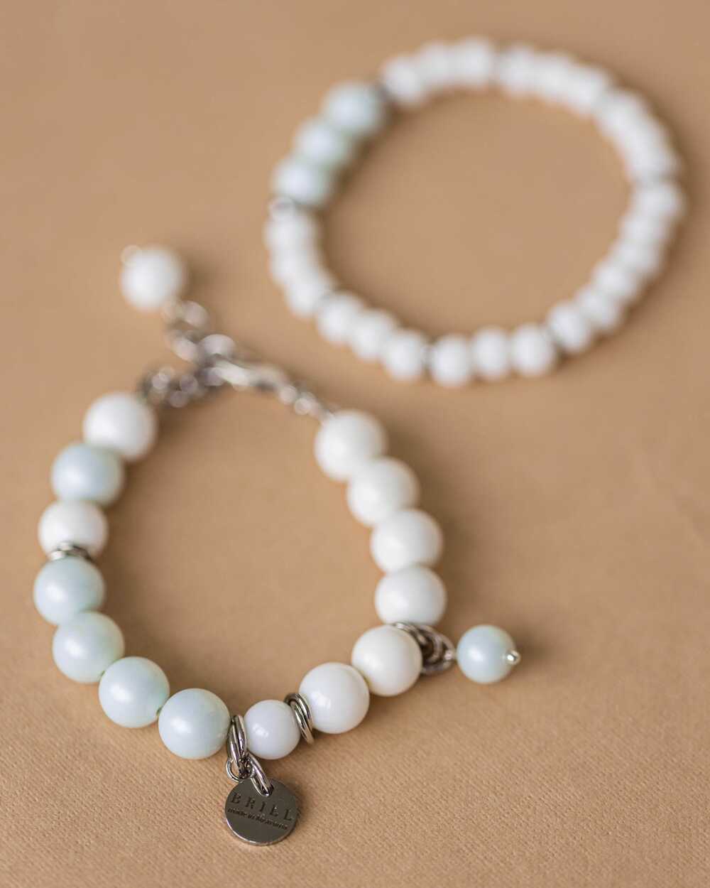 Второй браслет базовый на резиночке, дополняет основной браслет. Он состоит из белого агата и жемчуга «Майорка».