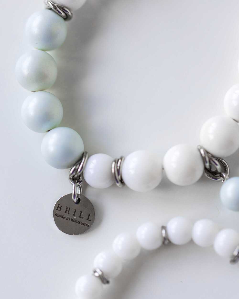 Основной браслет состоит из белого агата и жемчуга «Майорка», он украшен подвижной родированной подвеской. Браслет застегивается на плотный карабин.