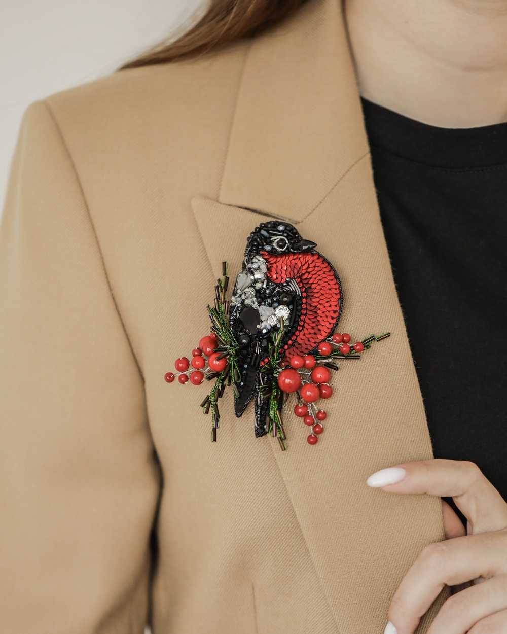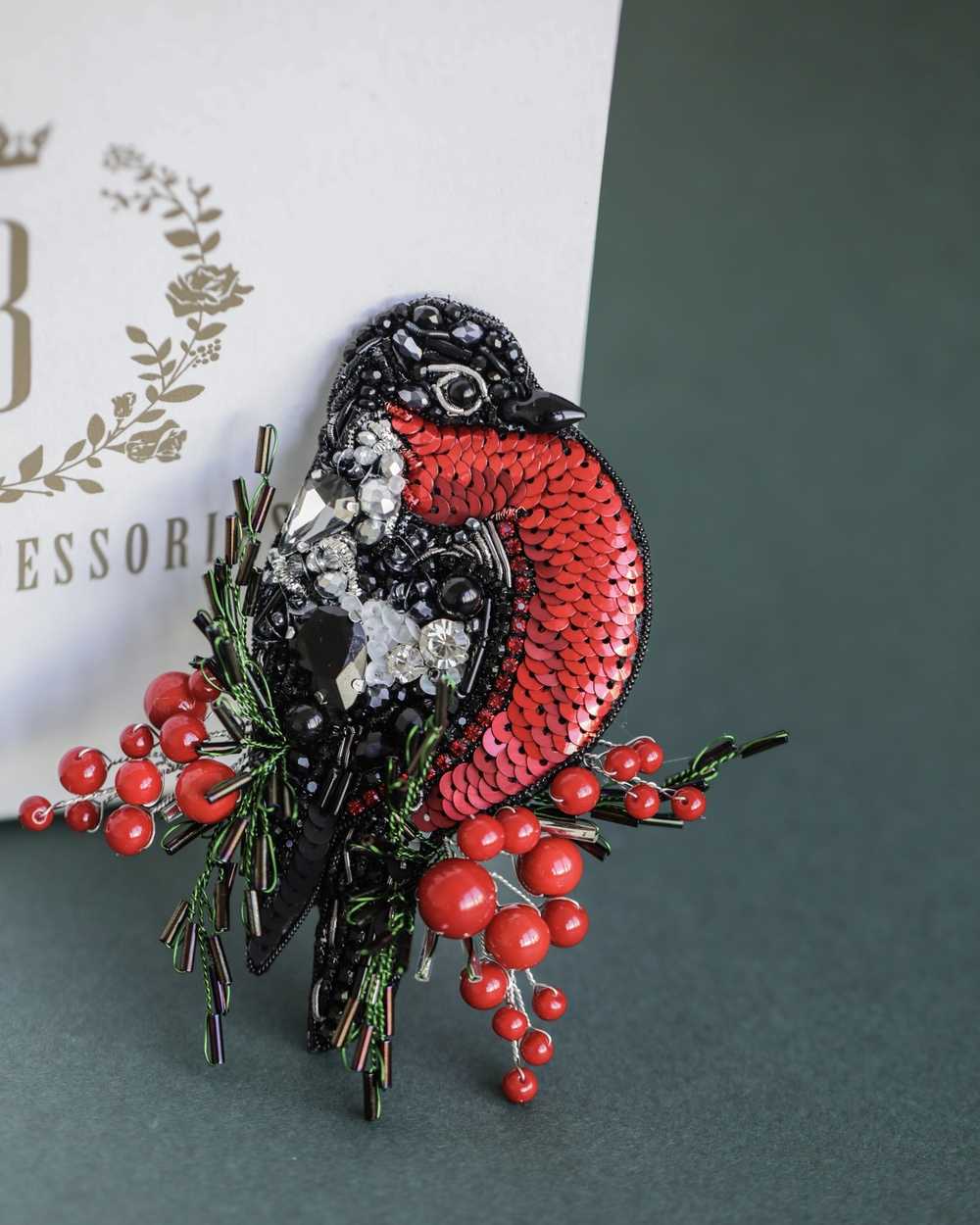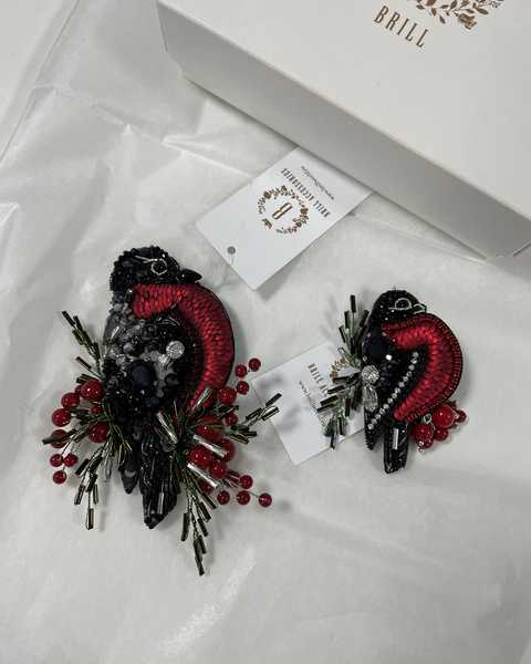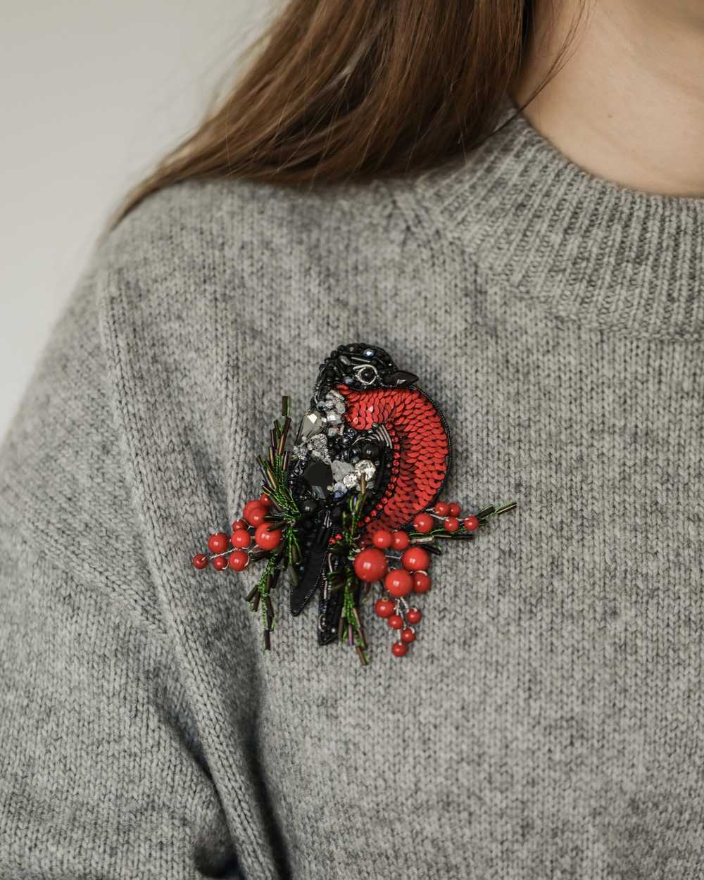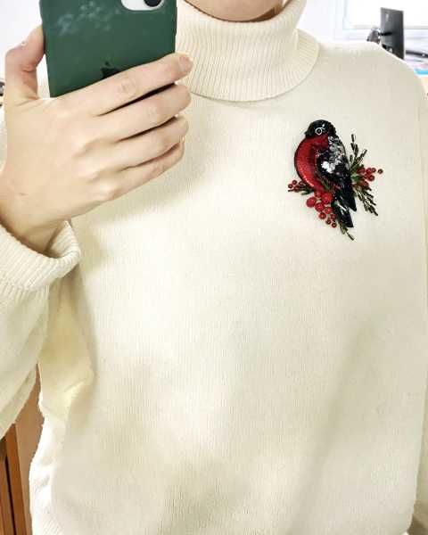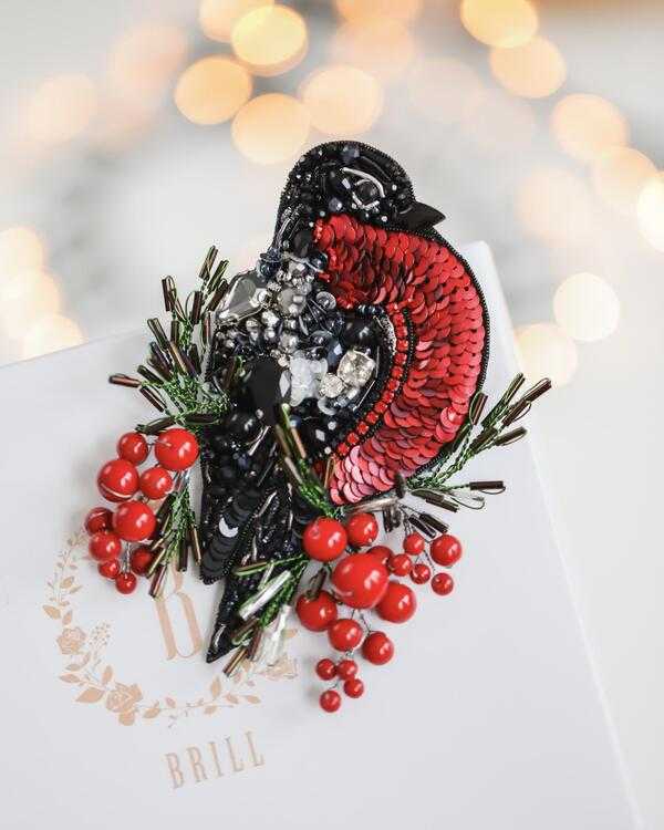 Брошь создана с использованием высококачественных материалов, включая сверкающие пайетки и кристаллы, которые придают изделию блеск и сияние. Брошь «Снегирь» можно носить с пальто, свитерами, платьями или даже использовать как украшение для сумки.