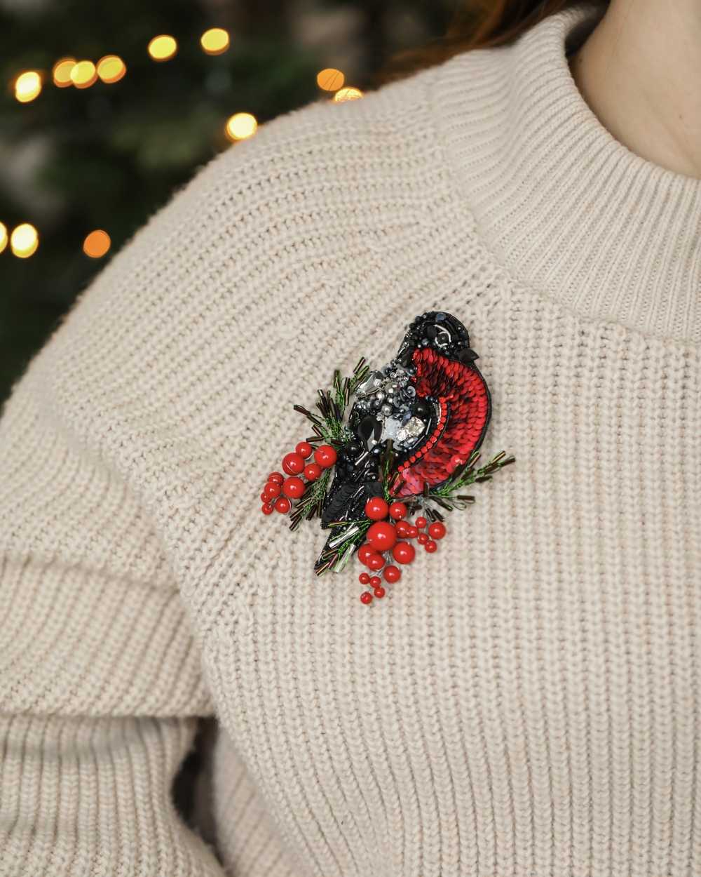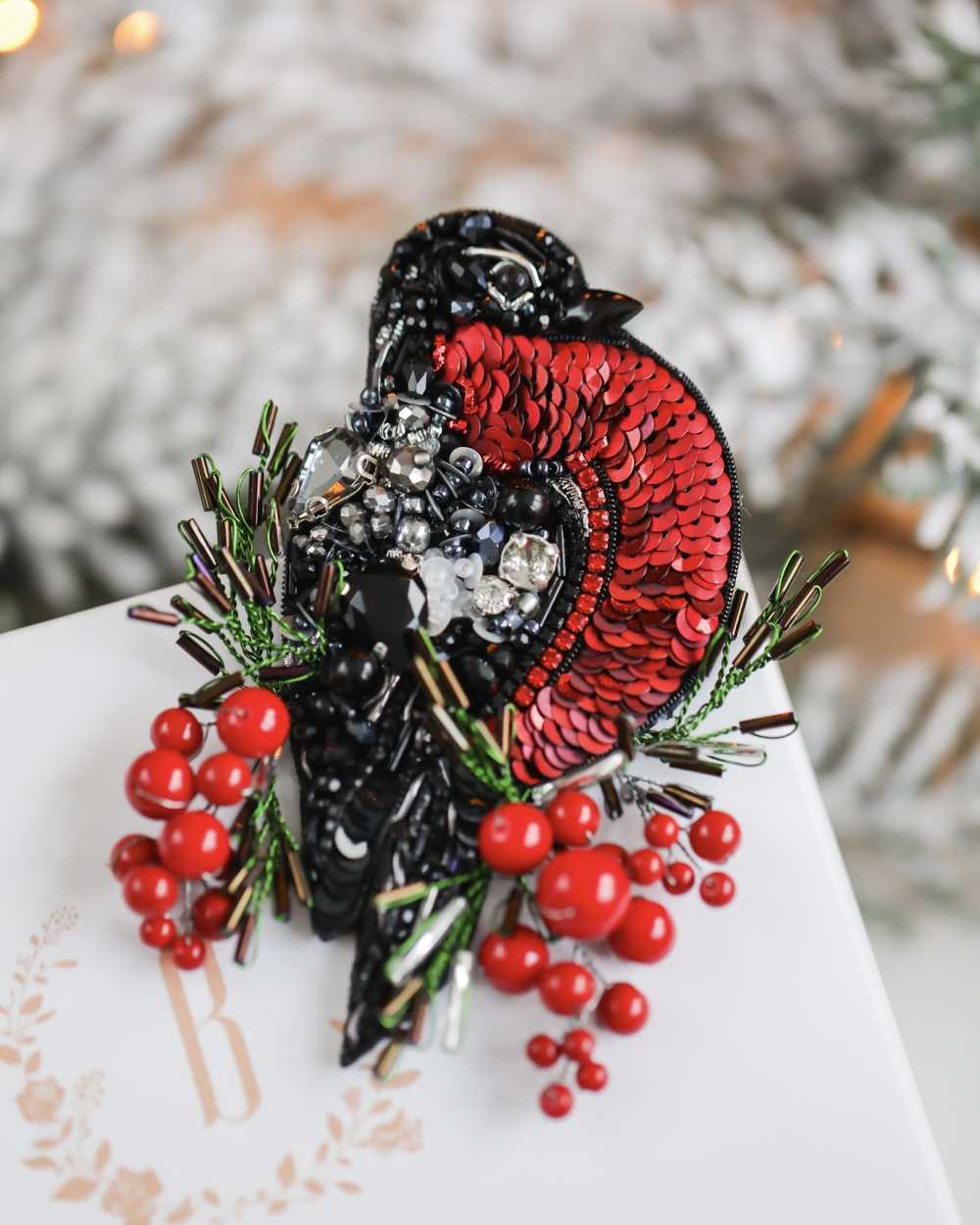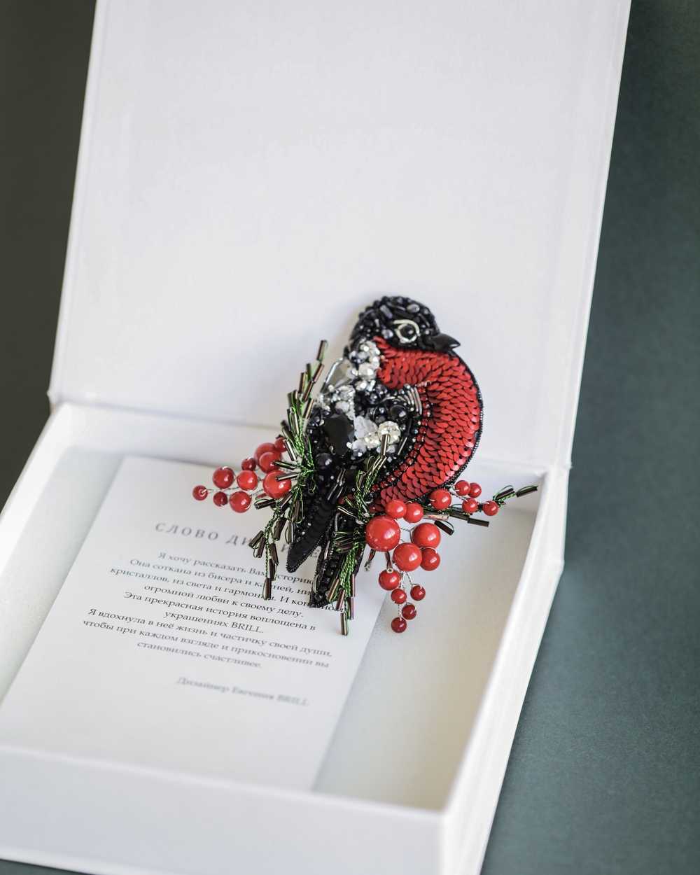 Брошь создана с использованием высококачественных материалов, включая сверкающие пайетки и кристаллы, которые придают изделию блеск и сияние. Брошь «Снегирь» можно носить с пальто, свитерами, платьями или даже использовать как украшение для сумки.