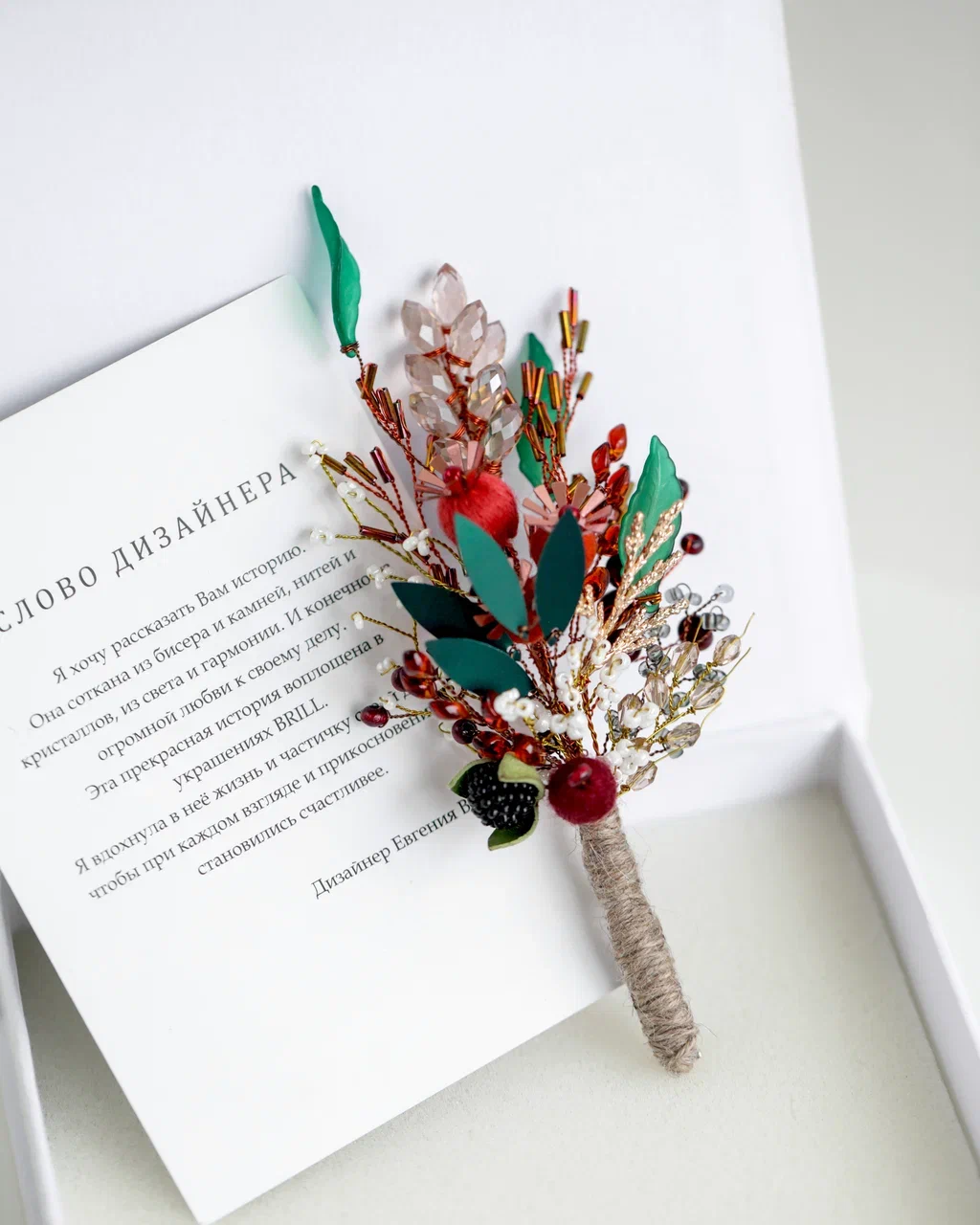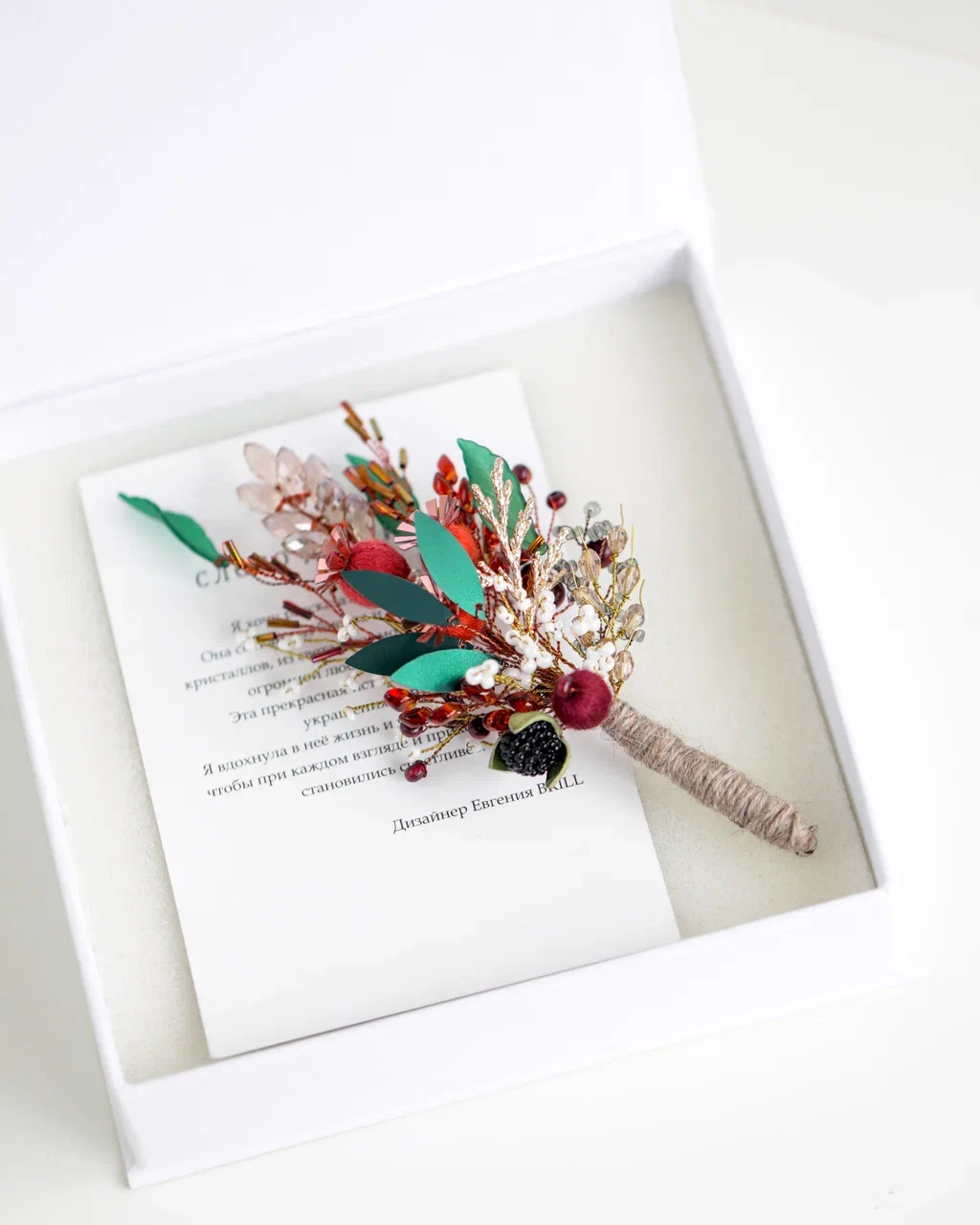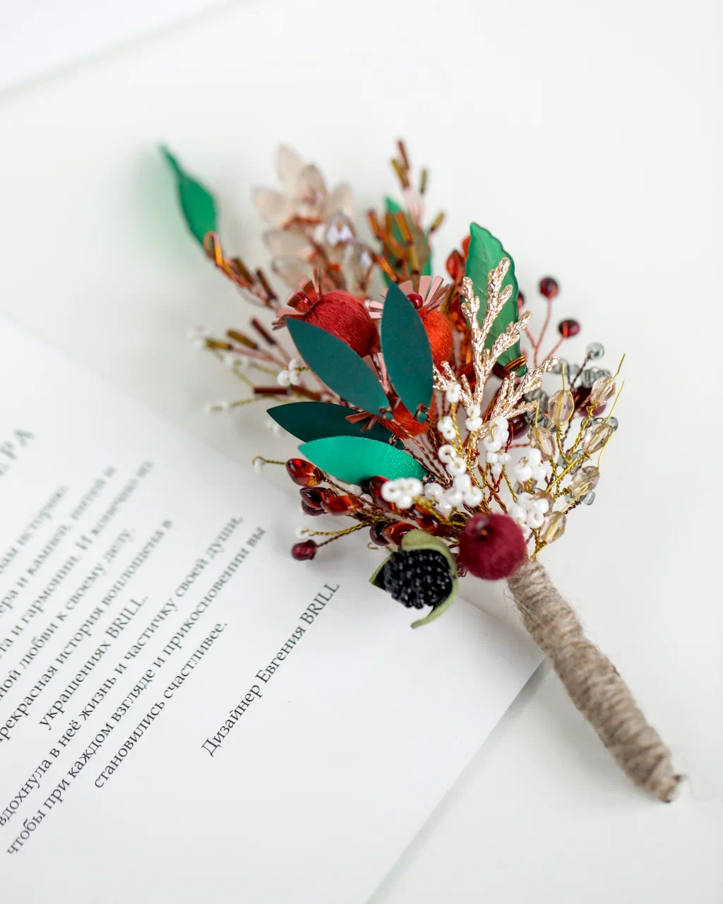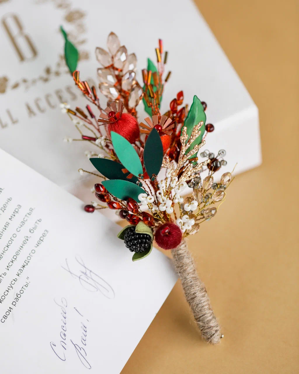 Брошь в виде восхитительного соцветия собрана из ассорти спелых ягод, веточек, листочков и хрупких осенних цветов, которые впитали в себя все тепло лета!