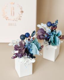 Фиолетовые, голубые и синие лепестки сплетаются в завораживающий градиент, напоминая о первых сумерках, когда небо окрашивается в самые таинственные оттенки. Прикоснитесь к ней — и вам почудится еле уловимый сладковатый запах самих космей.