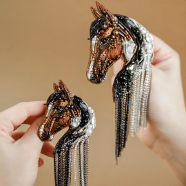 Её грациозный профиль, сплетённый из тёплых коричневых и глубоких чёрных оттенков, словно оживает на вашей одежде. Сверкающие стразовые цепочки, ниспадающие каскадом, напоминают развевающуюся гриву, добавляя образу динамики и лёгкости. Ролли – это не просто украшение, это история, рассказанная языком искусства, шёпот ветра в гриве и бег по бескрайним просторам. Взгляд притягивают мерцающие кристаллы в цапах, словно капли росы на рассвете.