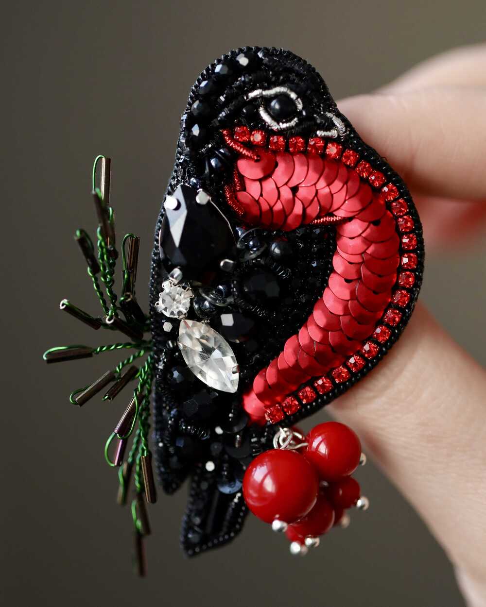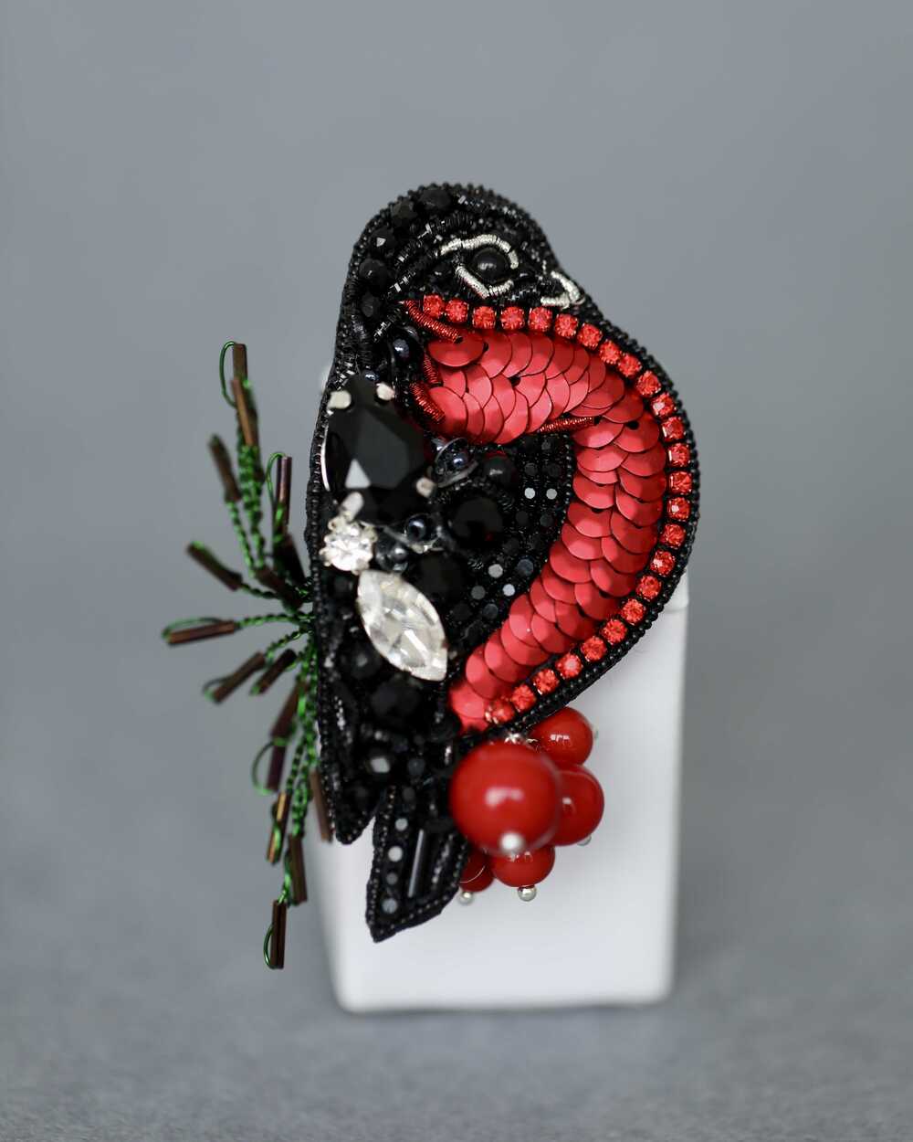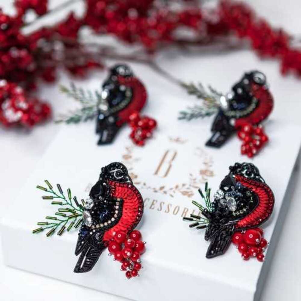 Брошь создана с использованием высококачественных материалов, включая сверкающие пайетки и кристаллы, которые придают изделию блеск и сияние. Брошь «Снегирь» можно носить с пальто, свитерами, платьями или даже использовать как украшение для сумки.