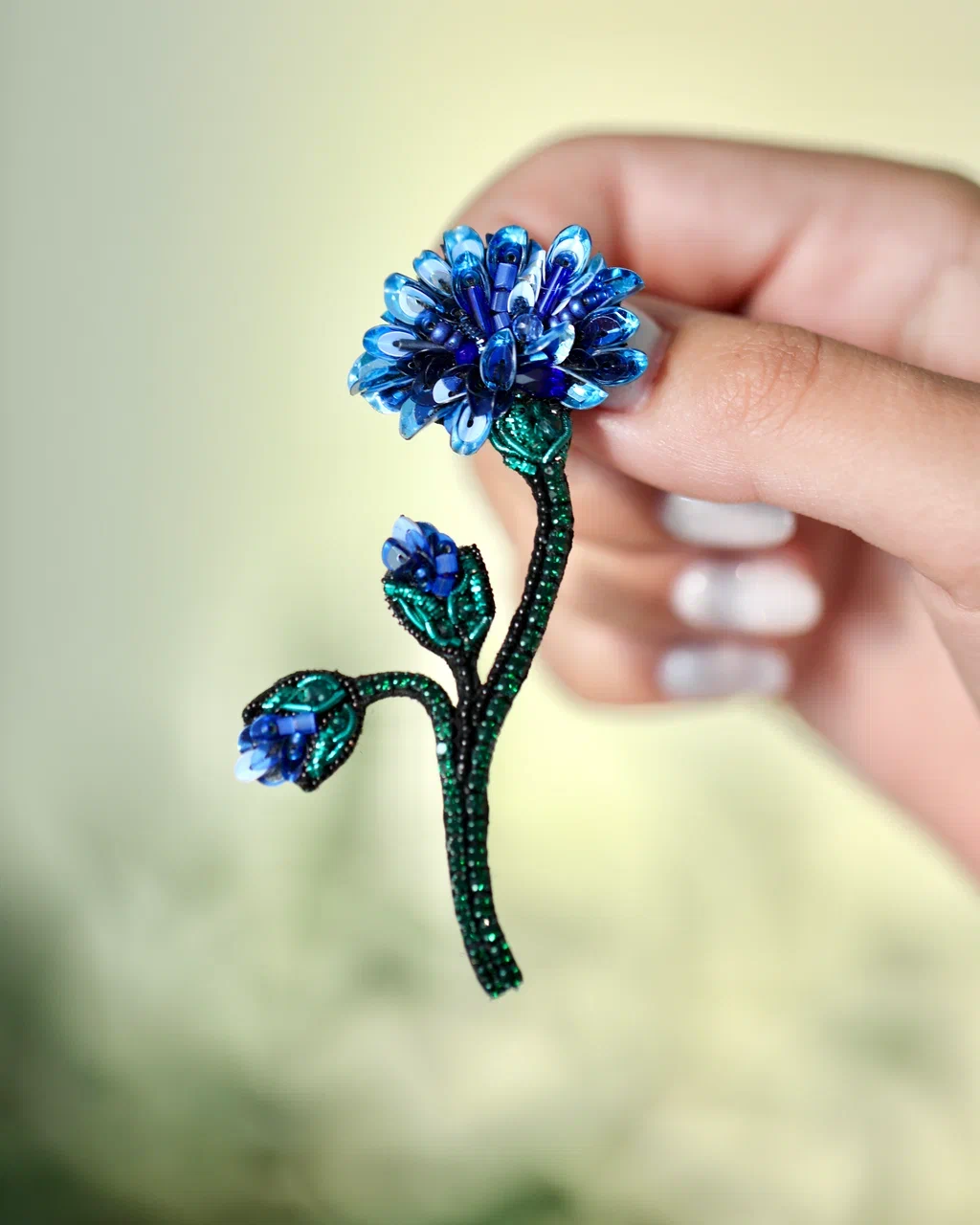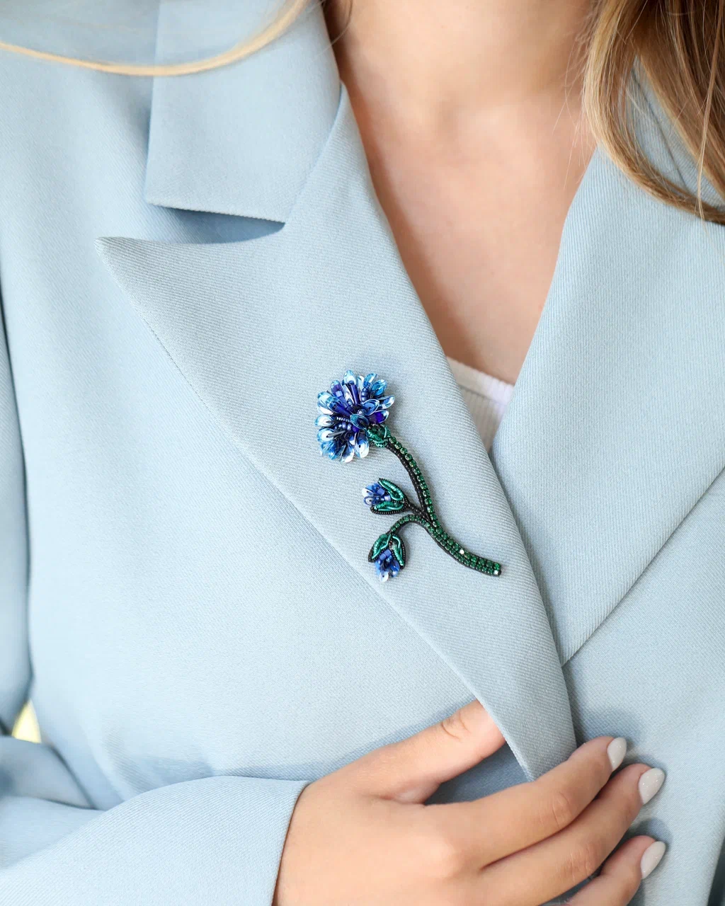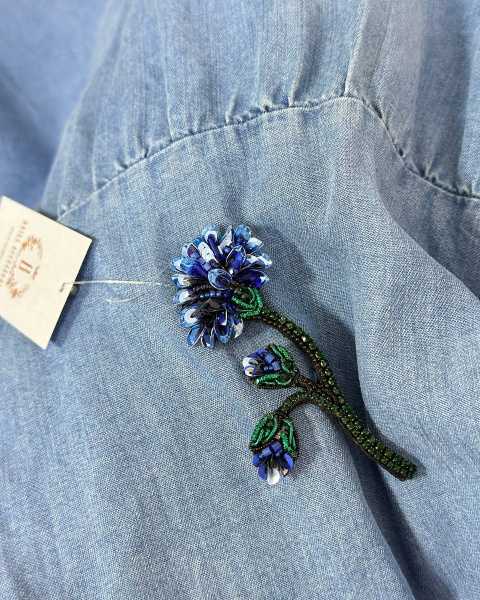 Каждая деталь броши – это ода природе. Лёгкие, изящные линии подчёркивают форму цветка, а глубокий синий оттенок, словно лепестки настоящего василька, переливается при каждом движении, отражая свет и притягивая взгляды.