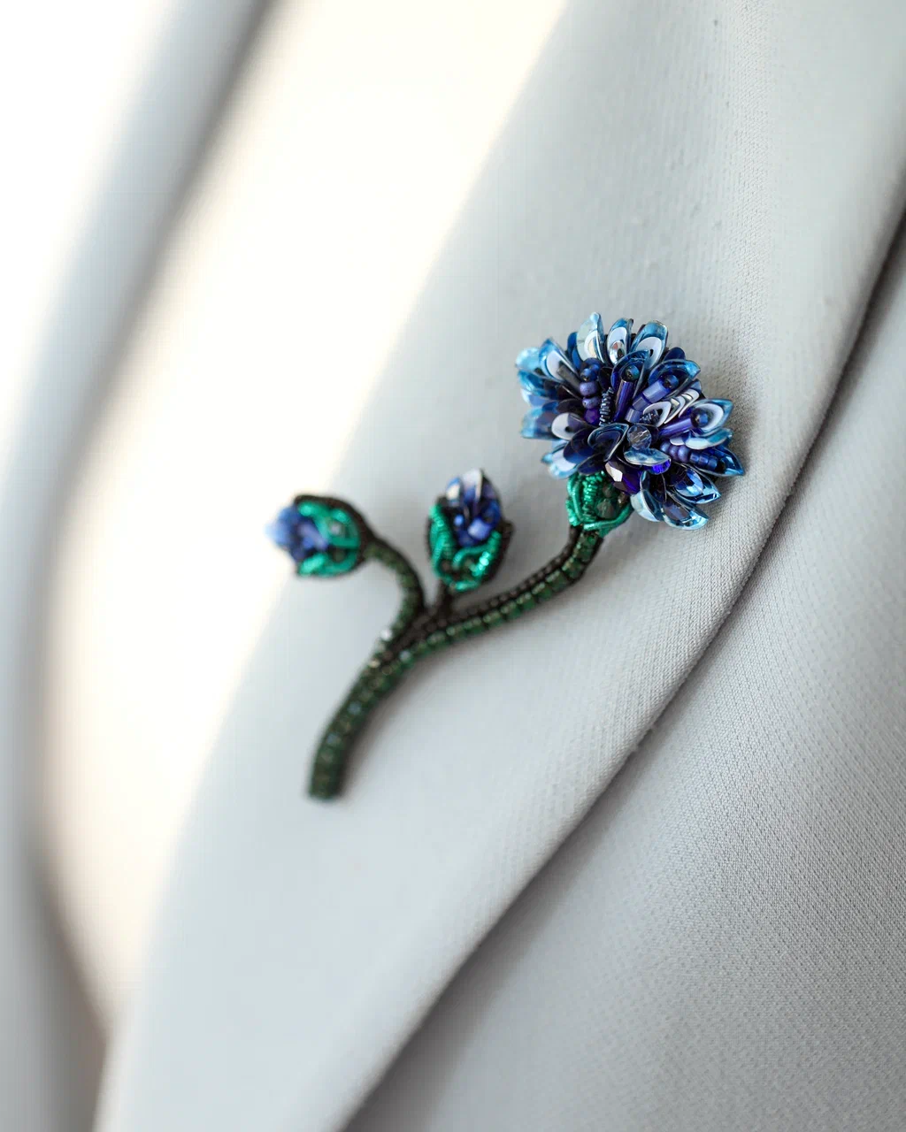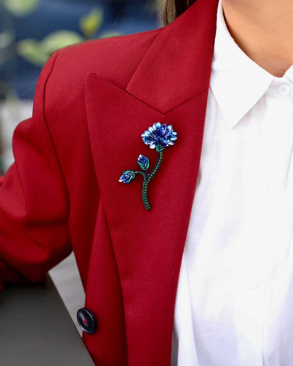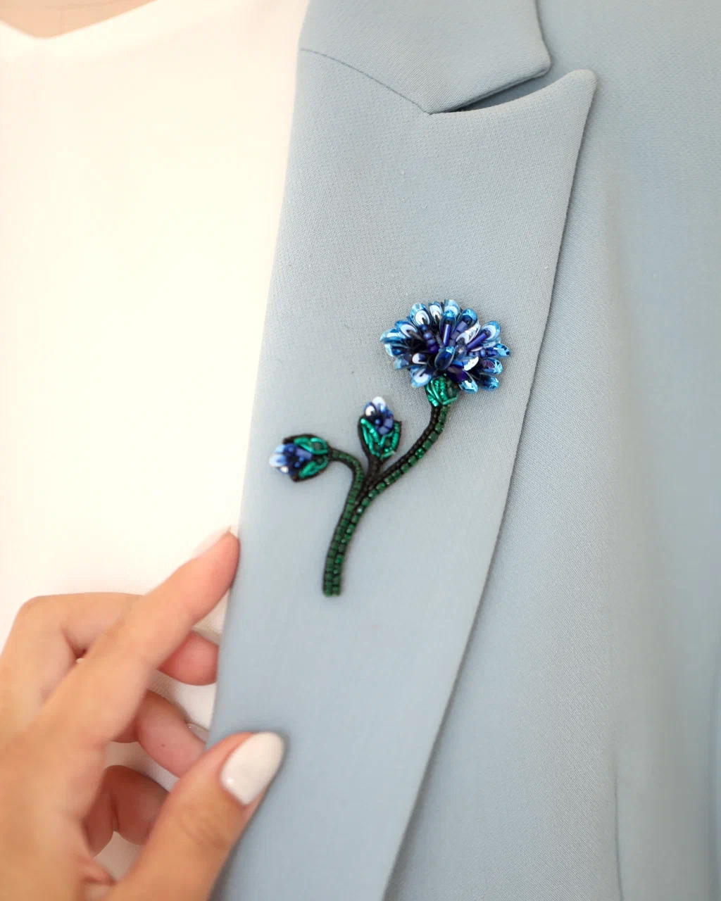 Каждая деталь броши – это ода природе. Лёгкие, изящные линии подчёркивают форму цветка, а глубокий синий оттенок, словно лепестки настоящего василька, переливается при каждом движении, отражая свет и притягивая взгляды.