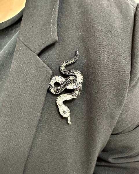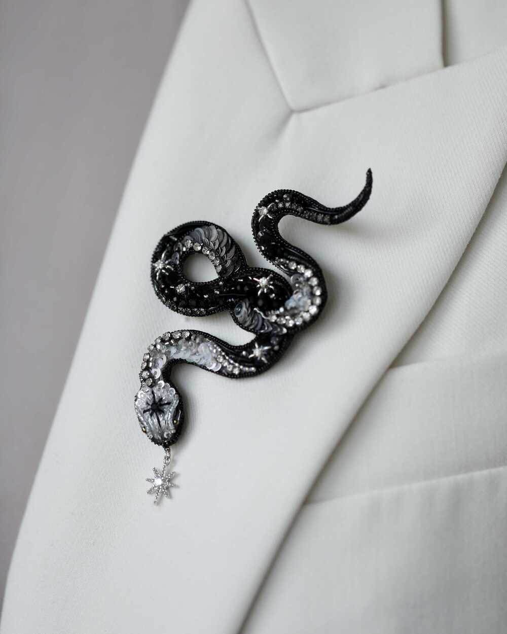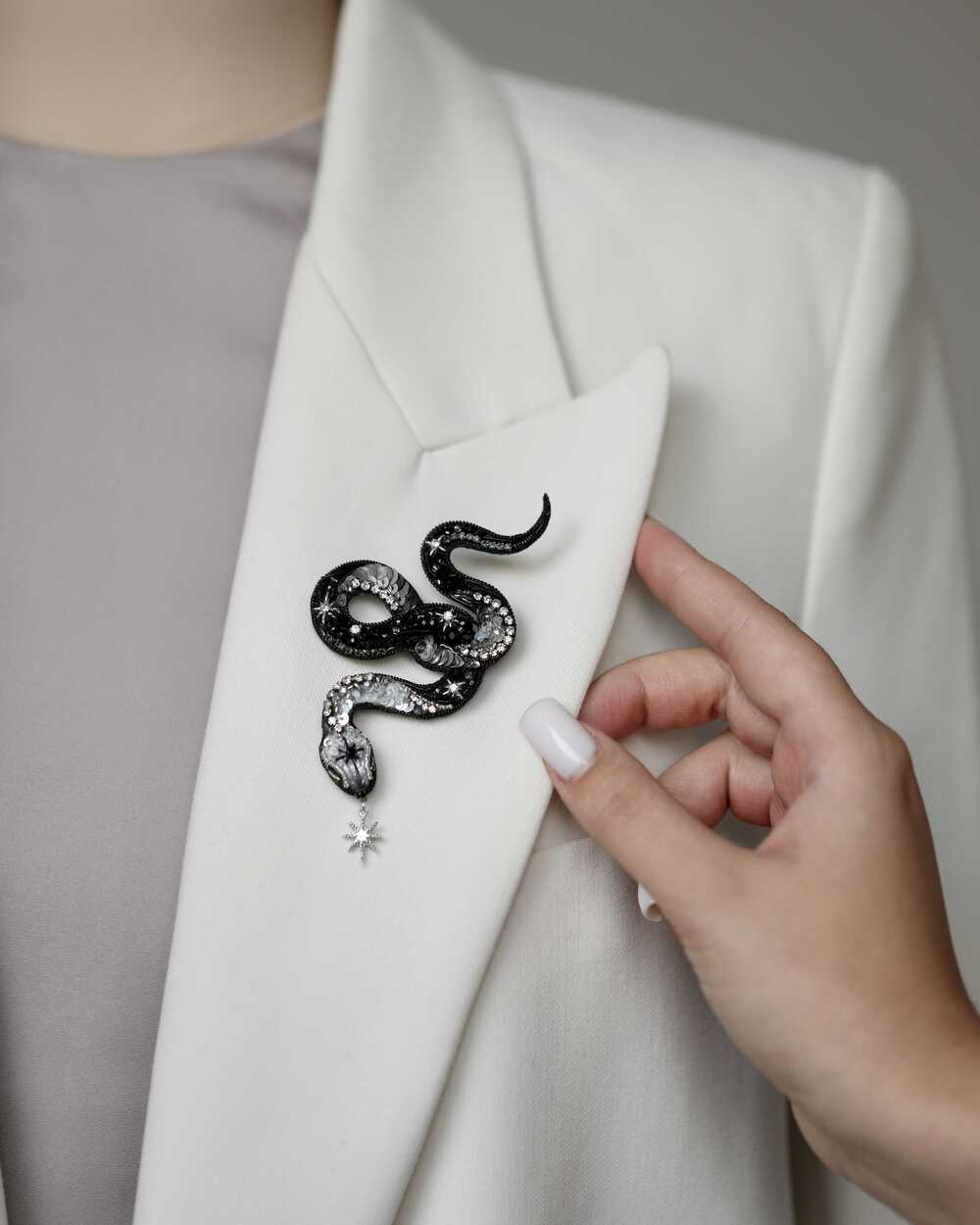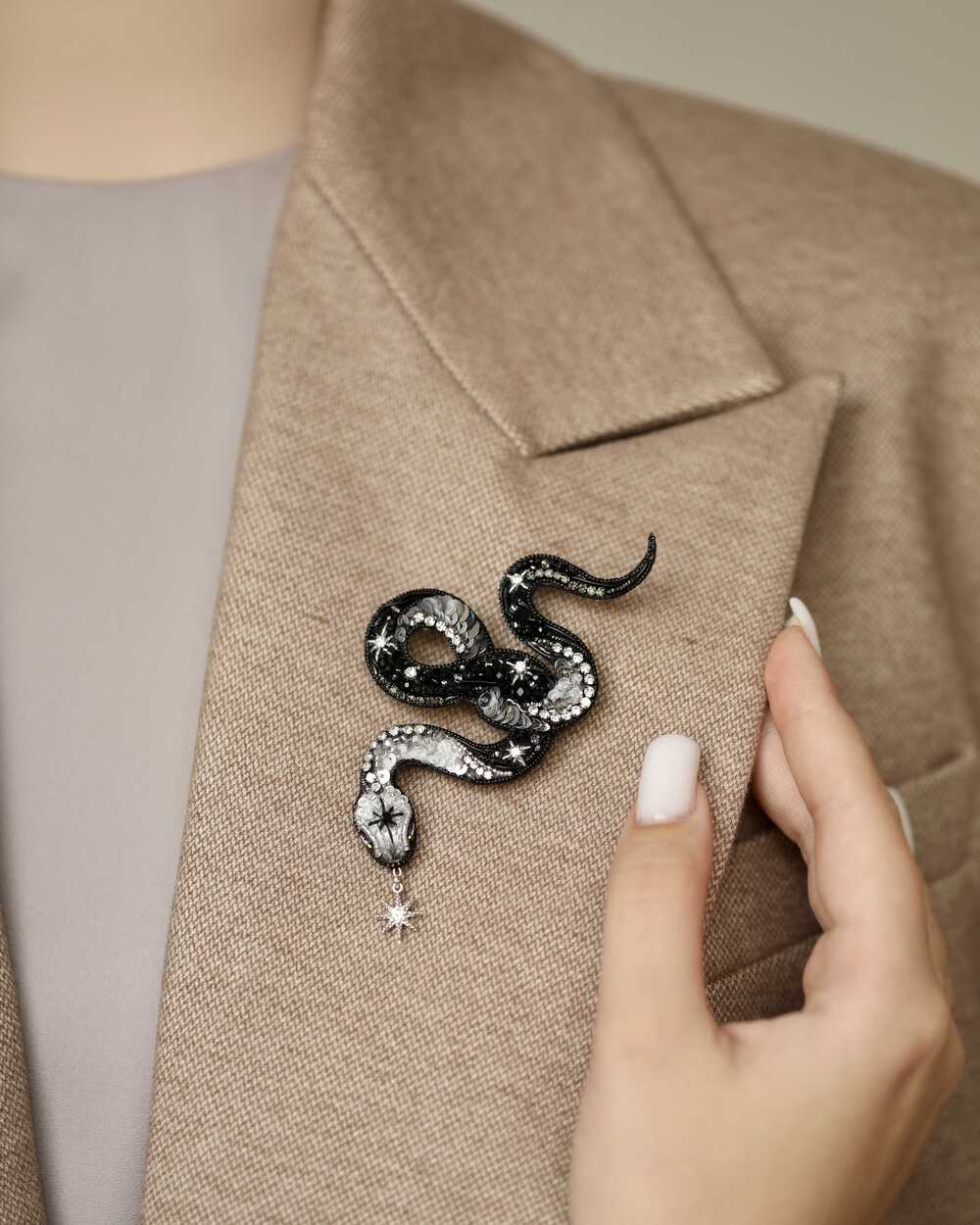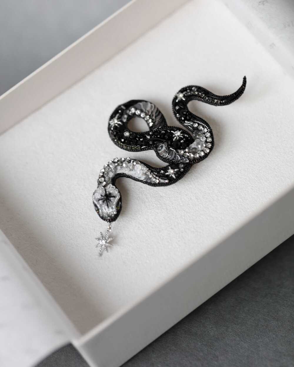 Эта брошь —символ трансформации и перерождения, который принесёт удачу и защиту своему обладателю. Черные и серебристые оттенки создают контраст и подчёркивают загадочную красоту змеи, а подвеска в виде сверкающей звезды добавляет изделию лёгкость и утончённость.