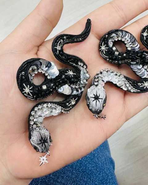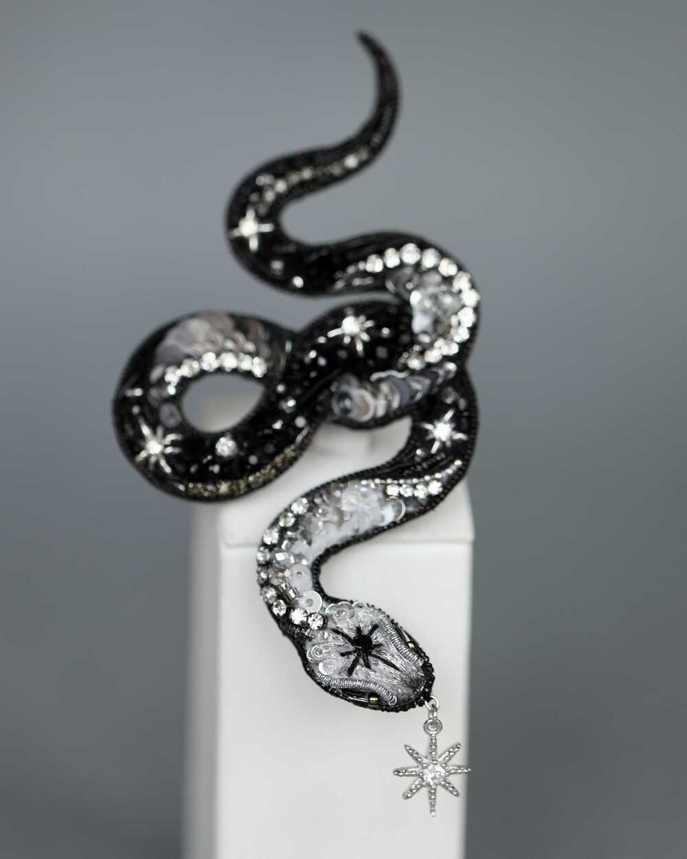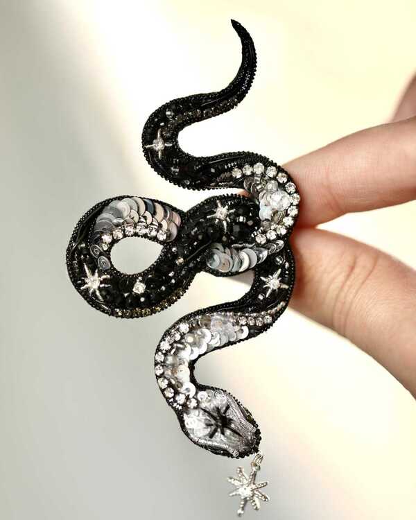 Изящно изгибающаяся змея украшена мерцающими бусинами из чешского стекла и блестящими французскими пайетками, словно соткана из ночного неба, усеянного звёздами. Звёздные акценты на её теле напоминают о созвездиях, придавая ощущение космической гармонии и бесконечной мудрости.