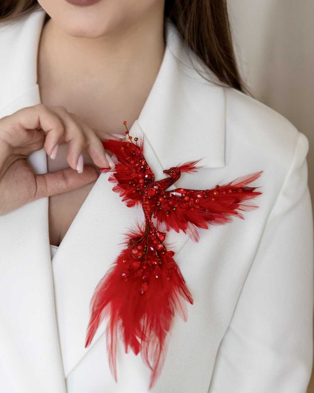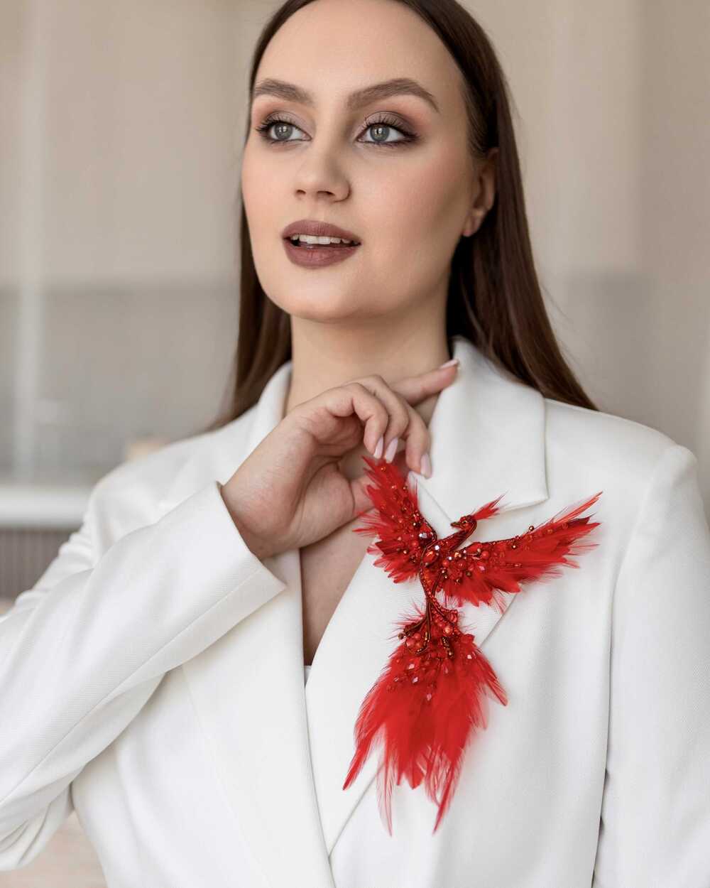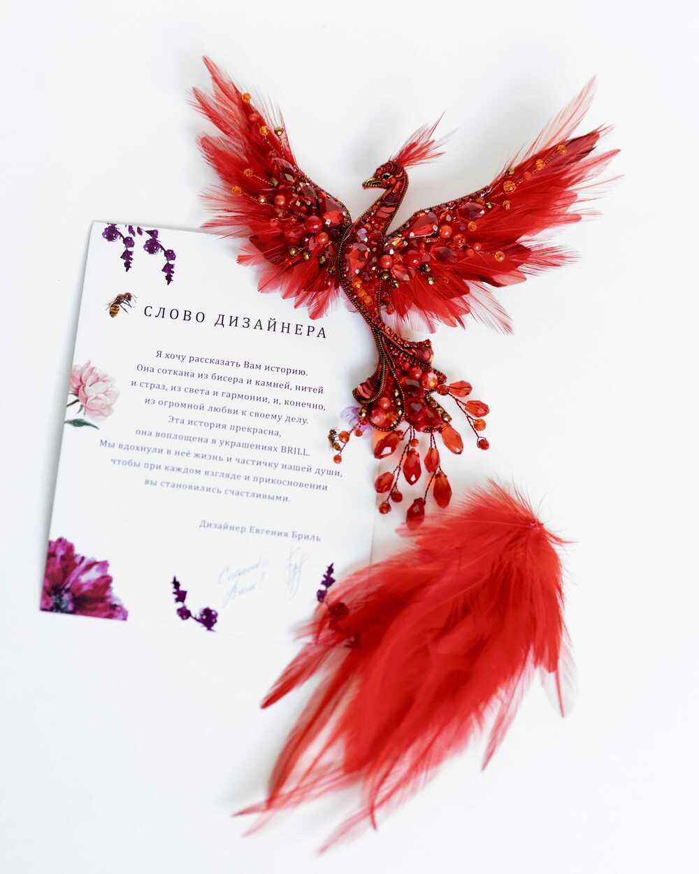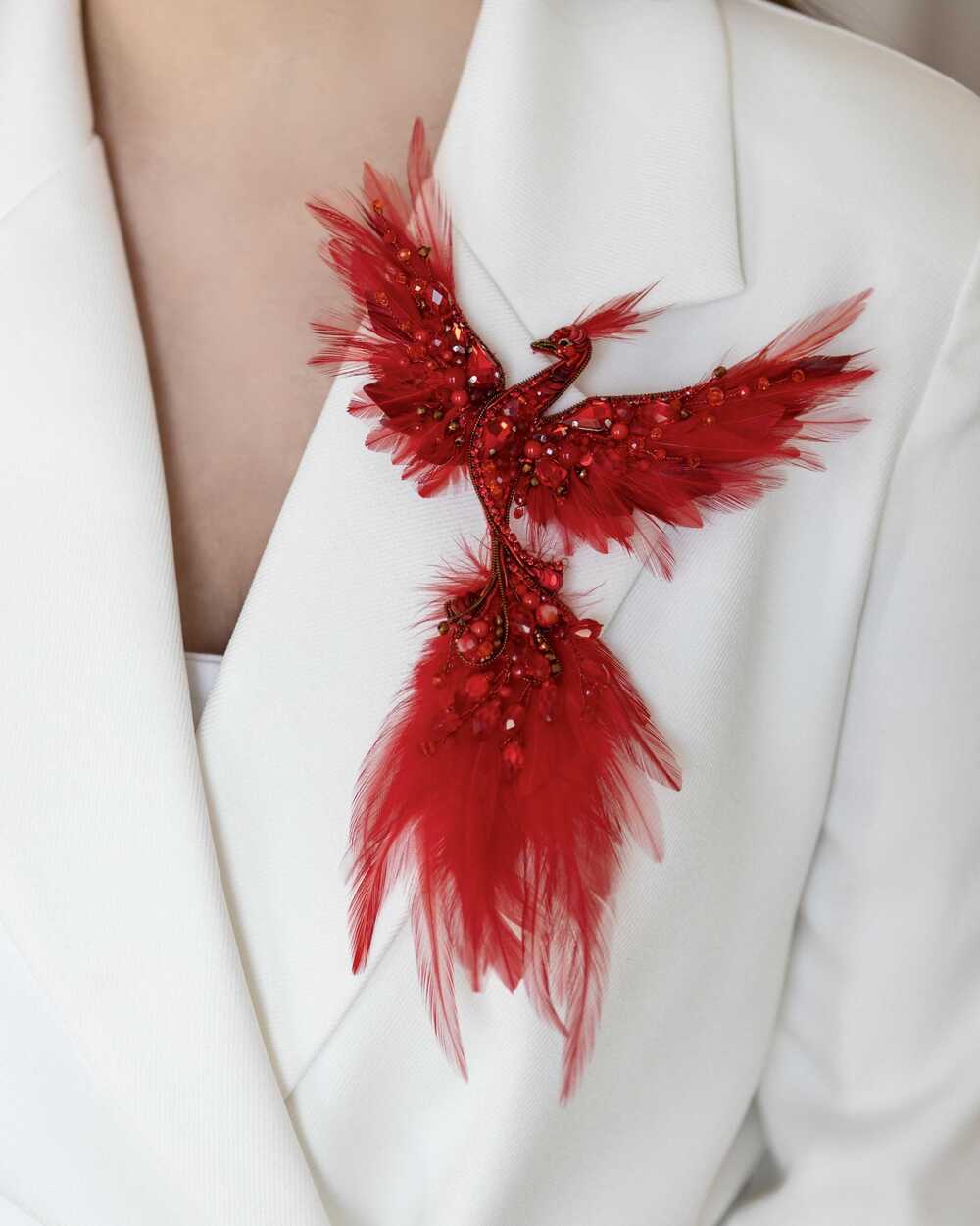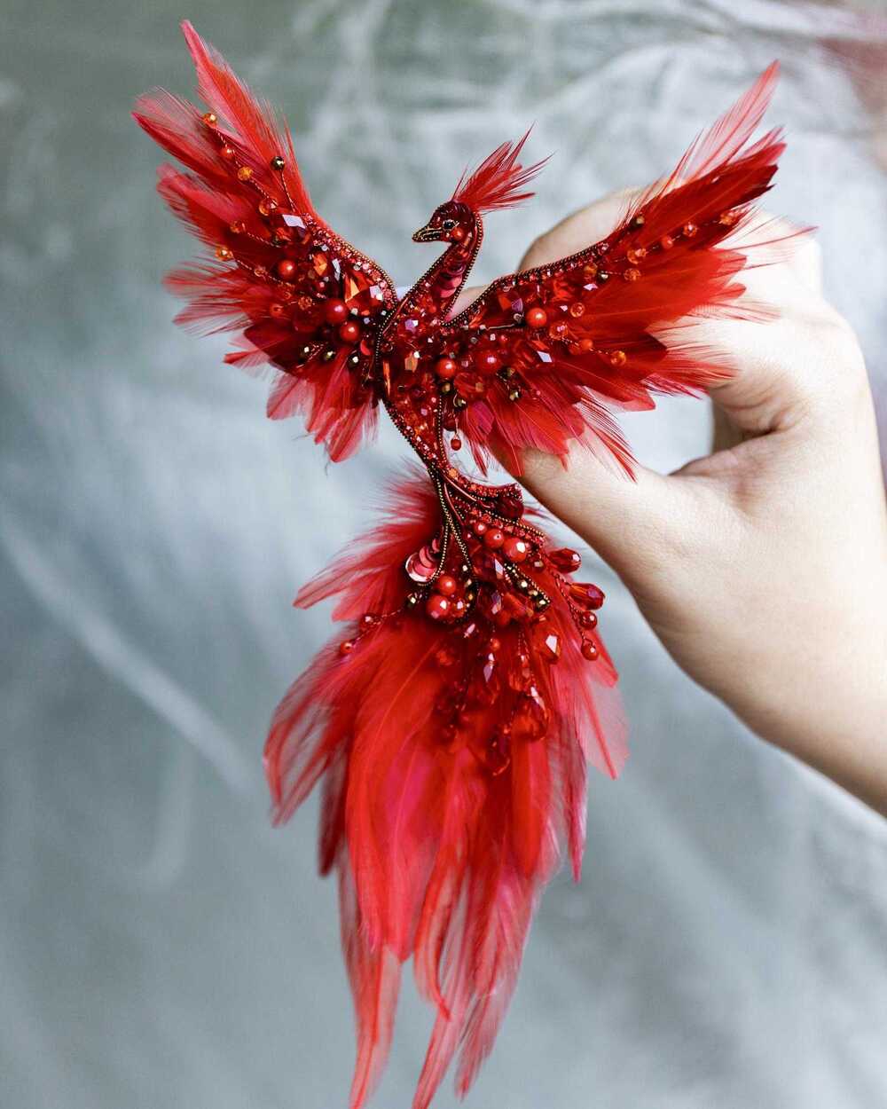 Уникальная брошь «Жар-птица», выполненная в ярких красных оттенках, которые словно горят огнем. Эта брошь – воплощение мифического существа, символа красоты, удачи и исполнения желаний.