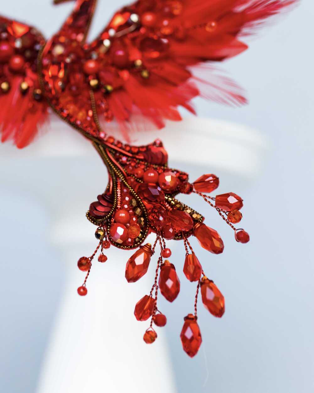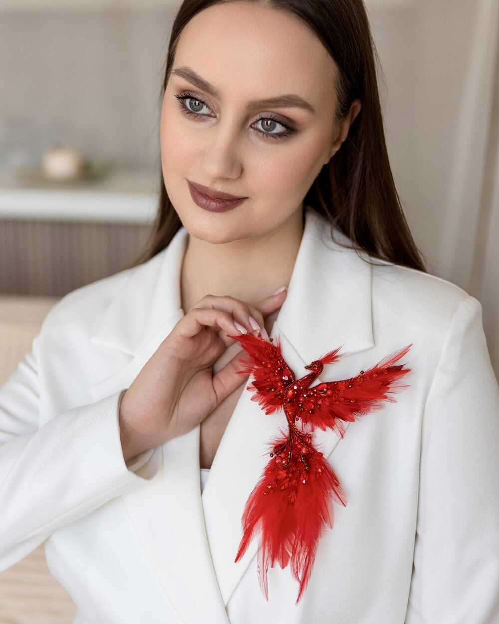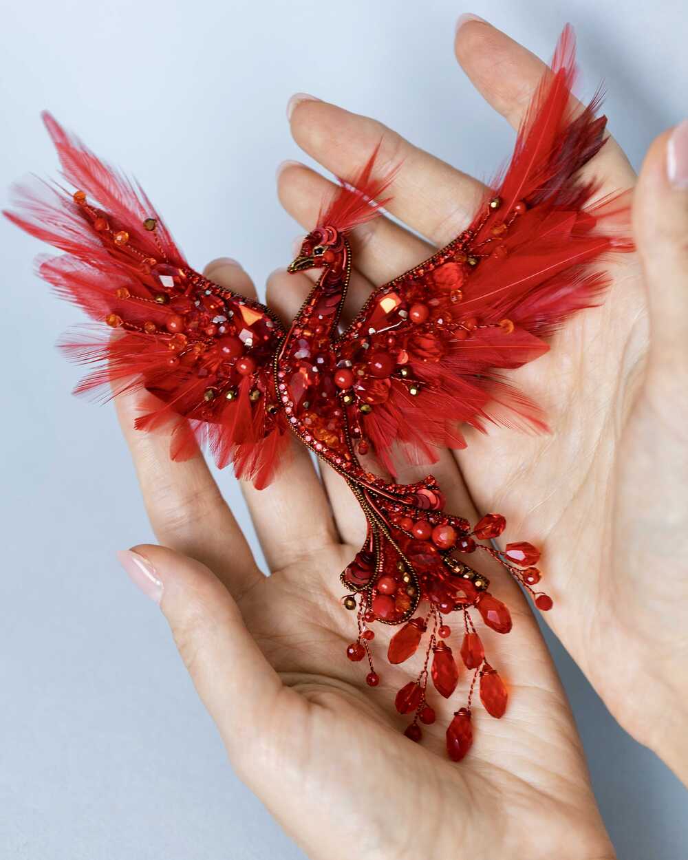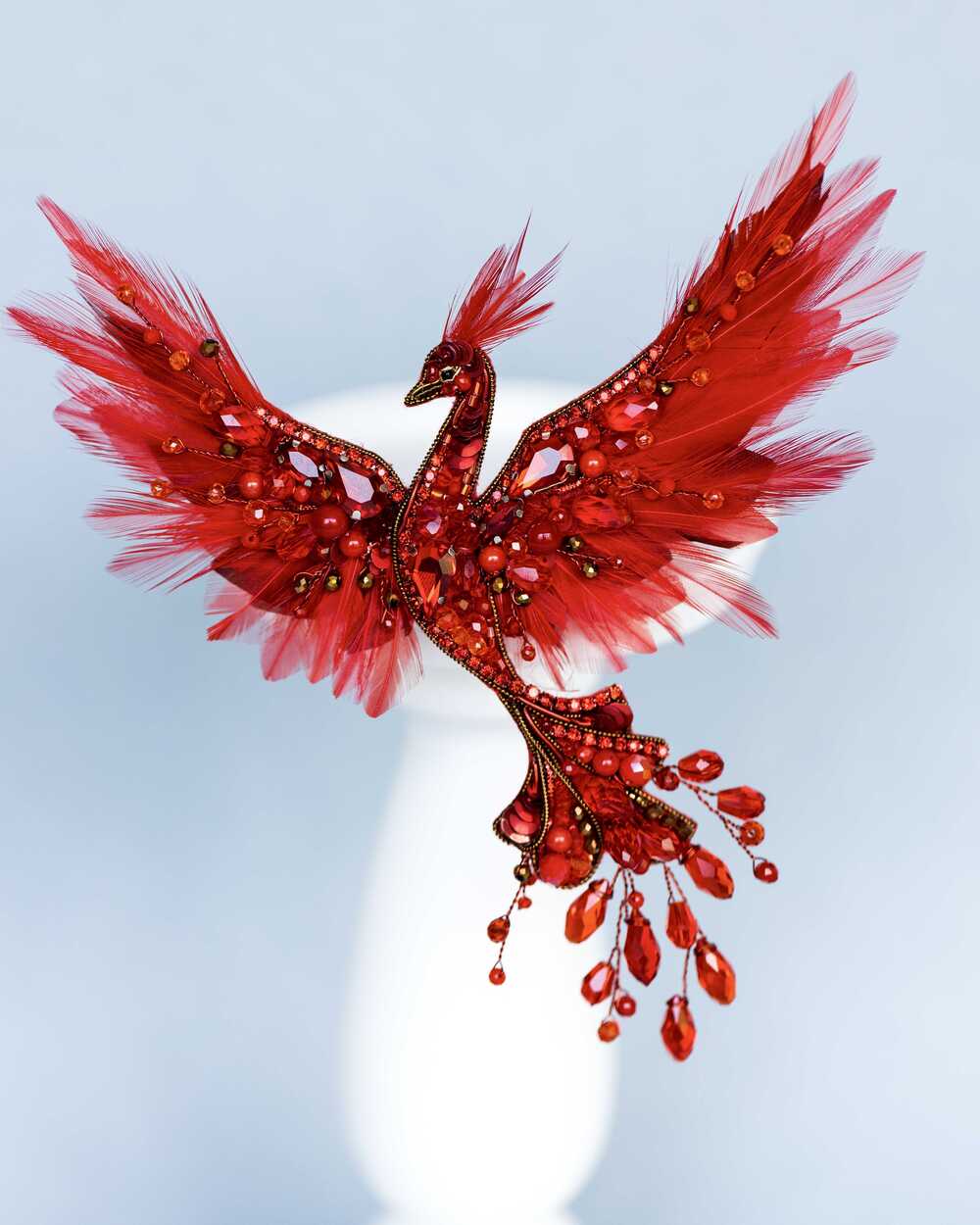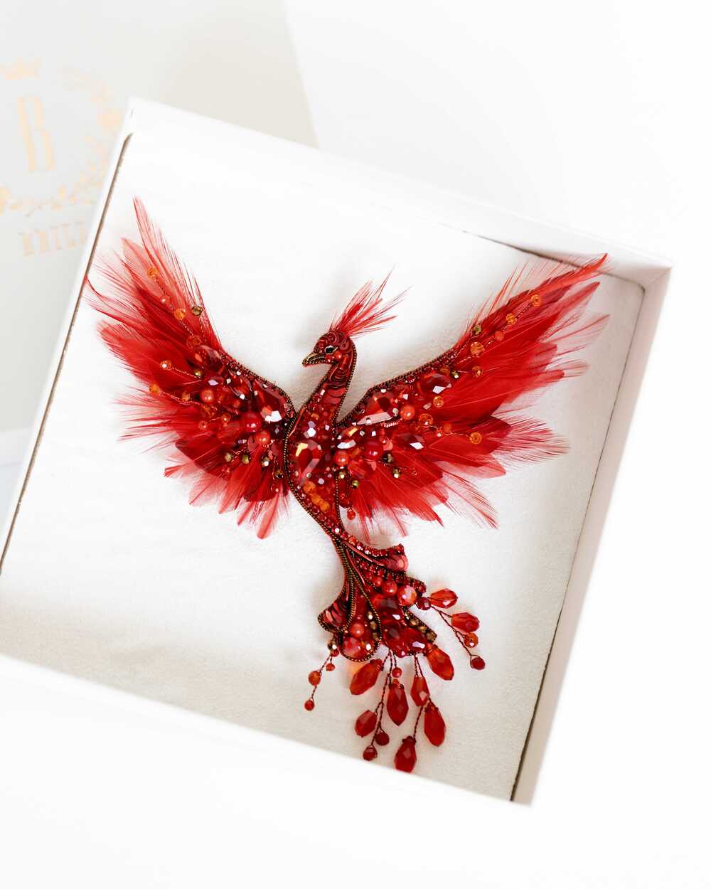 Уникальная брошь «Жар-птица», выполненная в ярких красных оттенках, которые словно горят огнем. Эта брошь – воплощение мифического существа, символа красоты, удачи и исполнения желаний.