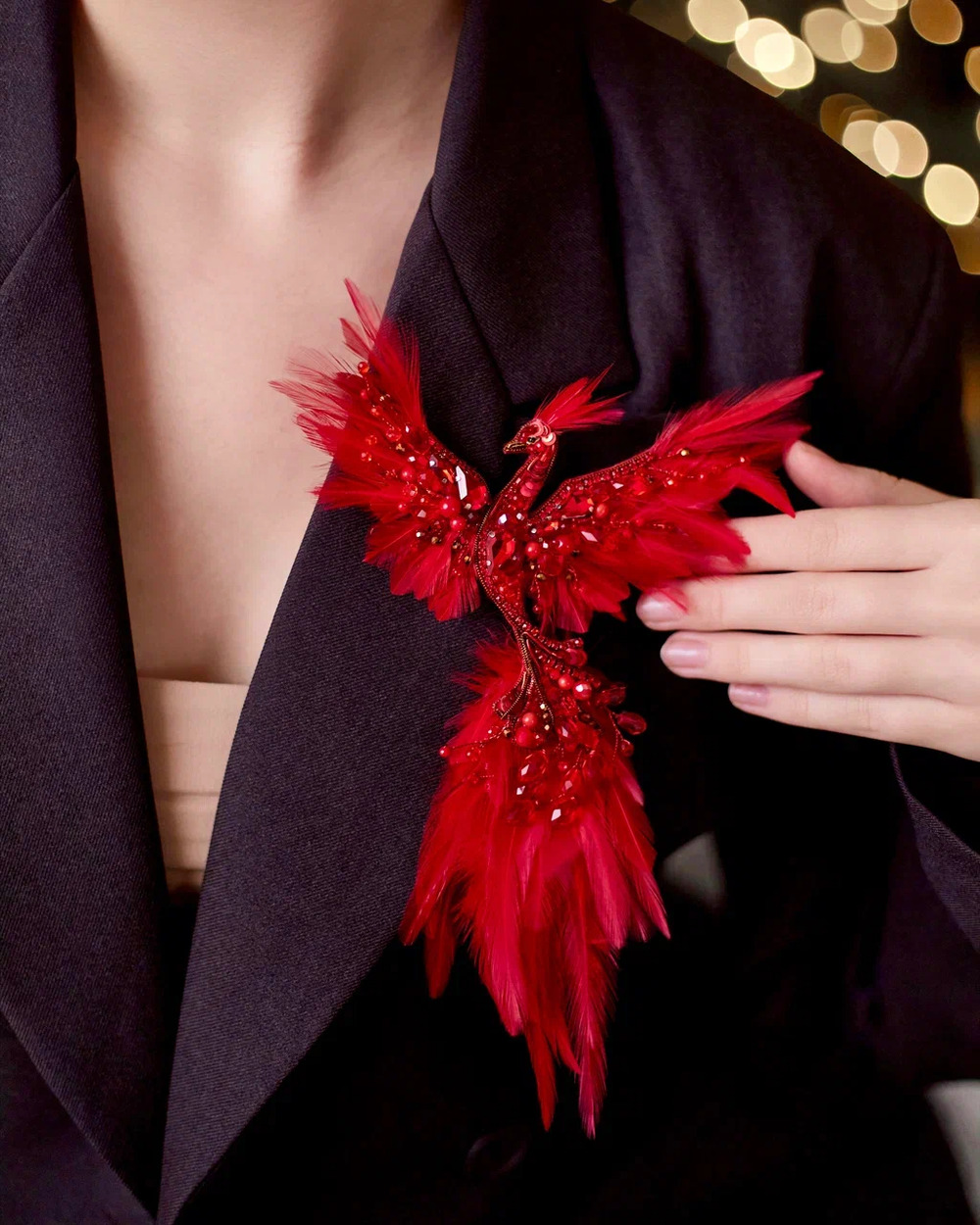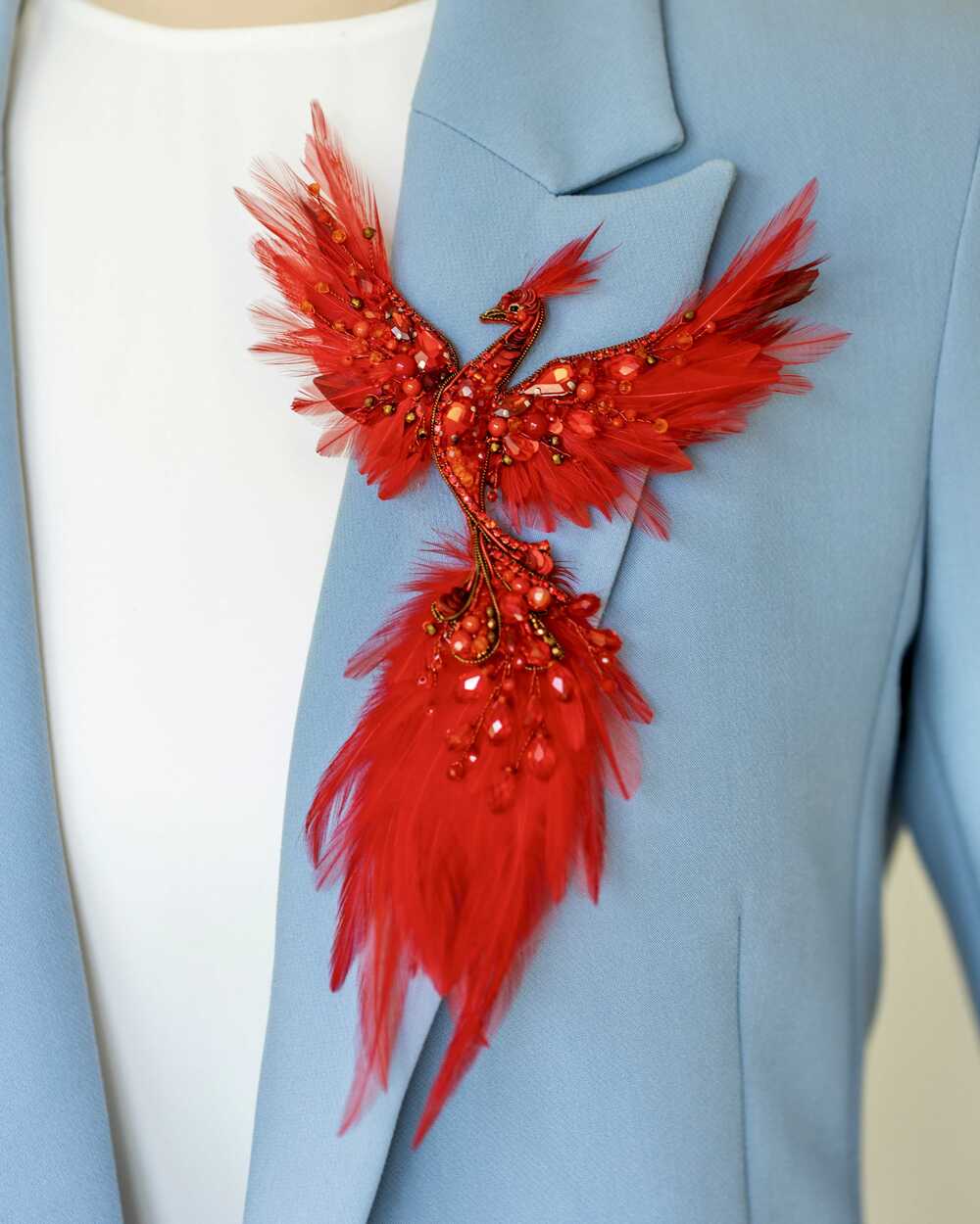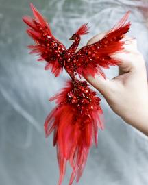 Изящно очерченные контуры Жар-птицы переливаются огненными красками, словно её перья освещены внутренним светом. Каждая деталь тщательно проработана, чтобы передать всю магическую силу этого легендарного создания. Красный цвет символизирует страсть, энергию и жизненную силу, делая брошь настоящим акцентом любого образа.