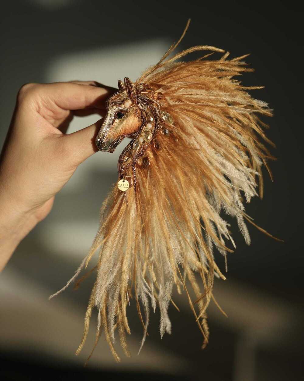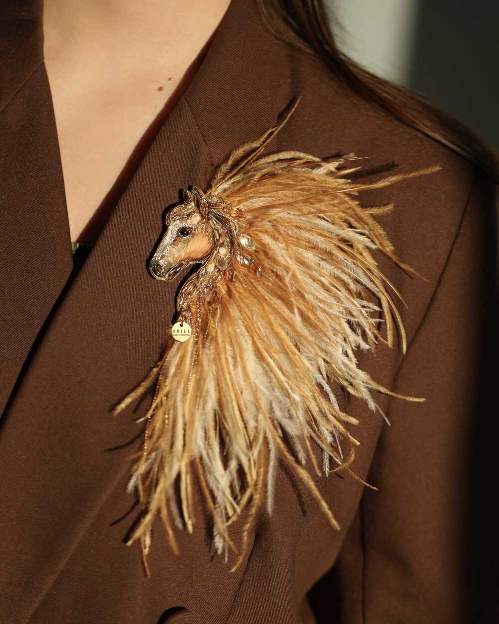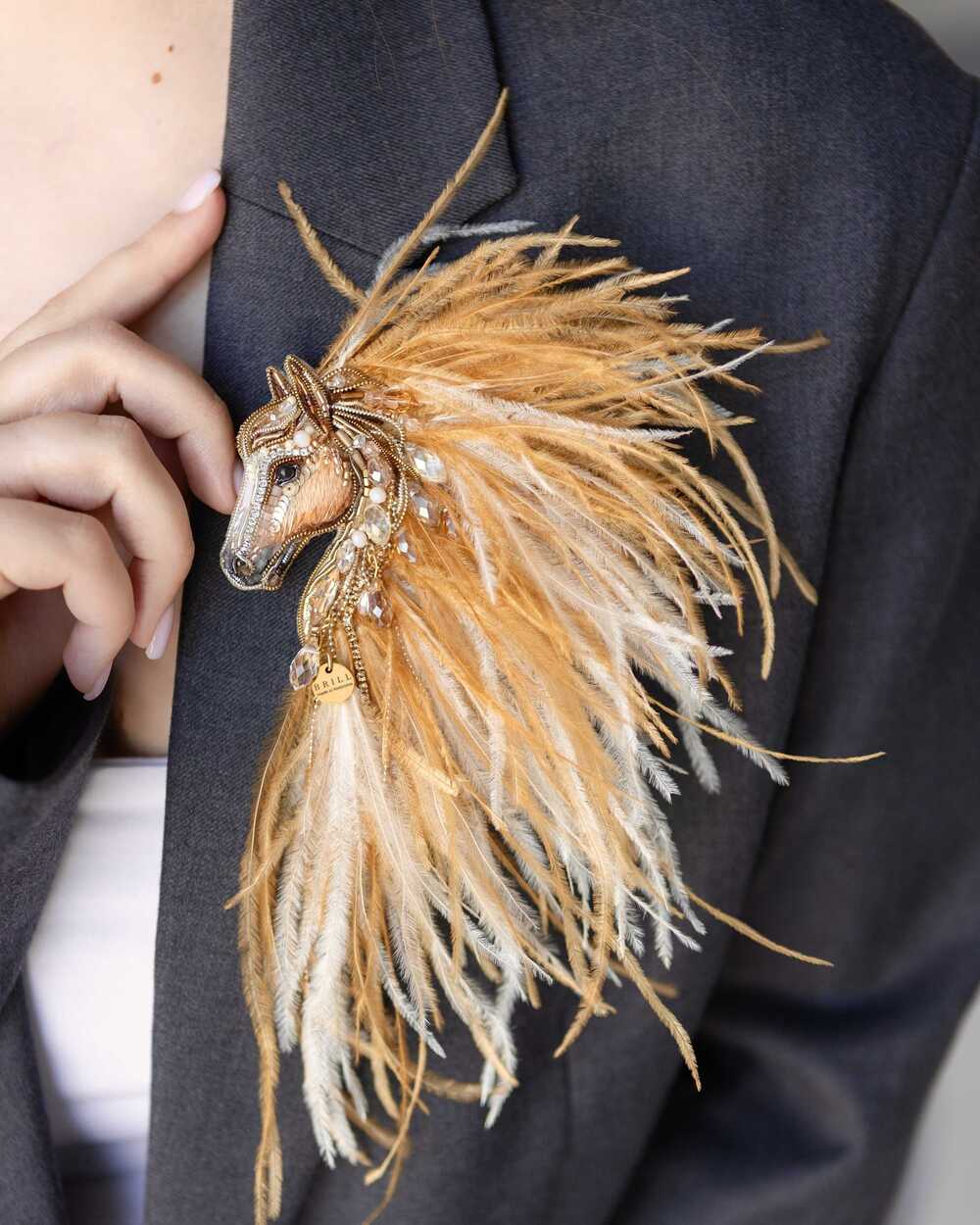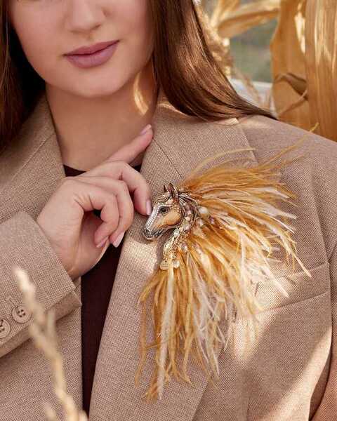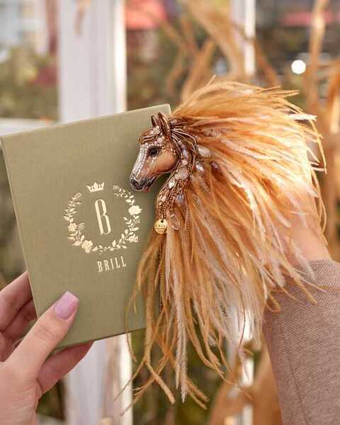 Истинная магия броши «Лошадки Искры» раскрывается в ее роскошной гриве, которую мы создали из карамельных и золотых перьев. Они добавляют броши глубину цвета и легкую динамику, создавая ощущение движения, словно сам ветер зарылся в ее гриве и вместе с ней спешит навстречу свободе.
