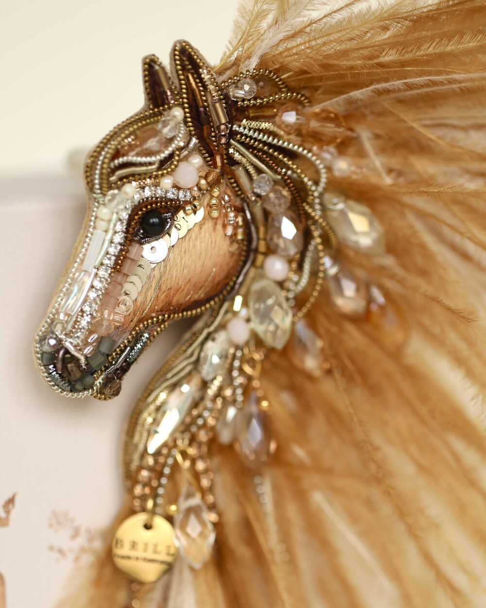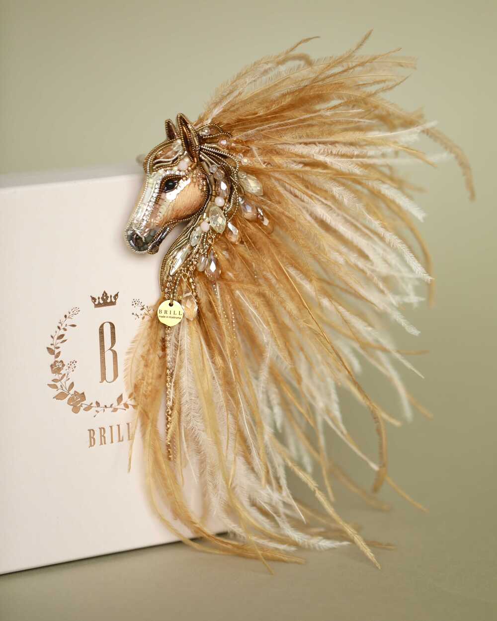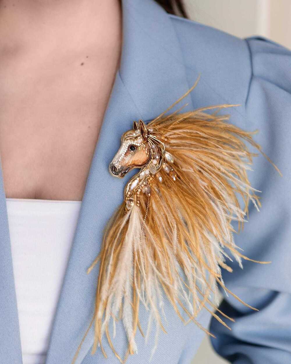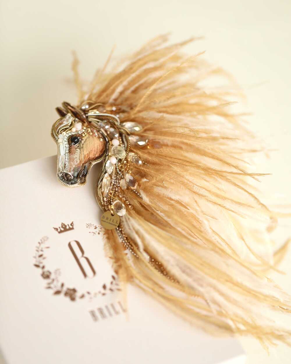 Истинная магия броши «Лошадки Искры» раскрывается в ее роскошной гриве, которую мы создали из карамельных и золотых перьев. Они добавляют броши глубину цвета и легкую динамику, создавая ощущение движения, словно сам ветер зарылся в ее гриве и вместе с ней спешит навстречу свободе.