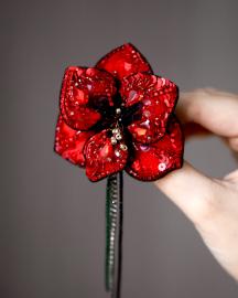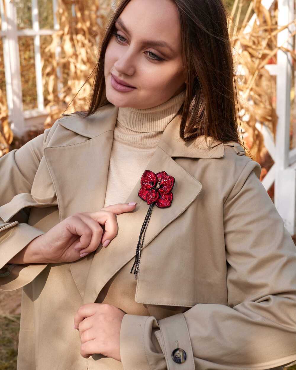 Каждый лепесток броши тщательно проработан: лепестки словно оживают благодаря изящной форме и переходам оттенков – от глубокого бордового до ярко красного, с лёгкими акцентами золотистого сияния в середине.