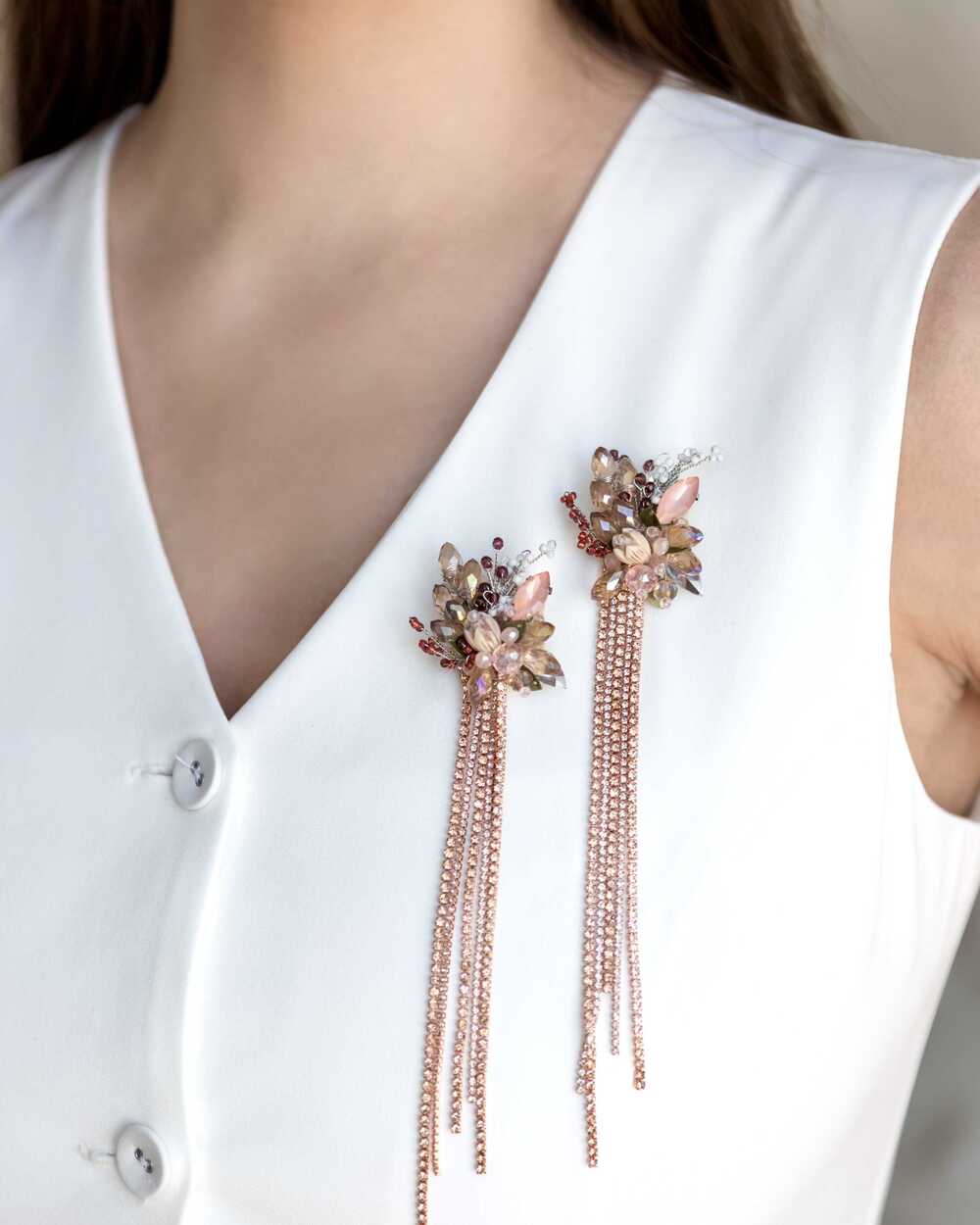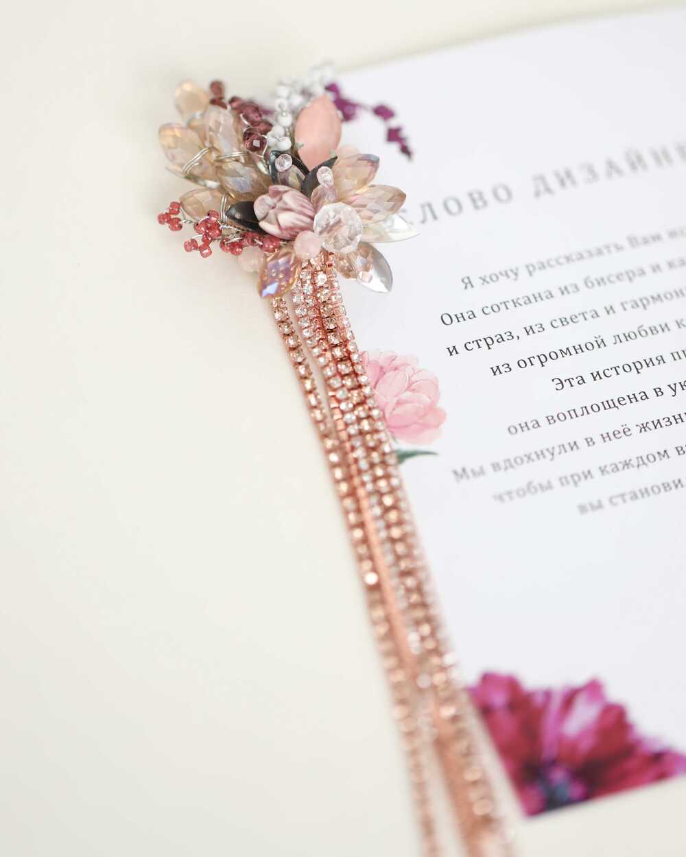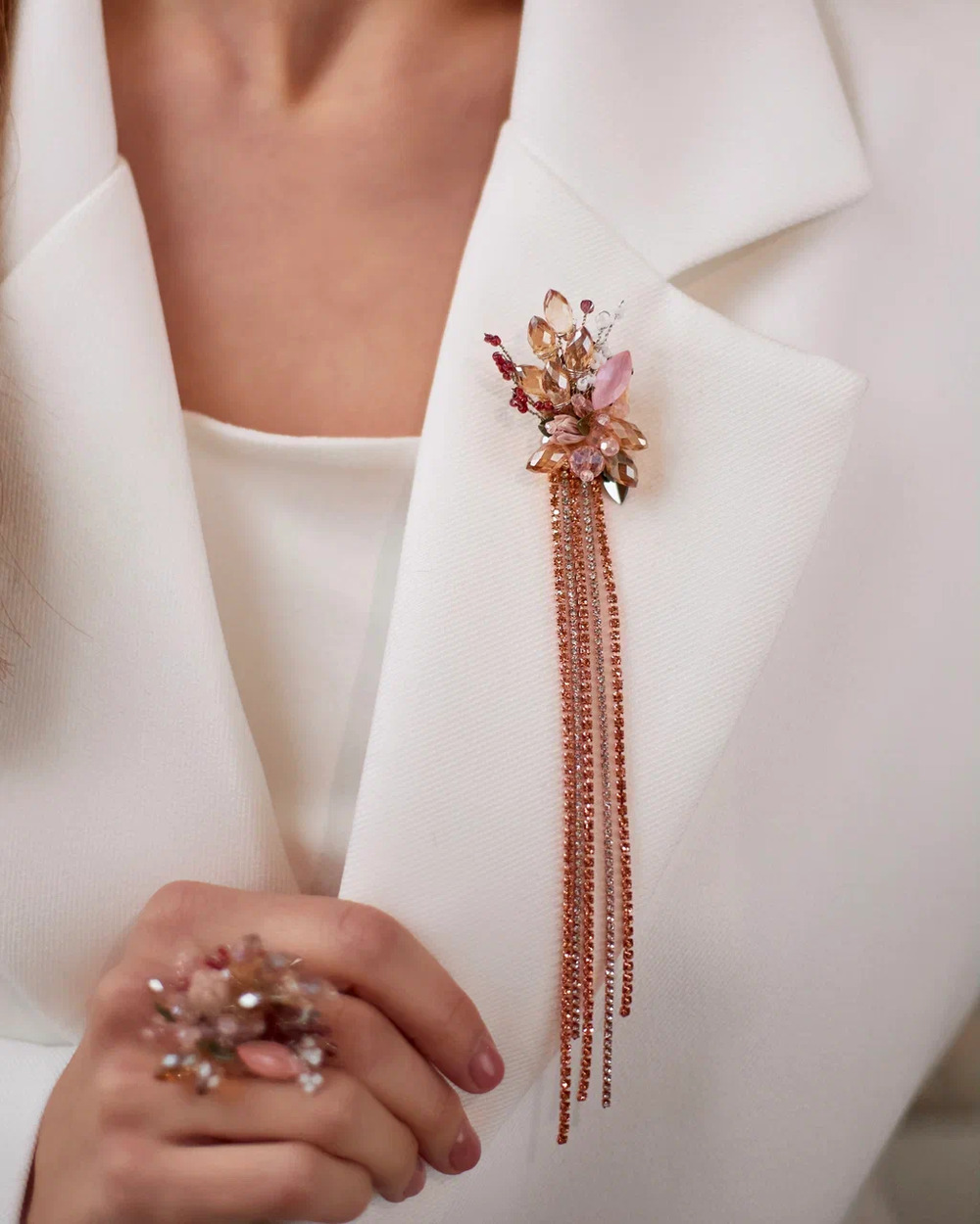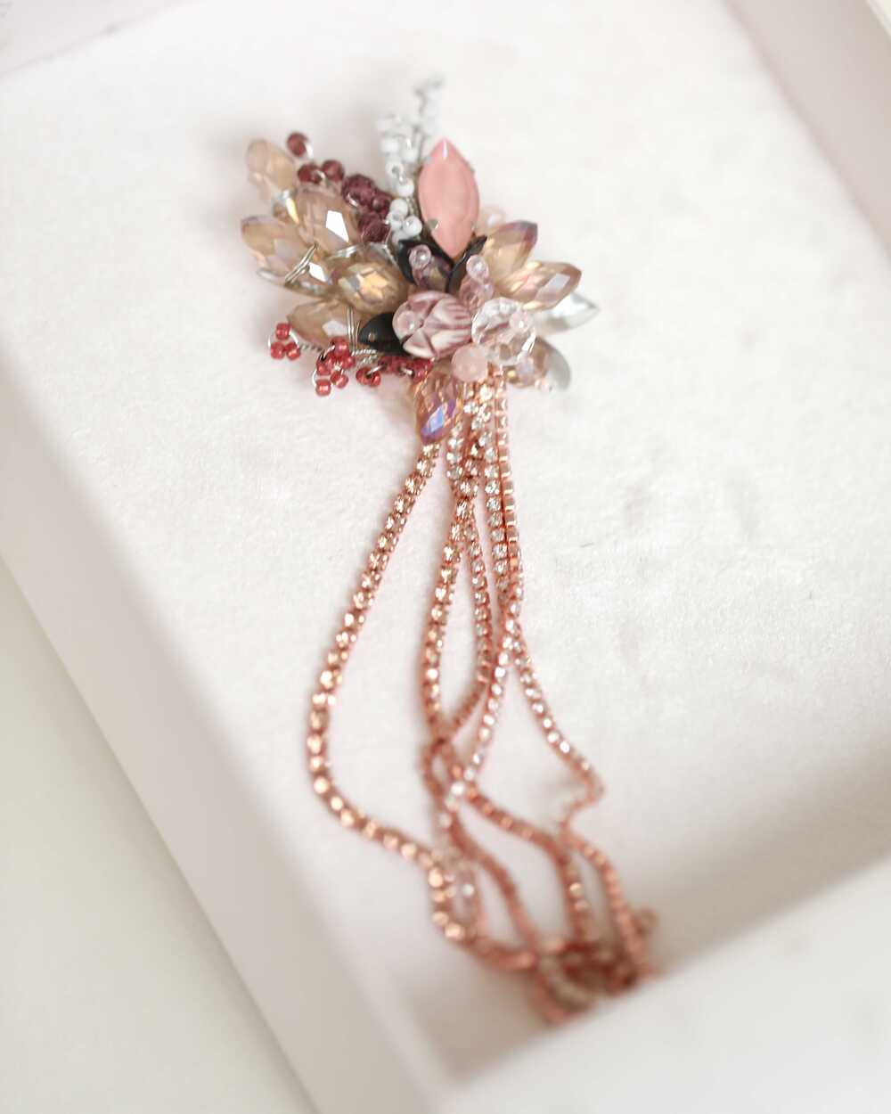 Дизайн броши вдохновлен нежными изгибами цветочных лепестков и мягкими линиями природы. Центральный элемент украшения – сияющий кристалл, который переливается при каждом движении, словно капля росы на лепестке.