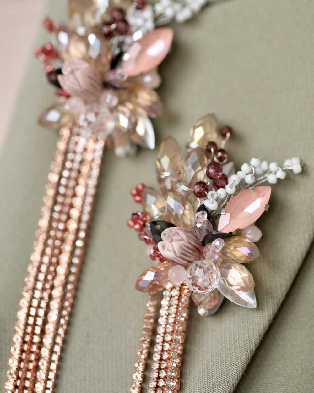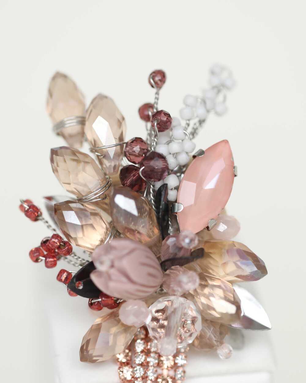 бусины из чешского стекла разного размера и формы, чешский стеклянный бисер, кубический цирконий в цапах, стразовые цепочки, цветок из муранского стекла, французские пайетки, застежка-булавка с родированнным покрытием, граненые хрустальные бусины, итальянский фетр, брендовая бирка