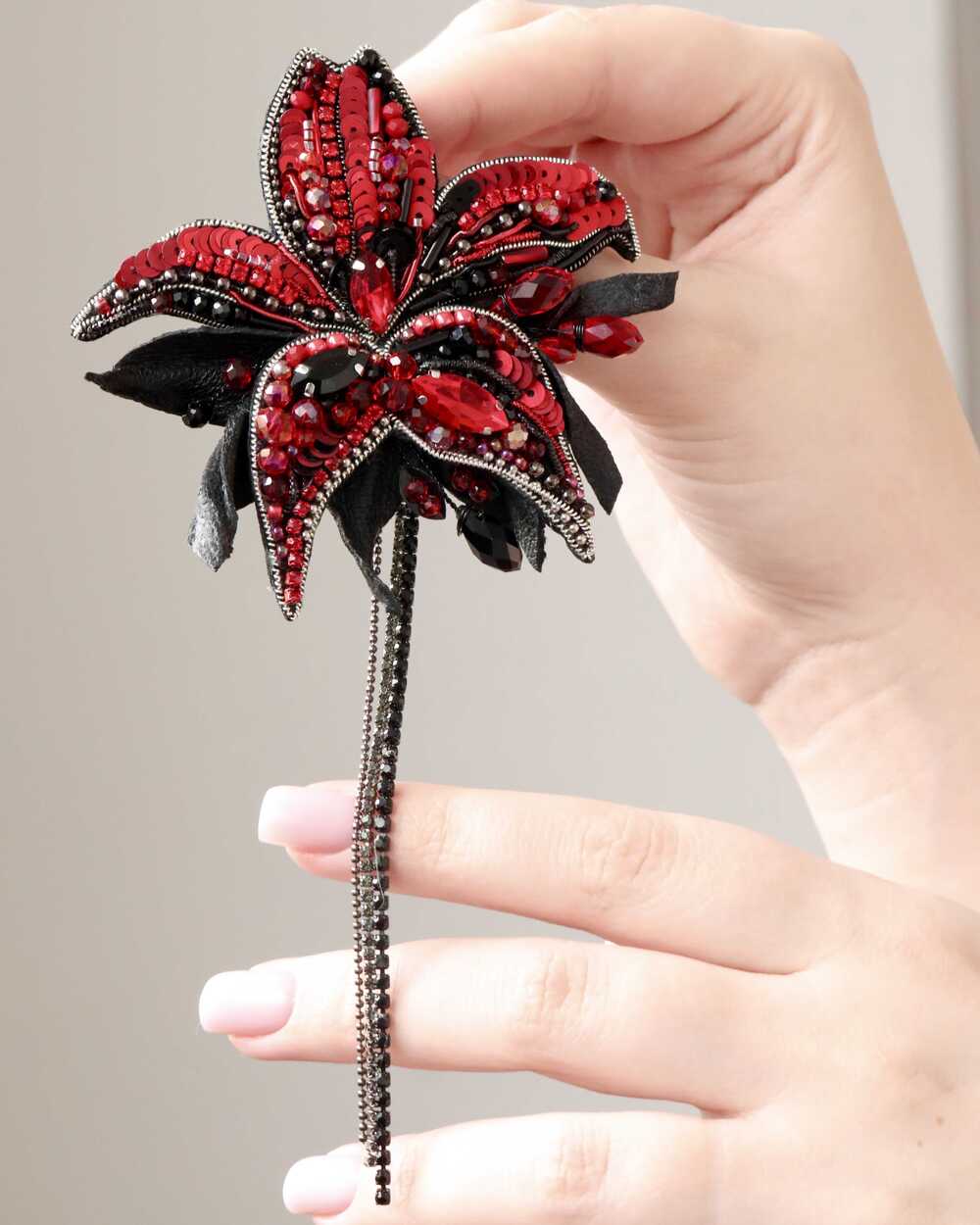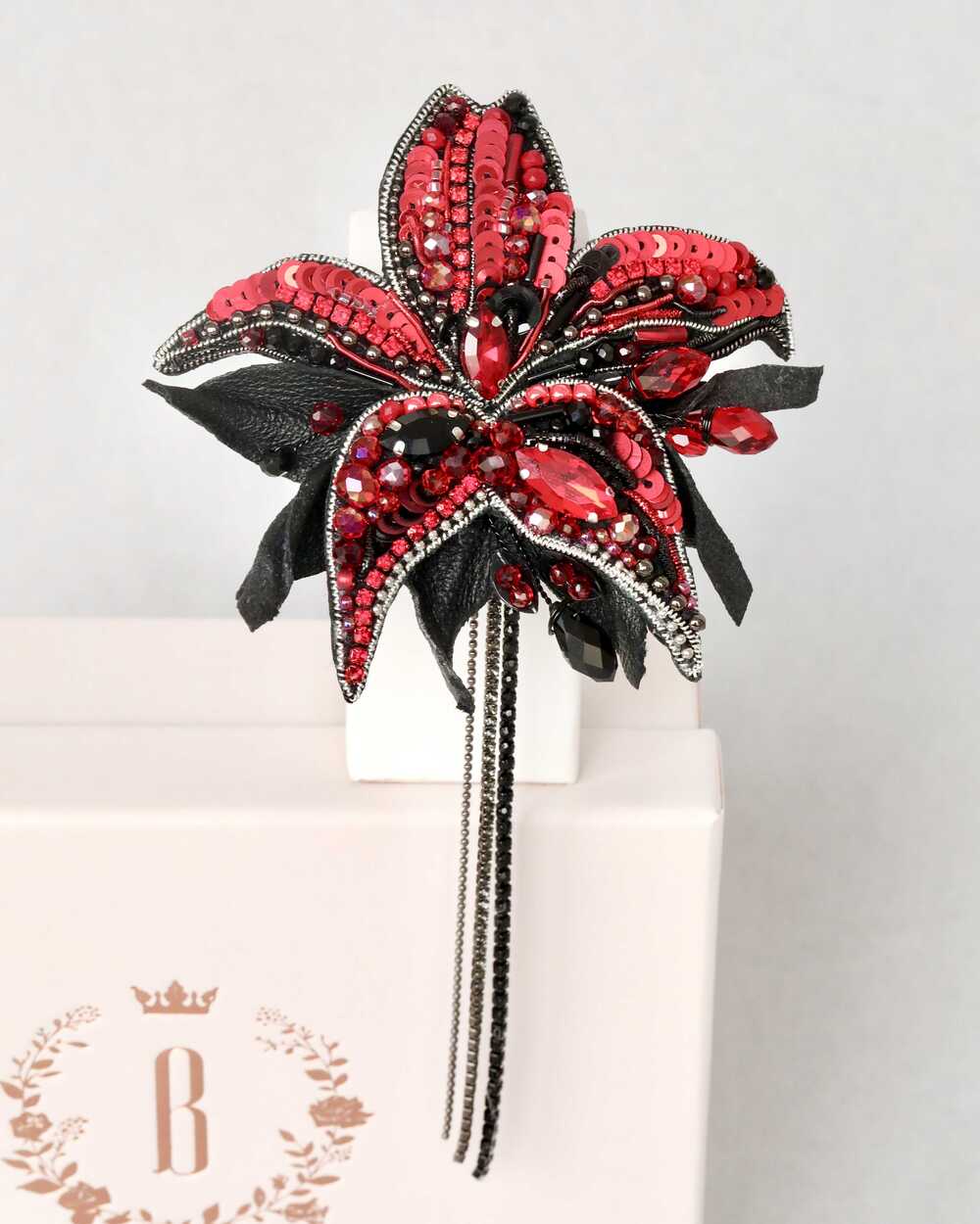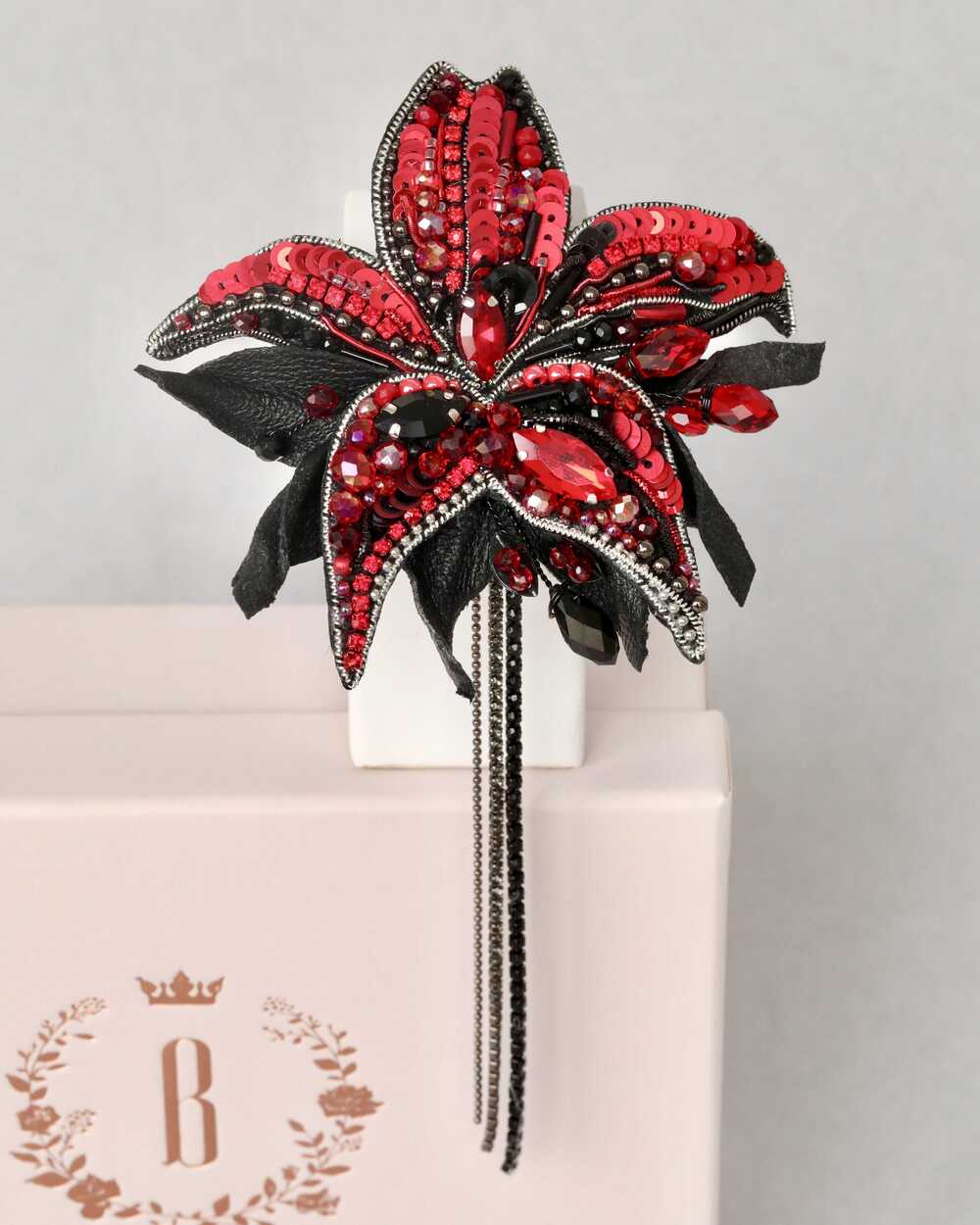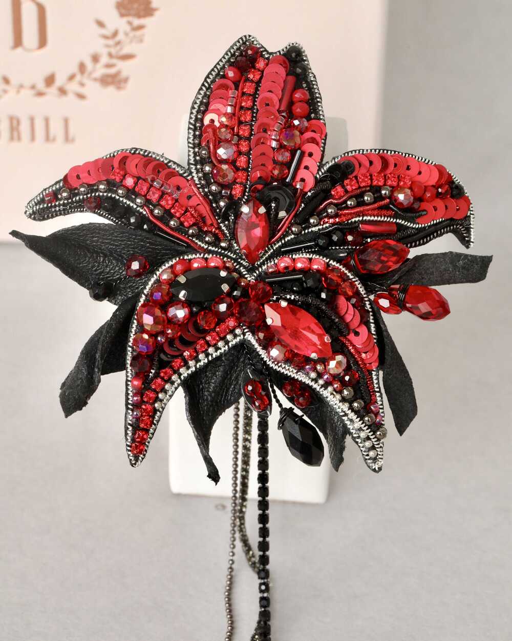 Наша яркая «Лилия» это полностью ручная работа наших внимательных и трудолюбивых мастеров. Каждый лепесток, каждая деталь кропотливо проработана, чтобы брошь была живой и неповторимой. Граненые бусины, стеклянный бисер и пайетки делают брошь очень приятной на ощупь.