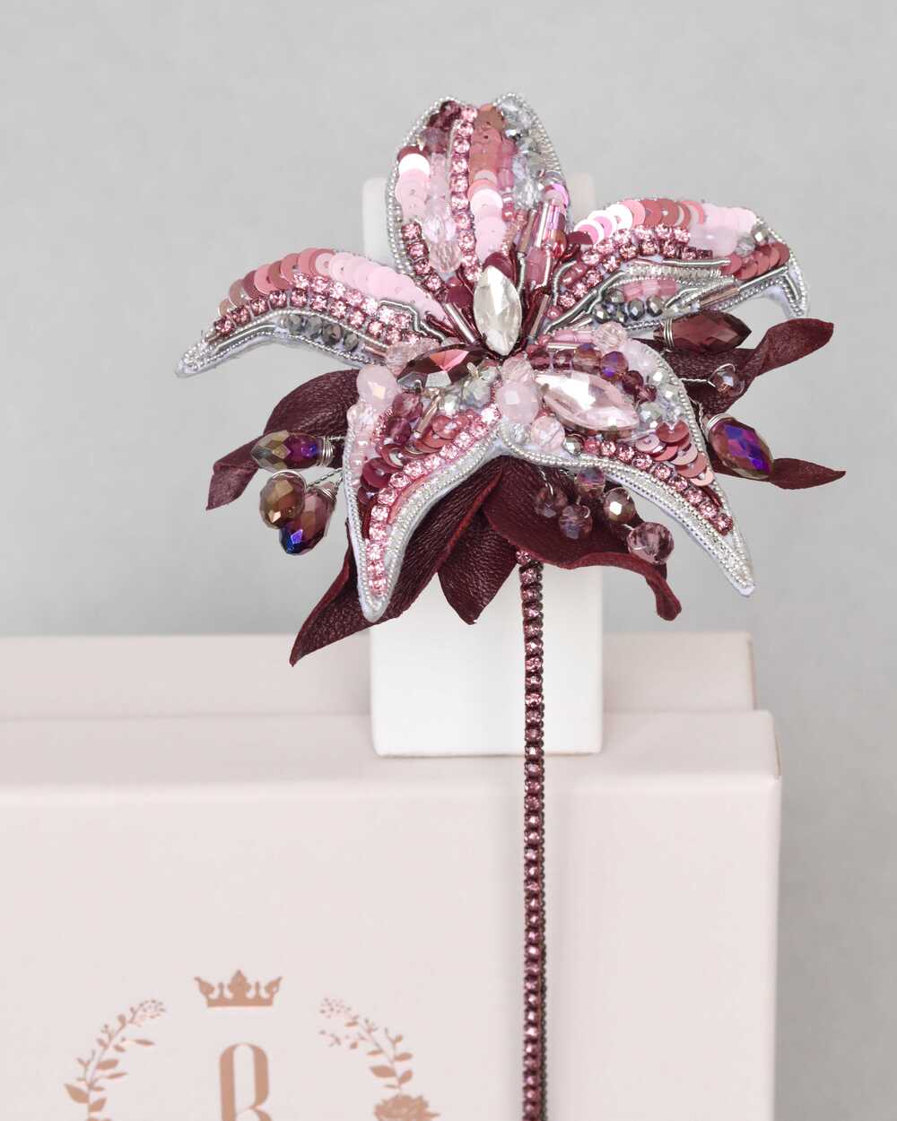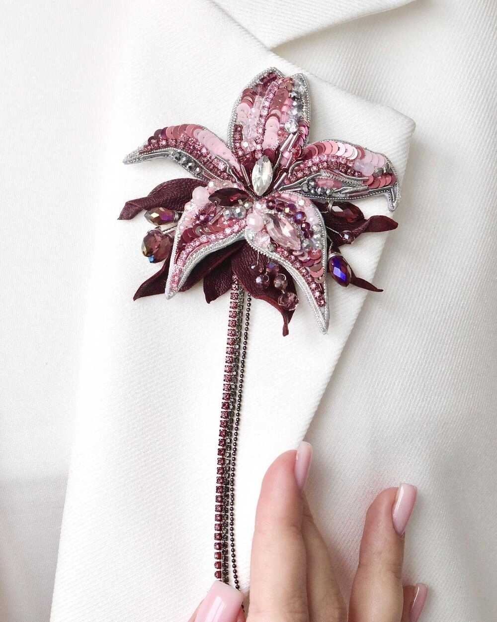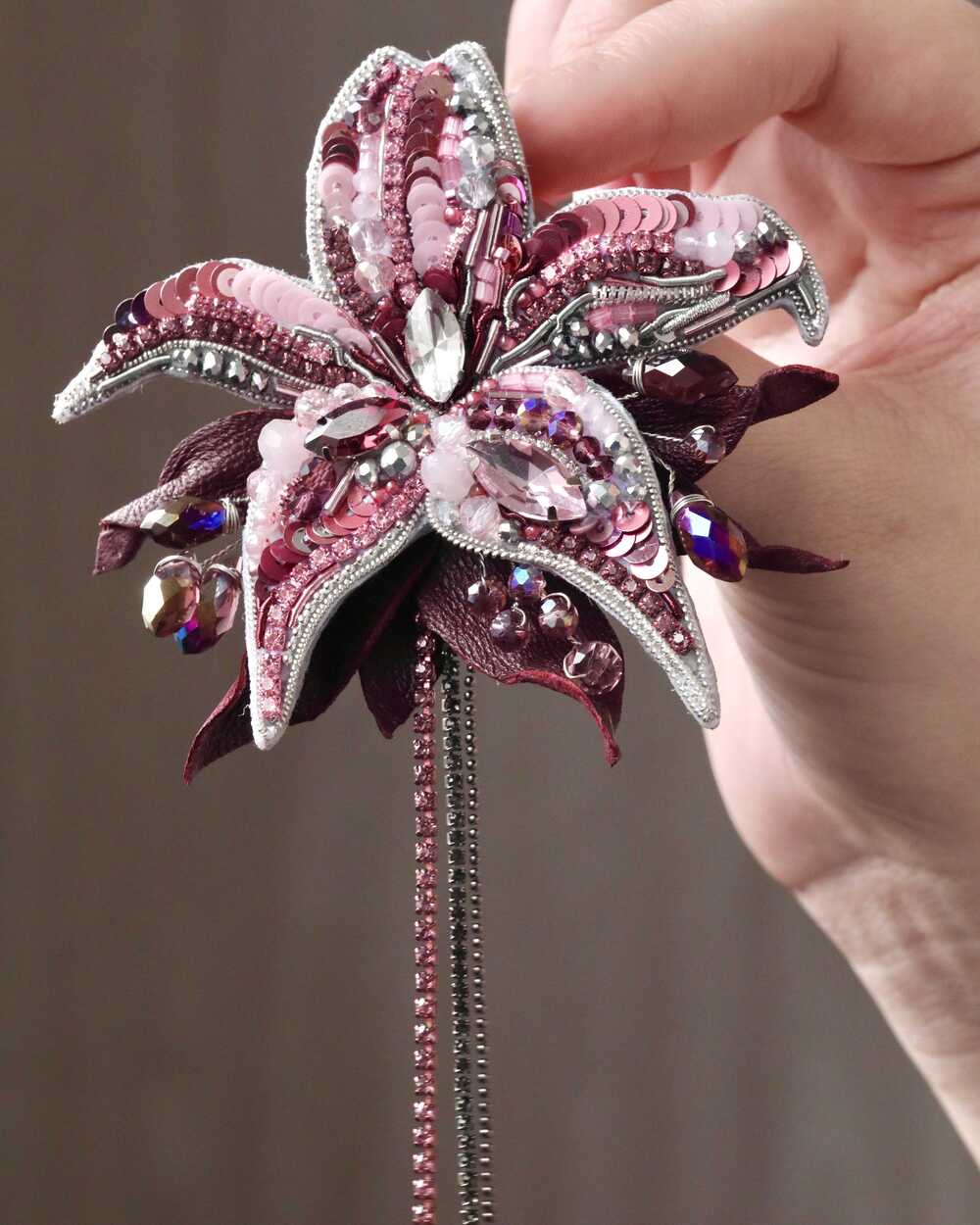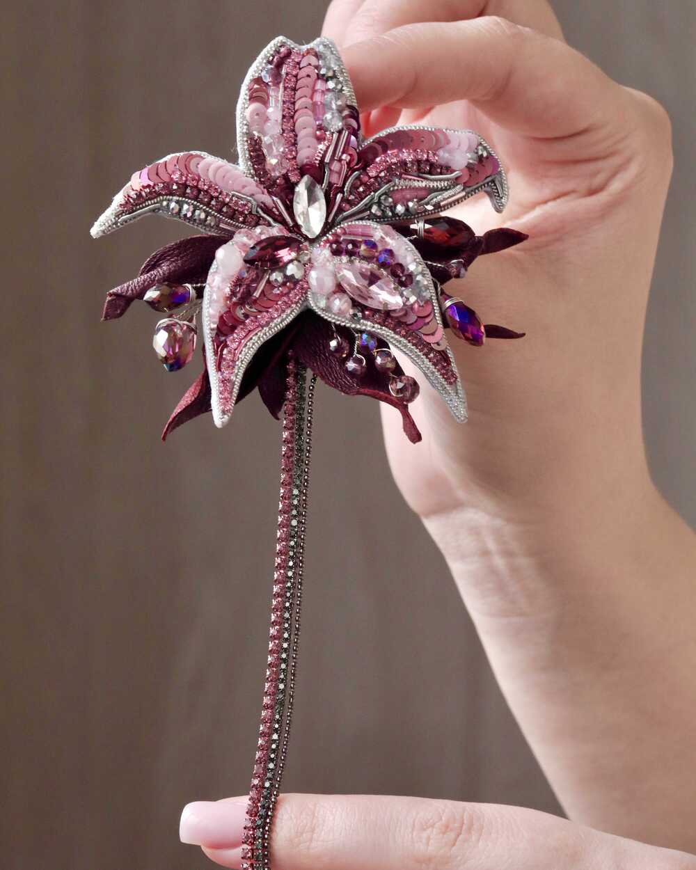 Наша яркая «Лилия» это полностью ручная работа наших внимательных и трудолюбивых мастеров. Каждый лепесток, каждая деталь кропотливо проработана, чтобы брошь была живой и неповторимой. Граненые бусины, стеклянный бисер и пайетки делают брошь очень приятной на ощупь.