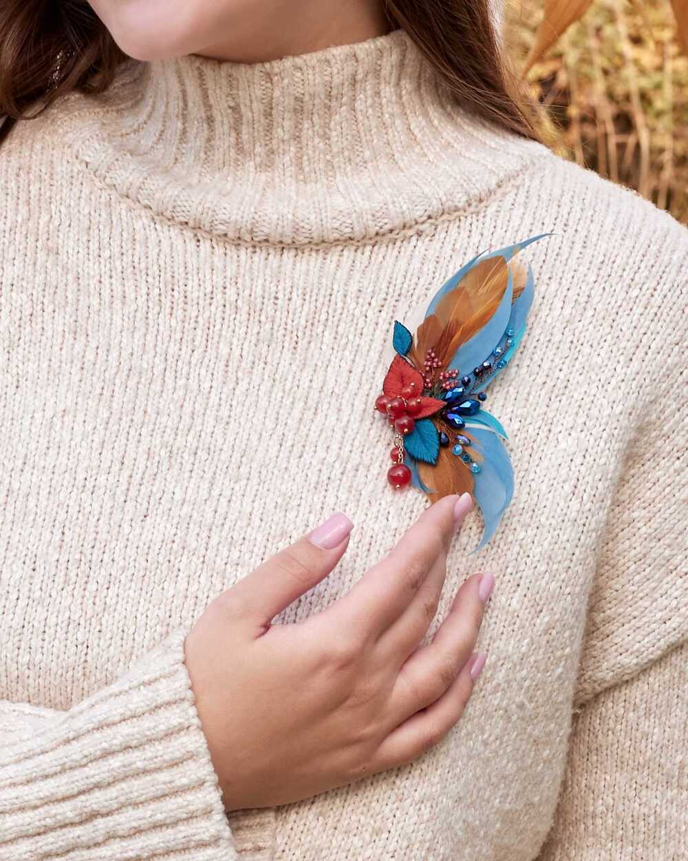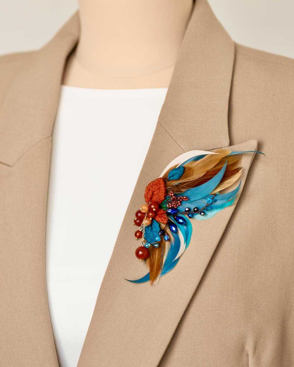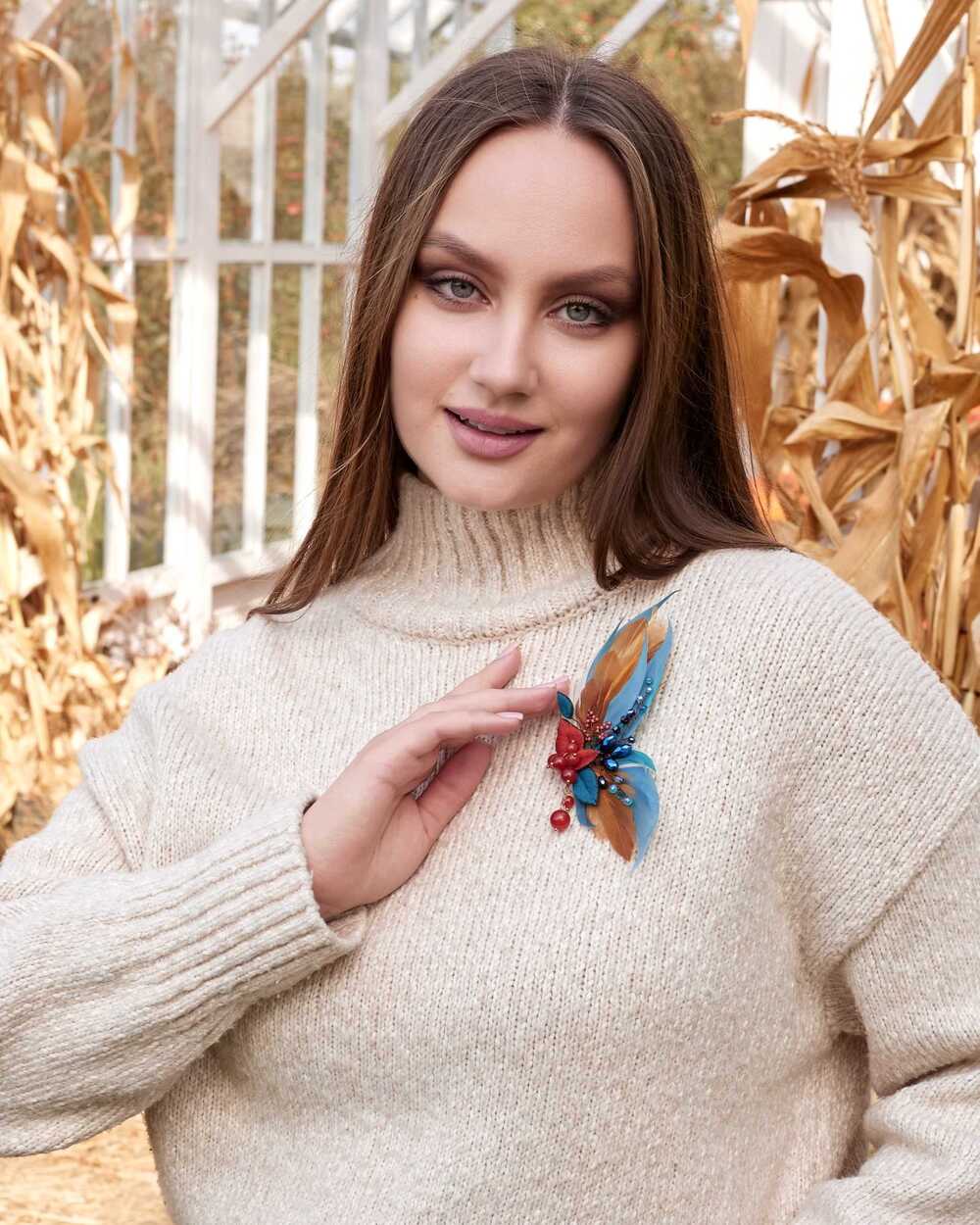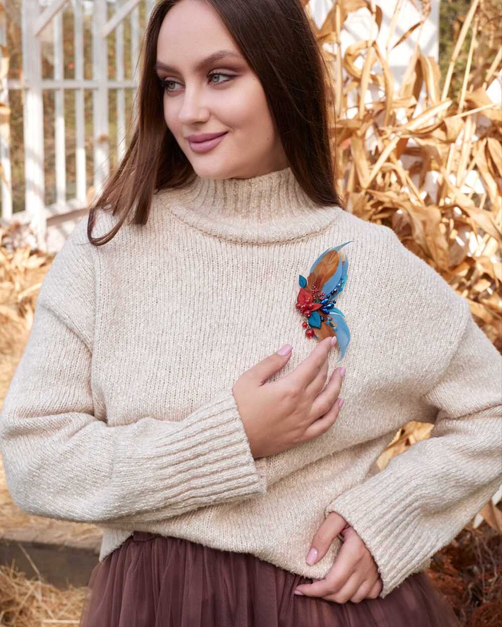 Гипоаллергенные перья, словно легкий ветерок, касаются кожи, создавая ощущение невесомости и свободы. Они добавляют броши изысканную воздушность, делая её не только украшением, но и символом легкости бытия.