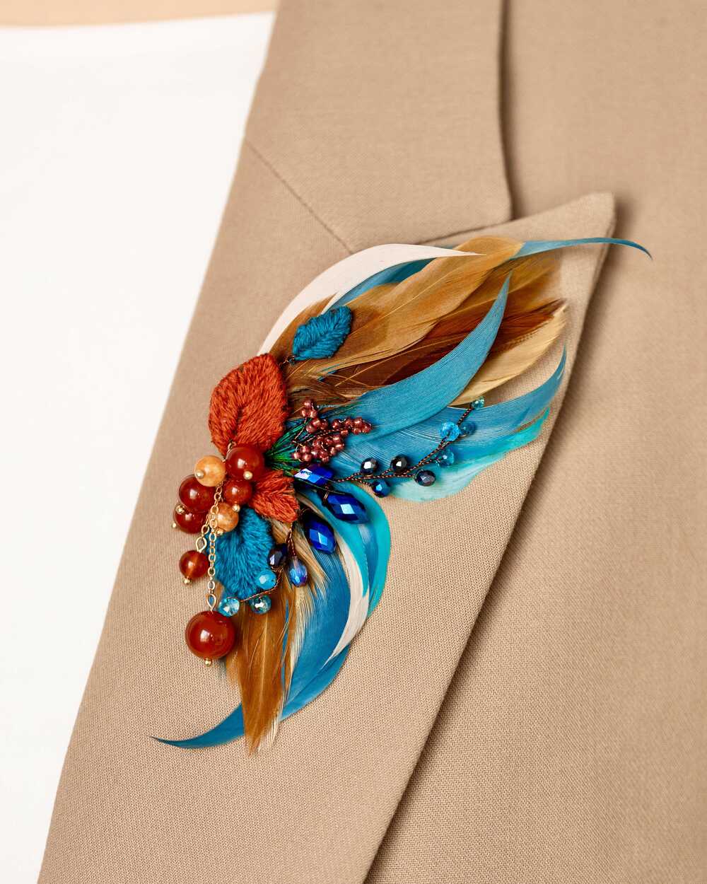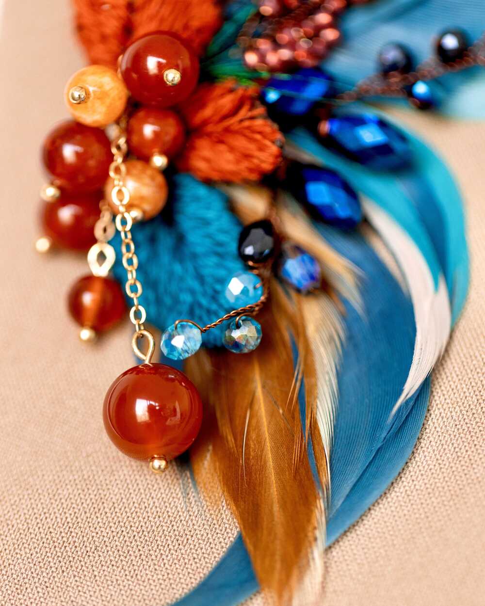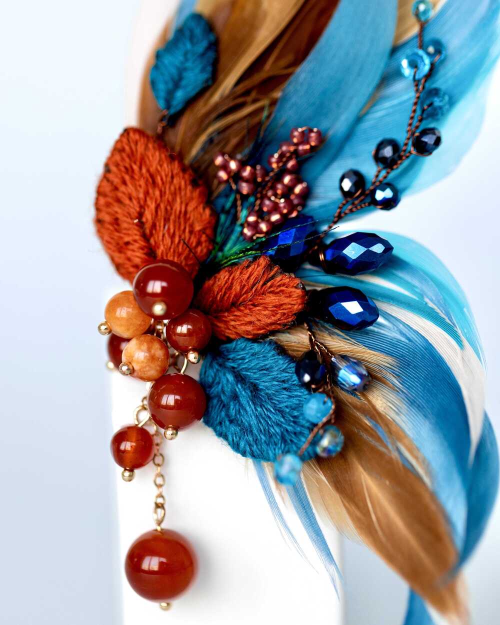 Бисер toho, нити мулине, натуральные бусины сердолика, металличекая проволока, цепь покрытая родием, гипоаллергенные перья, декоративные металлизированные элементы, покрытые родием, граненое стекло Чехия, фетр, застежка-булавка с родированным покрытием Япония, брендированная бирка