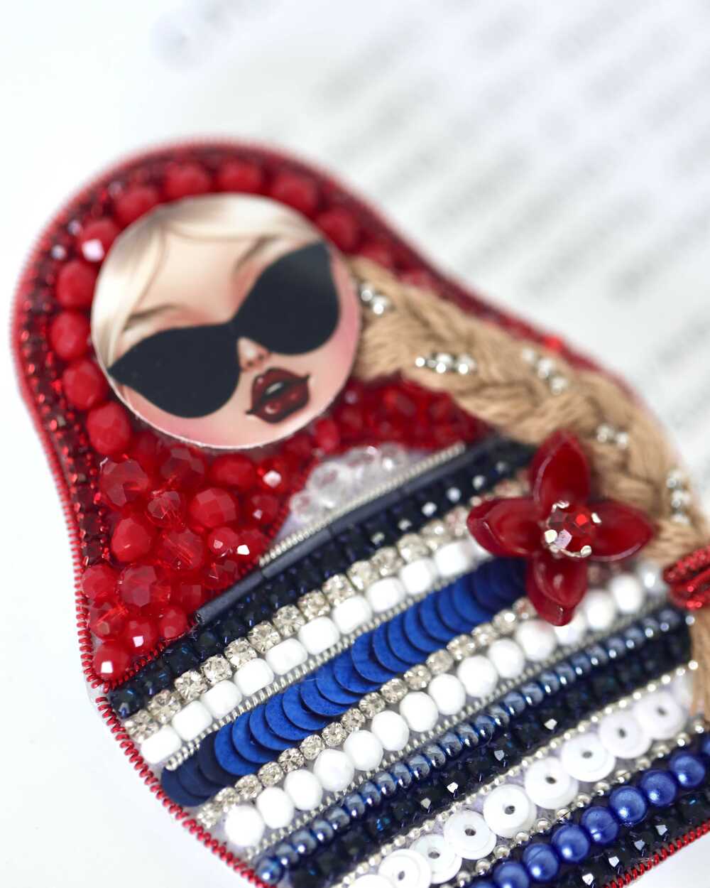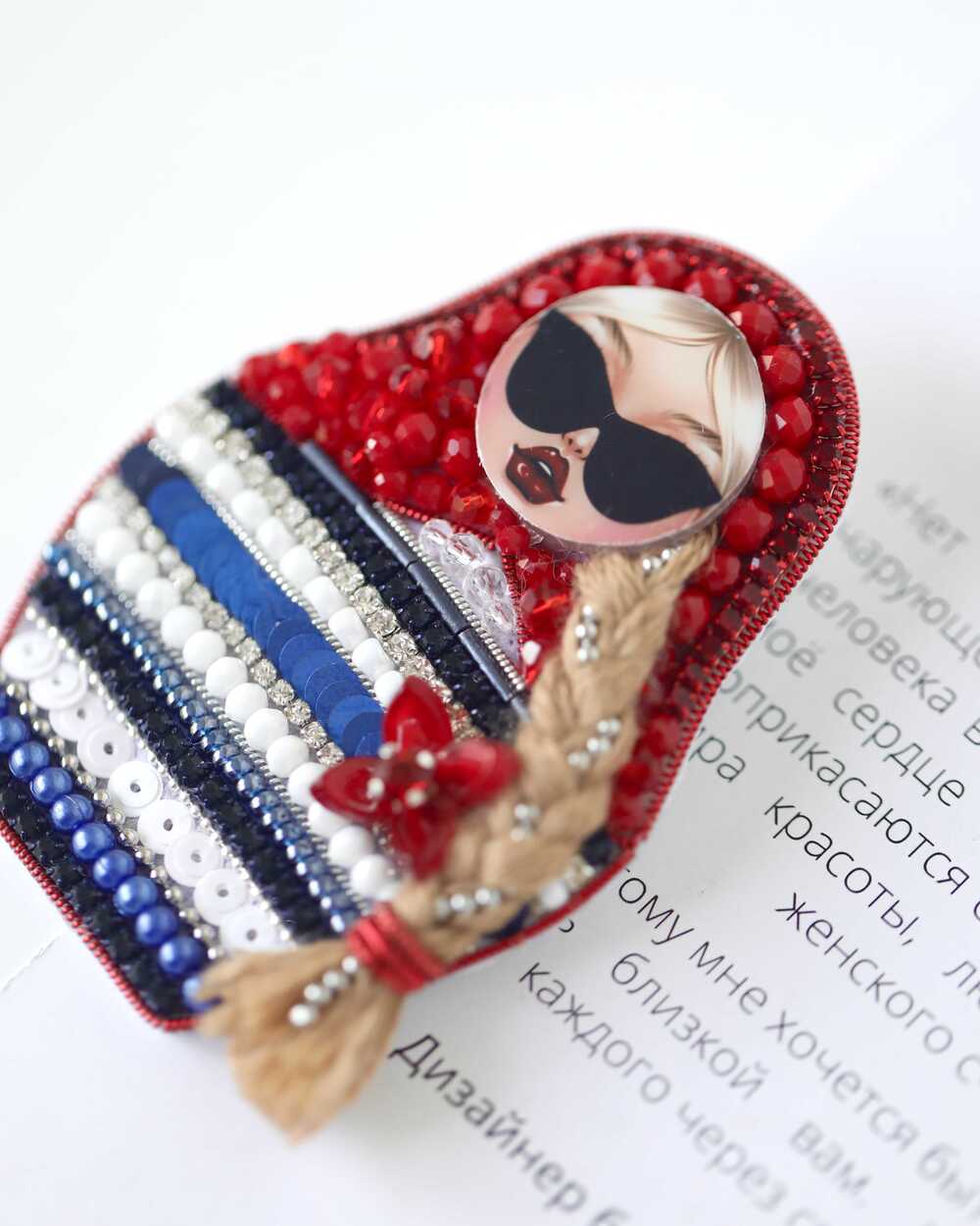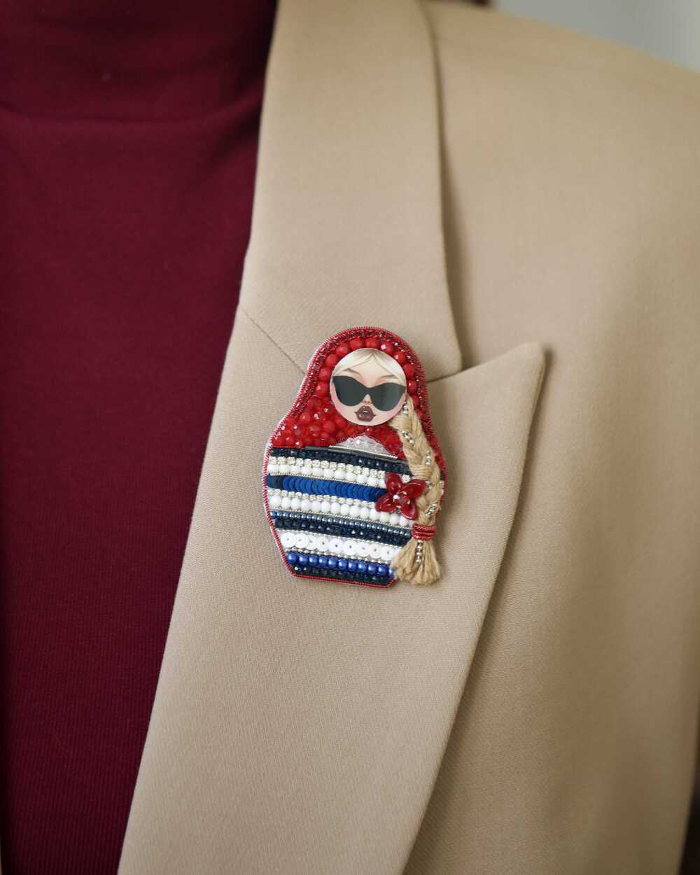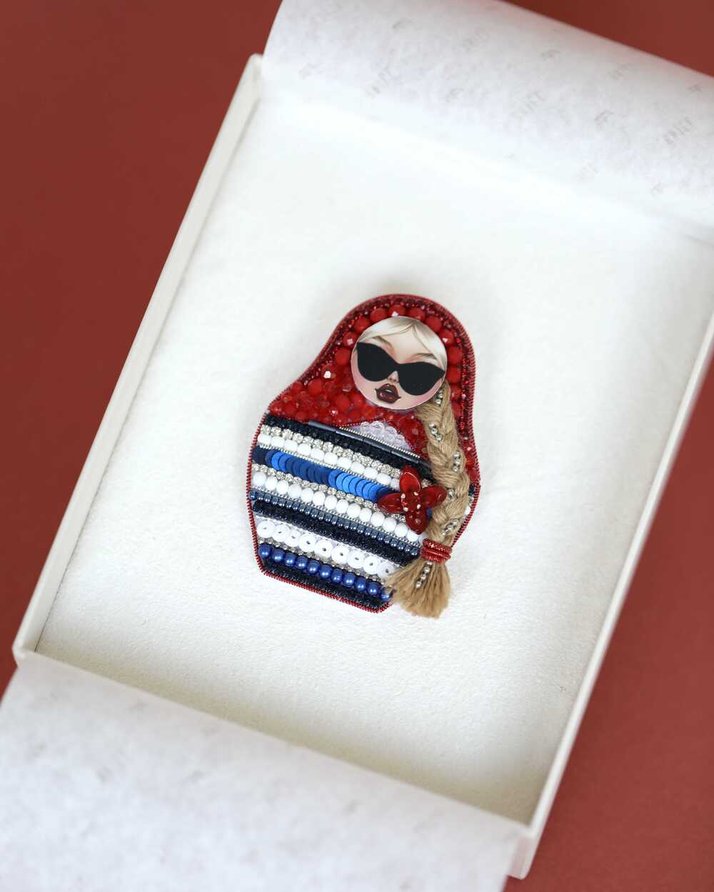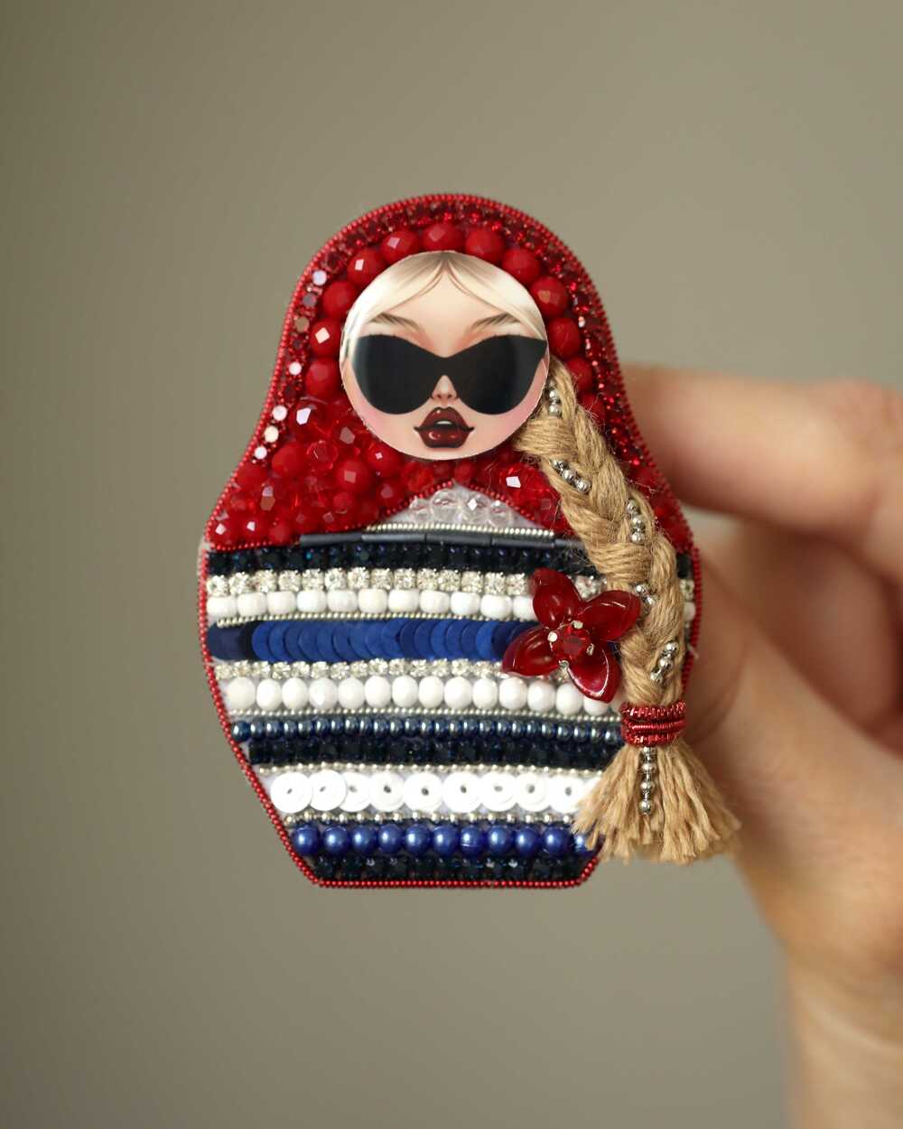 Это наша Матрёшка – бунтарка: вместо сарафана – морская тельняшка, вместо скромного взгляда – дерзкие чёрные очки, а дополняет образ длинная русая коса. Каждая деталь сделана вручную: от морских узоров до алого платочка из бисера. Ваша морячка будет единственной в мире.