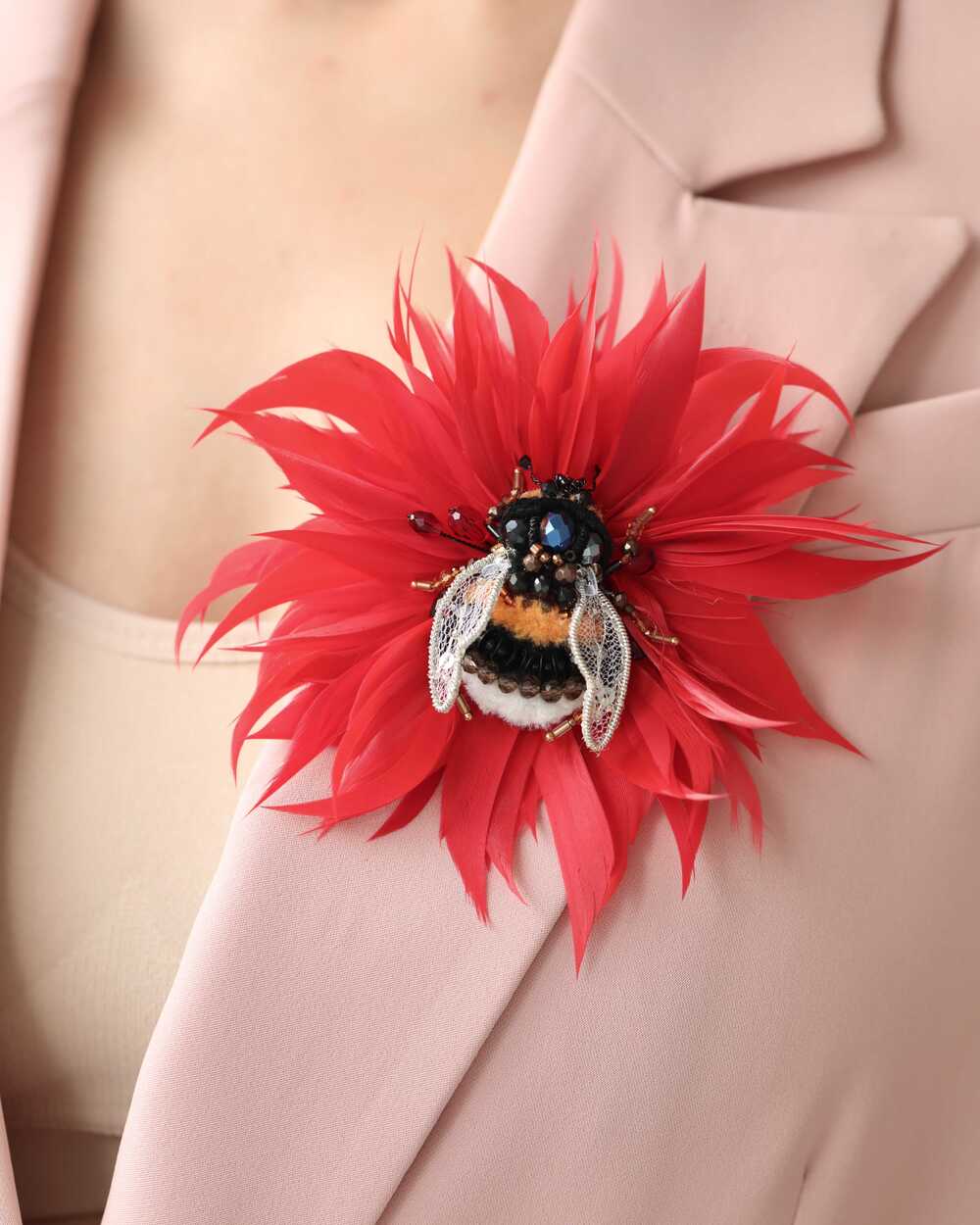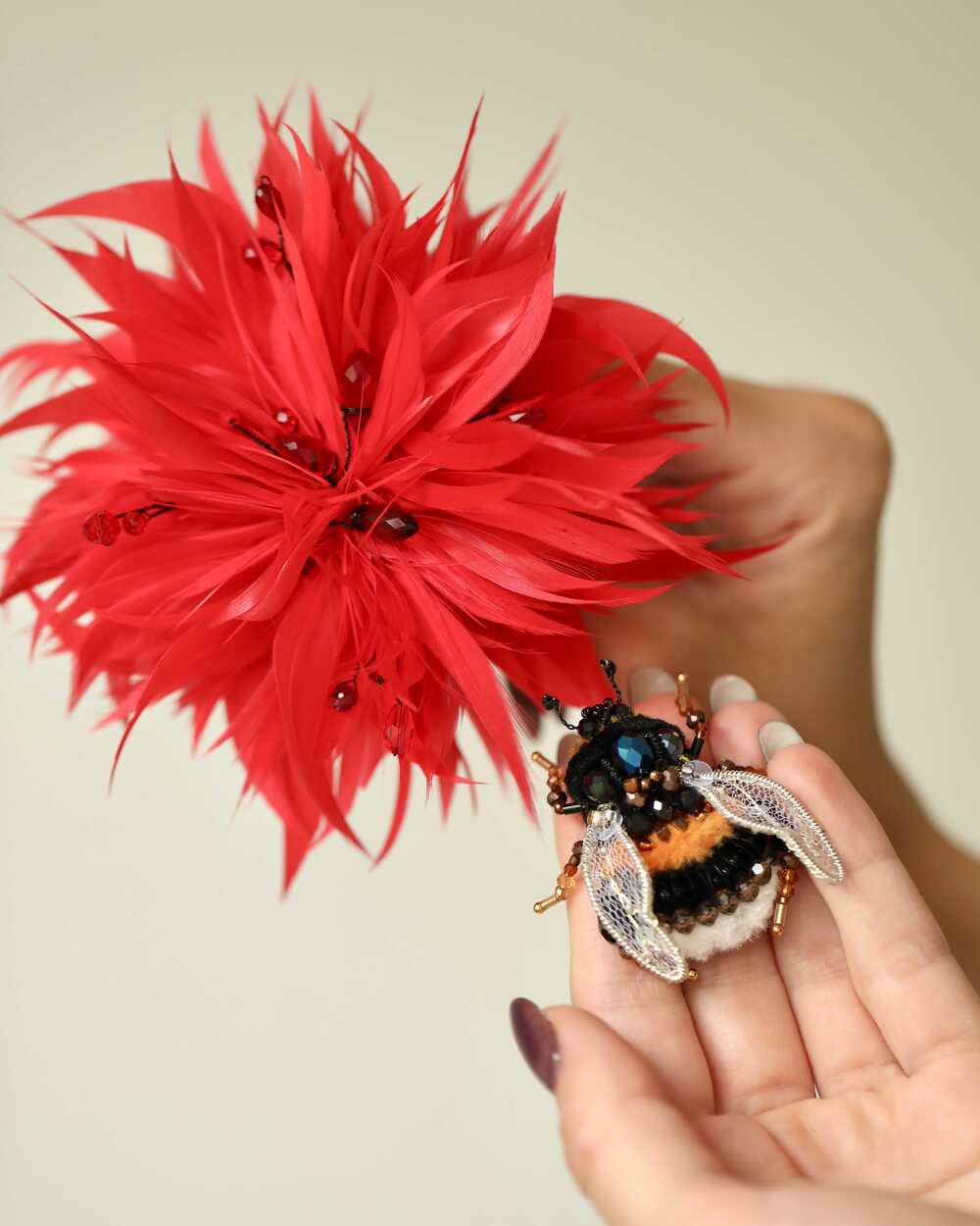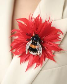 Алый цветок и пчелка, сияющая россыпью бисера, словно сошли со страниц книги. Но главная магия скрыта в конструкции - пчелка крепится к цветку на невидимый магнит!