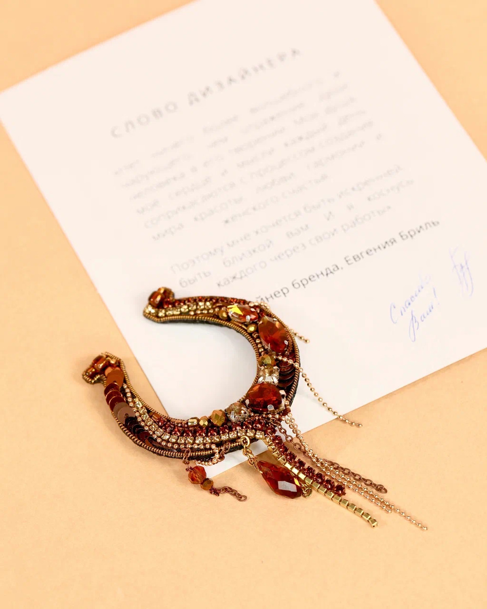 Вручную, стежок за стежком, бусина за бусиной, мастер соединял эти элементы в гармоничную композицию. Каждая брошь получает свой характер, но неизменной остаётся её идея: все наши украшения создаются с огромной любовью
