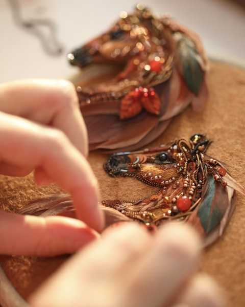 бисер toho, нити мулине, натуральная бусина сердолика, металличекая проволока, цепь покрытая родием, пайетки Франция, фианиты в цапах, гипоаллергенные перья, декоративные металлизированные элементы, покрытые родием, граненое стекло Чехия, фетр, застежка-булавка с родированным покрытием Япония, брендированная бирка, канитель, трунцал