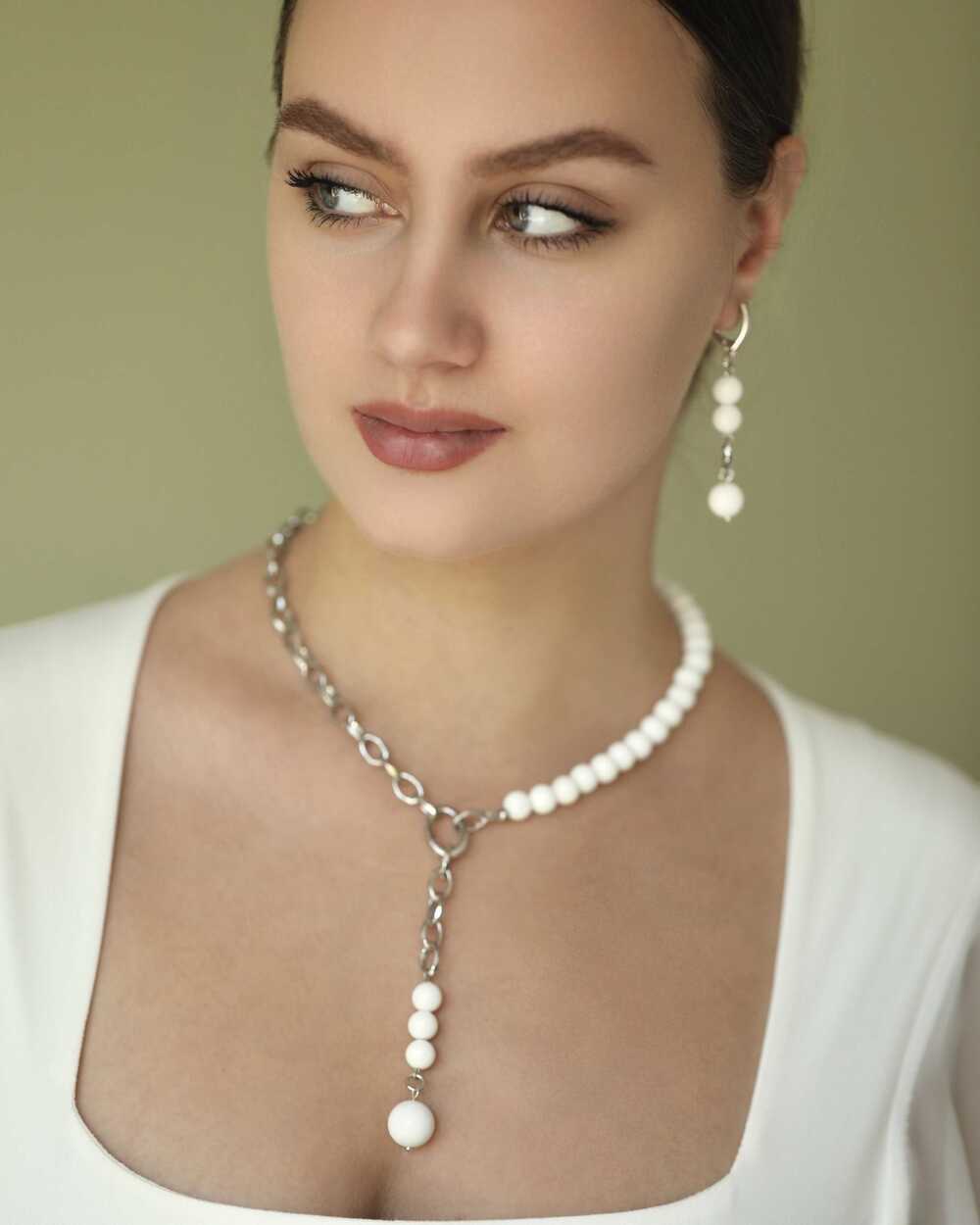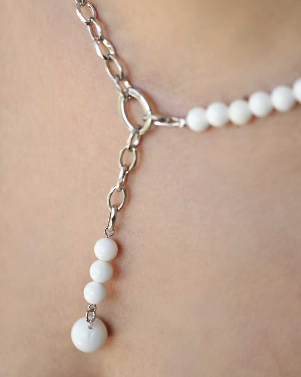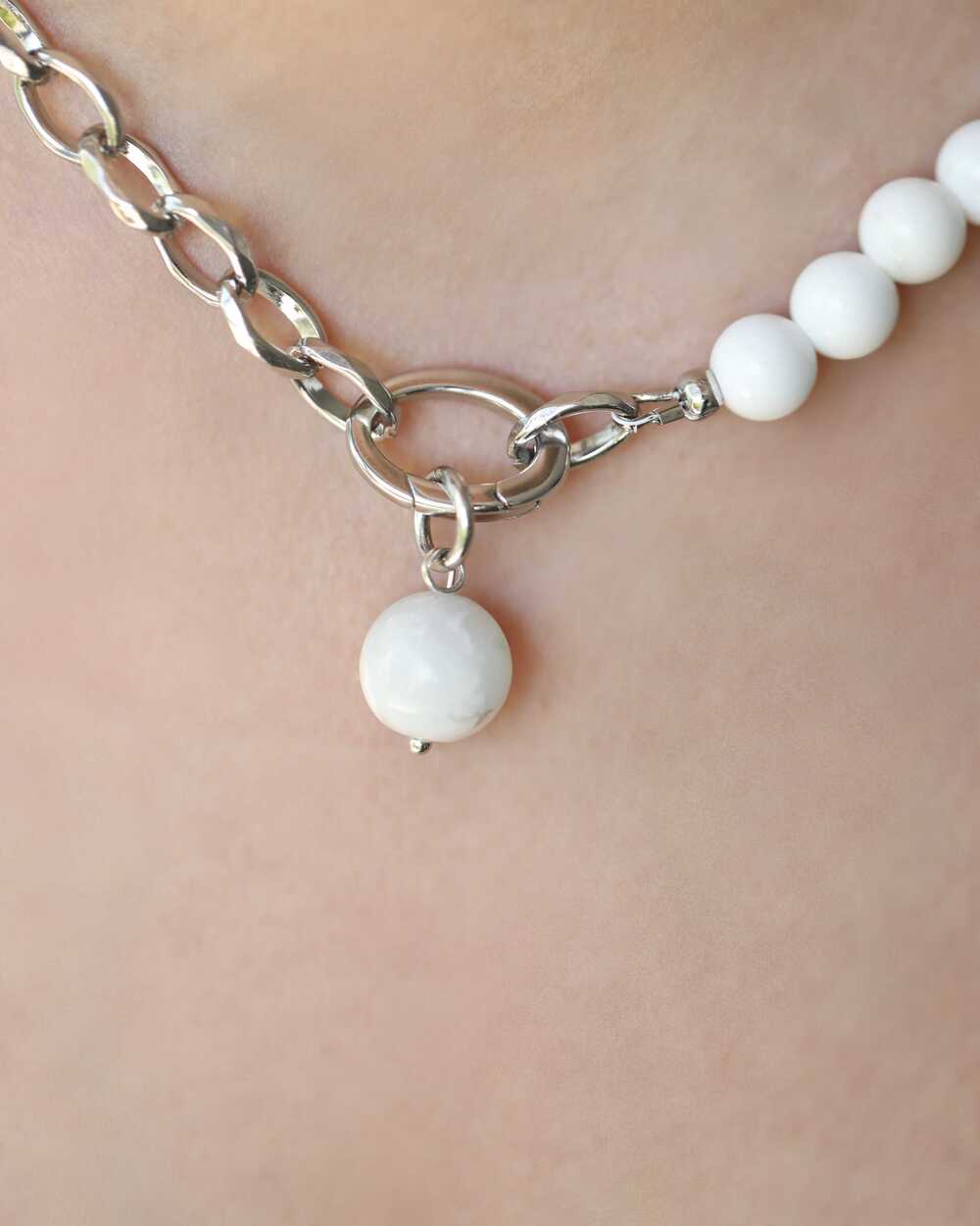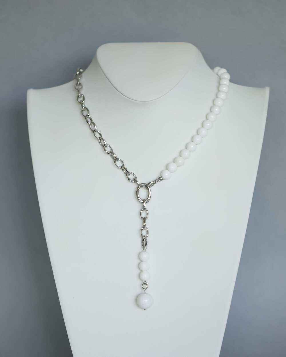 Колье-трансформер "Сан-Ремо" из белого агата. Колье можно носить в трех вариантах: без шарма, с коротким шармом и с длинным шармом. Кулоны крепятся на удобный карабин.