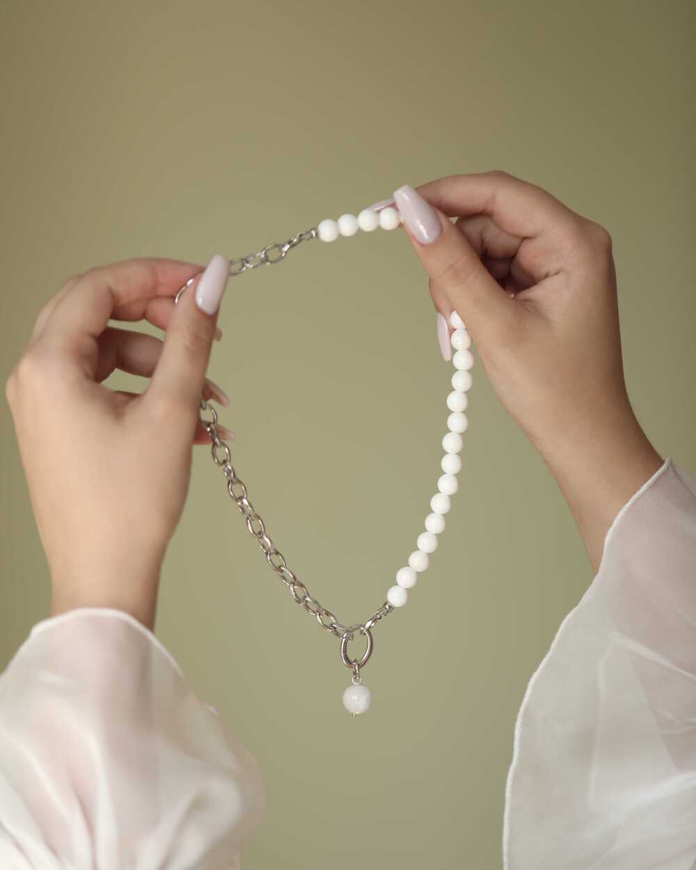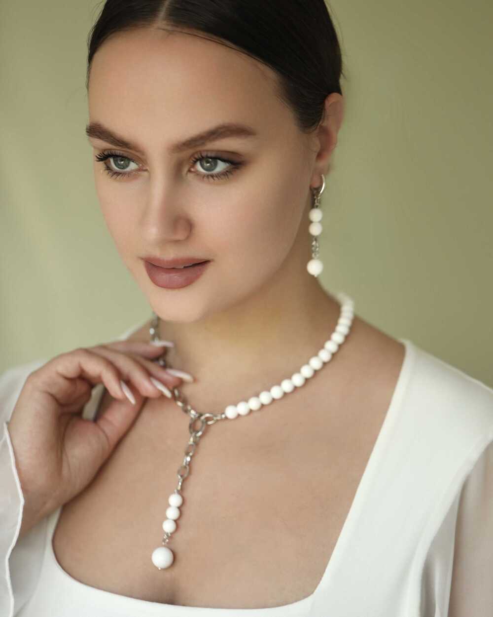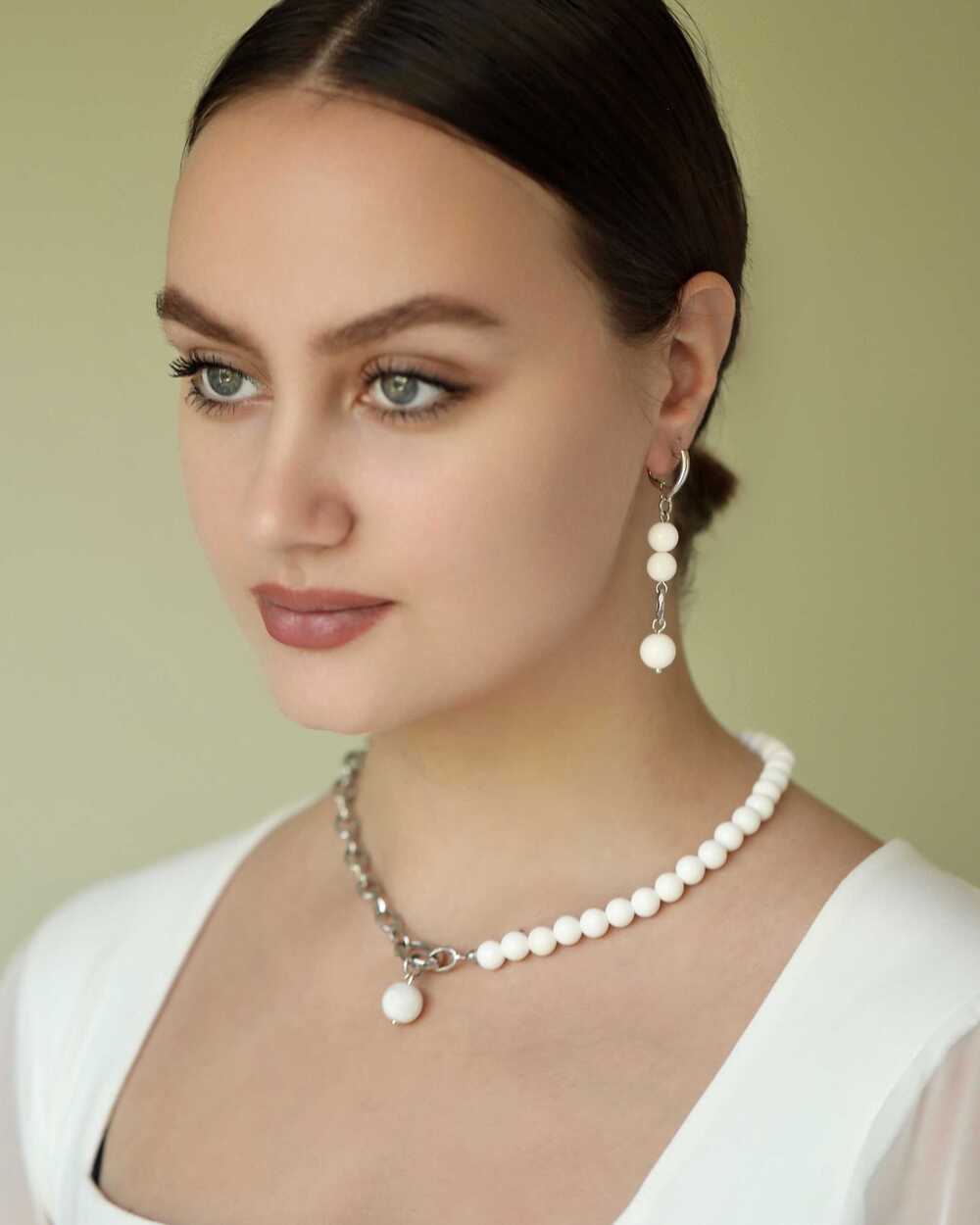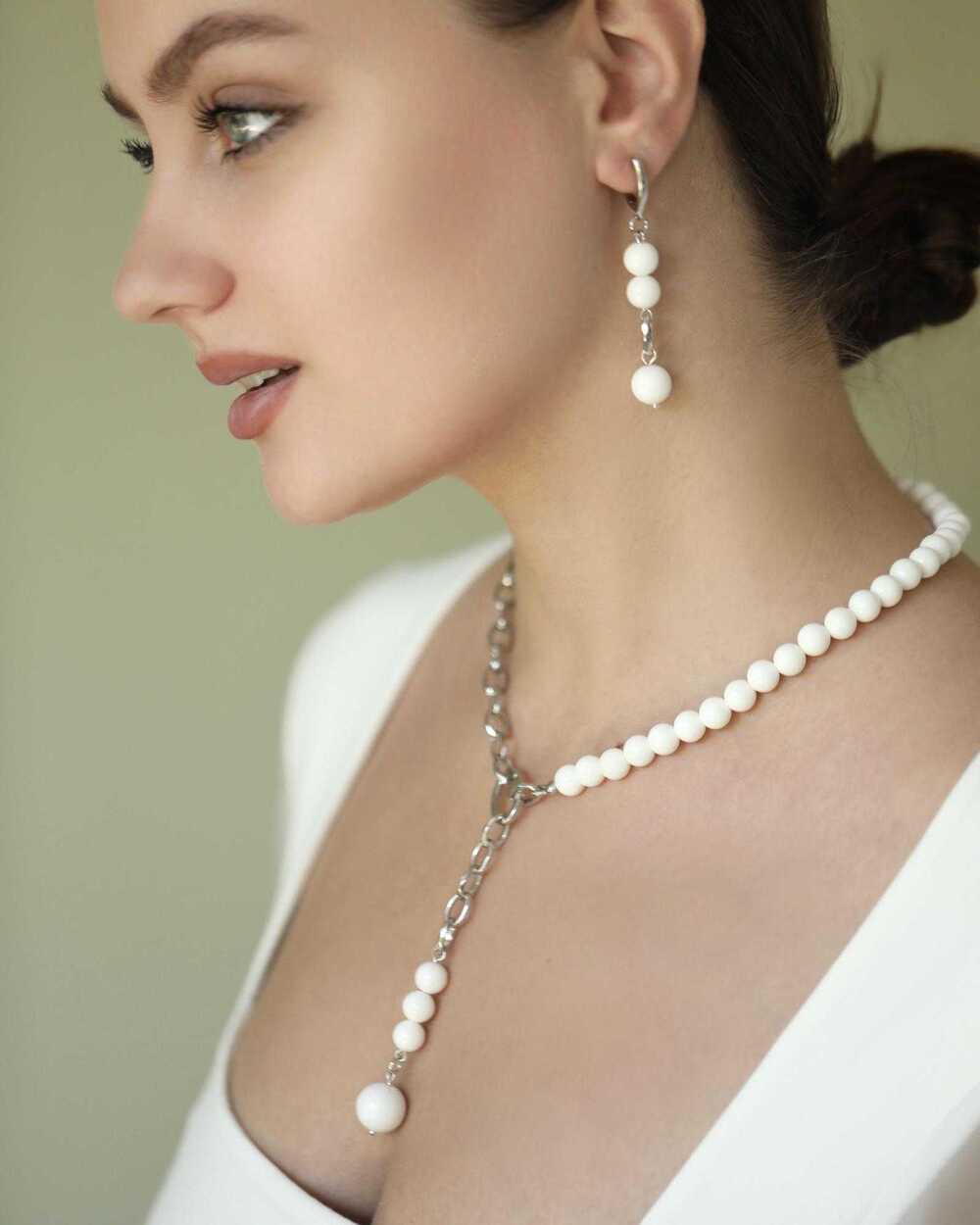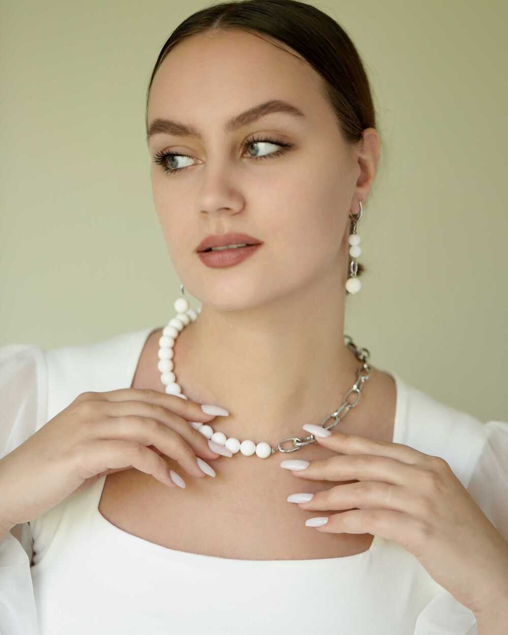Колье-трансформер "Сан-Ремо" из белого агата. Колье можно носить в трех вариантах: без шарма, с коротким шармом и с длинным шармом. Кулоны крепятся на удобный карабин.