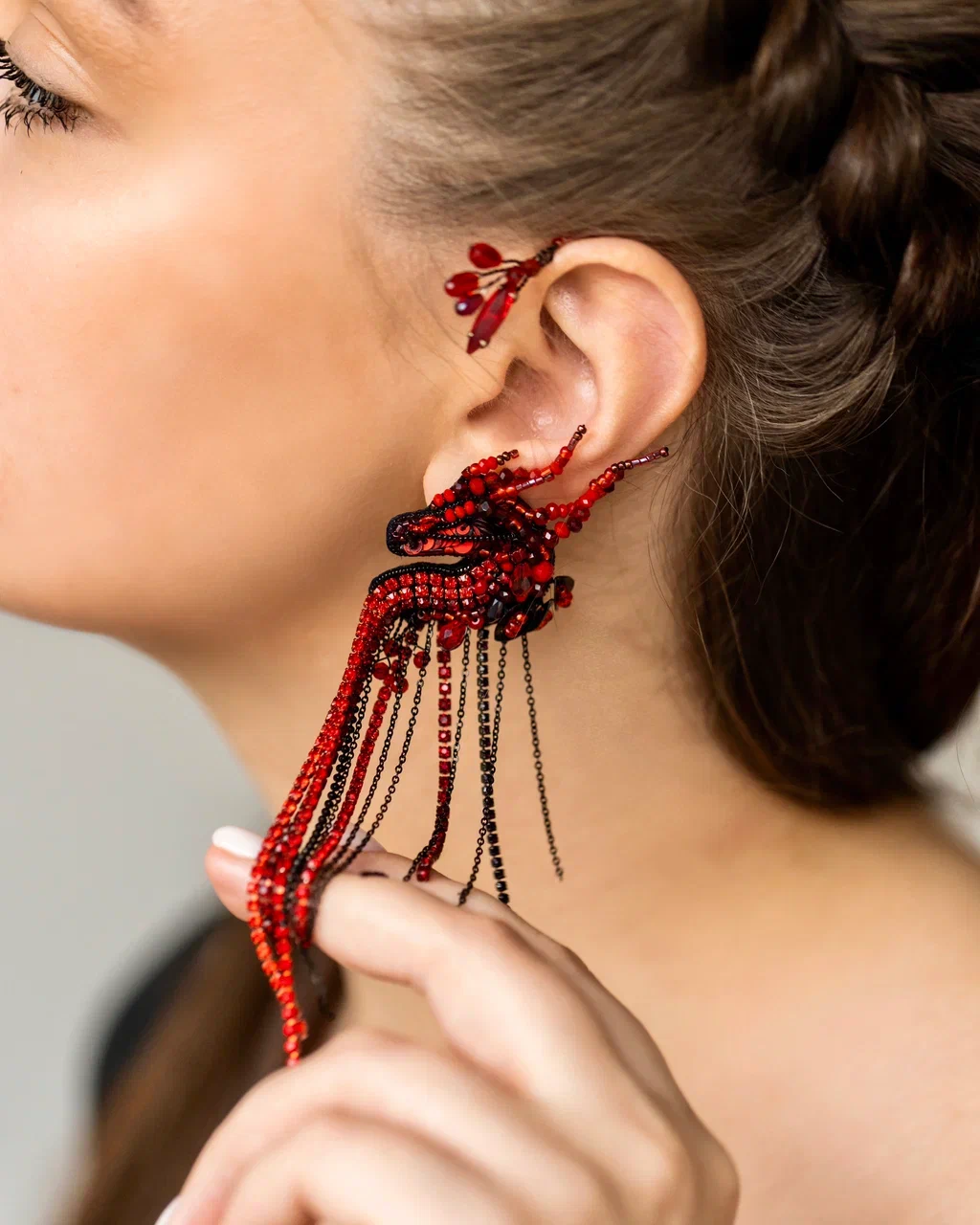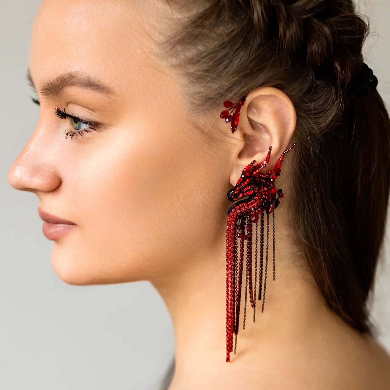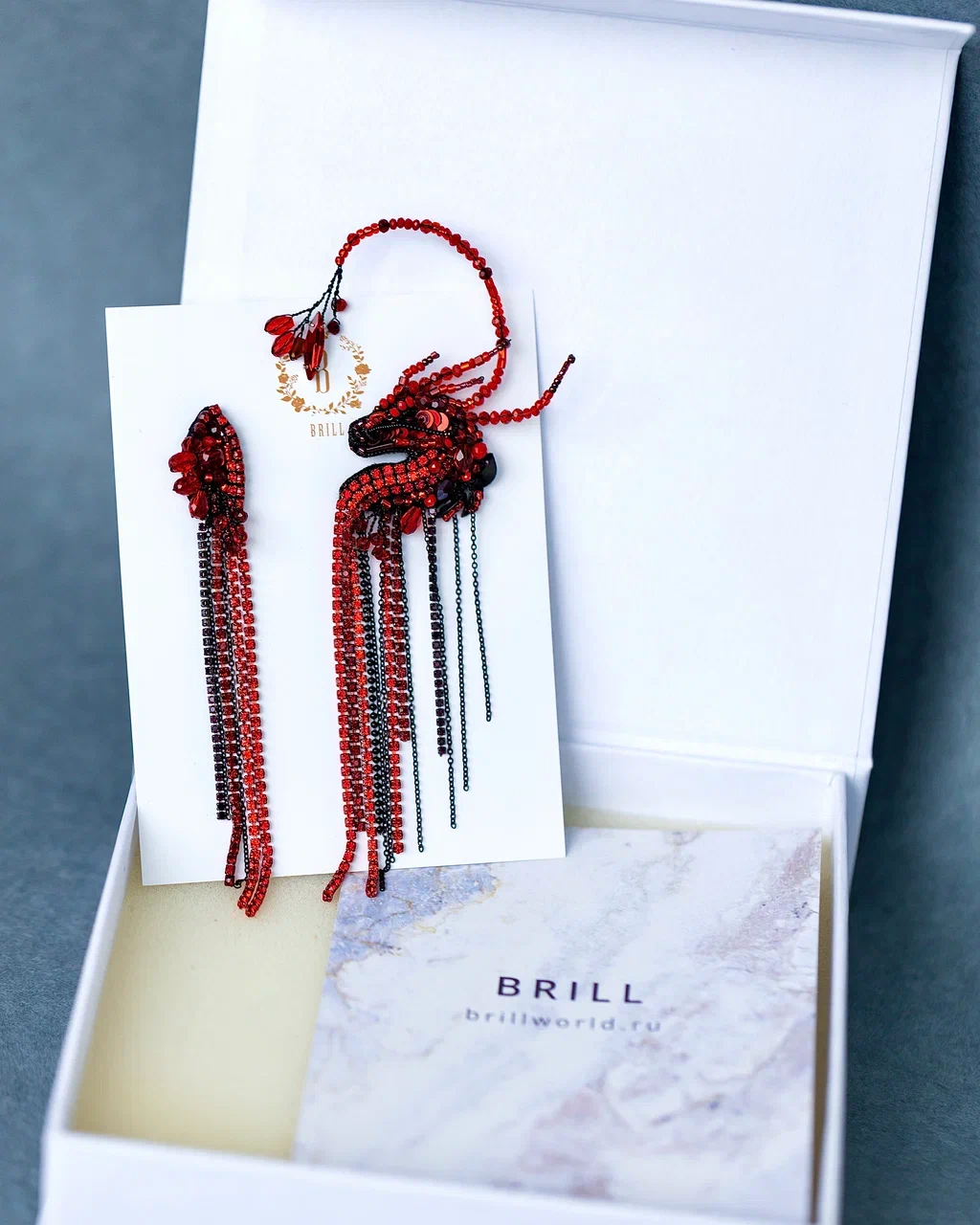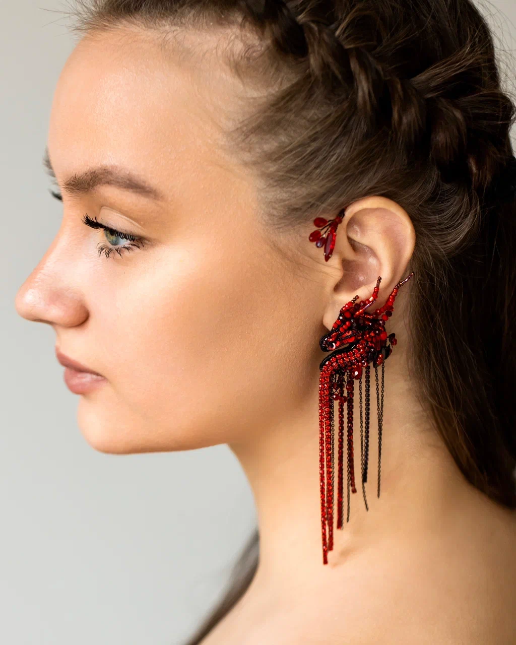 Главная серьга в виде дракона имеет декорированную дугу-кафф, которая заводится за ухо для удобства и плотной посадки.