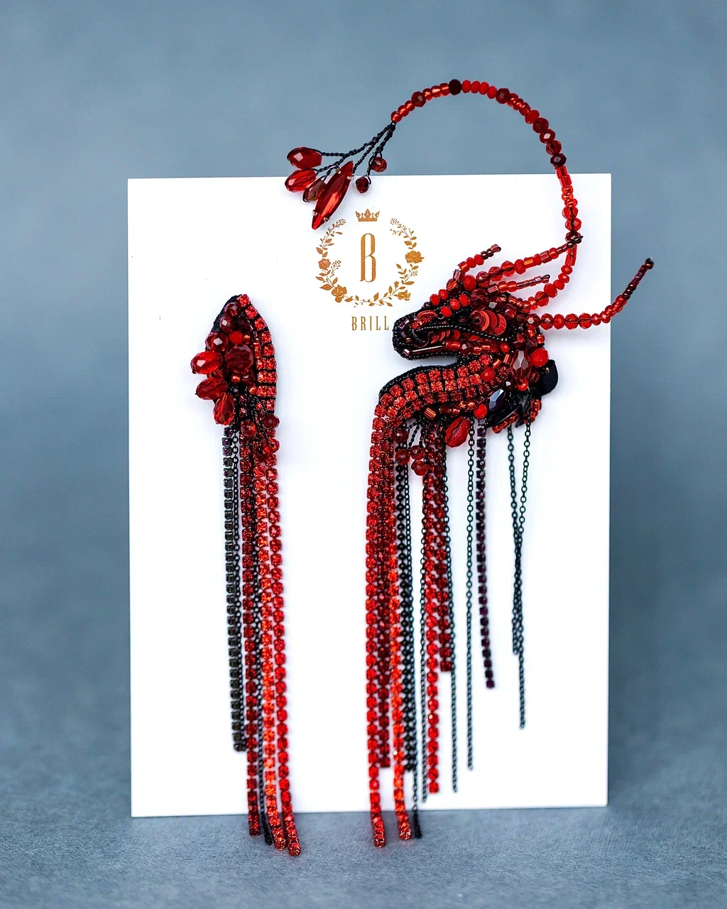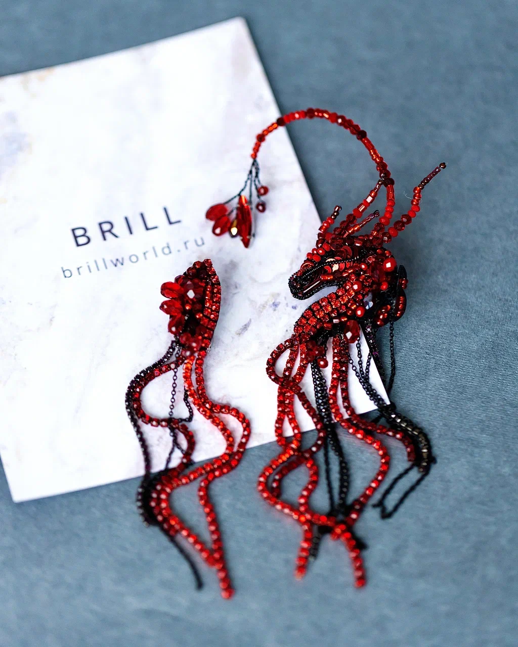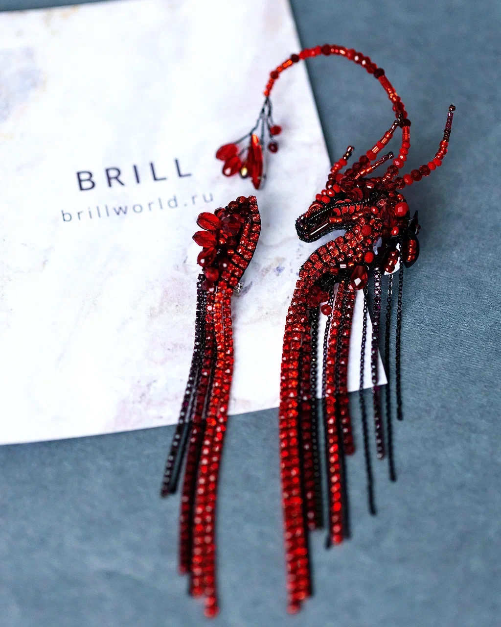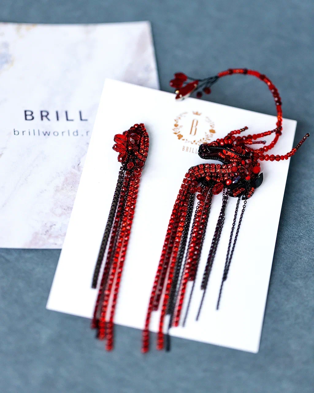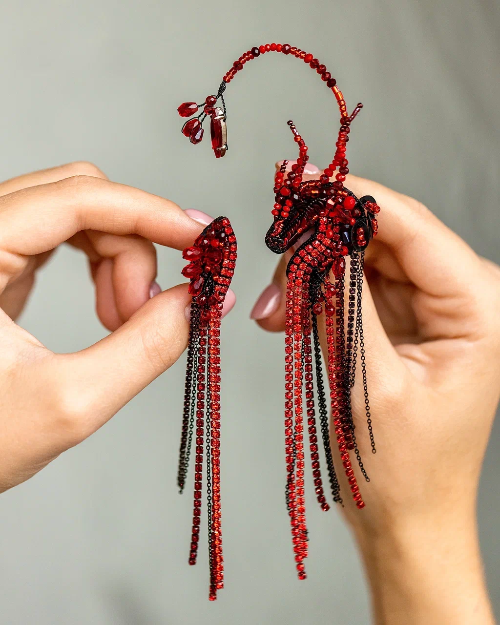 Главная серьга в виде дракона имеет декорированную дугу-кафф, которая заводится за ухо для удобства и плотной посадки.