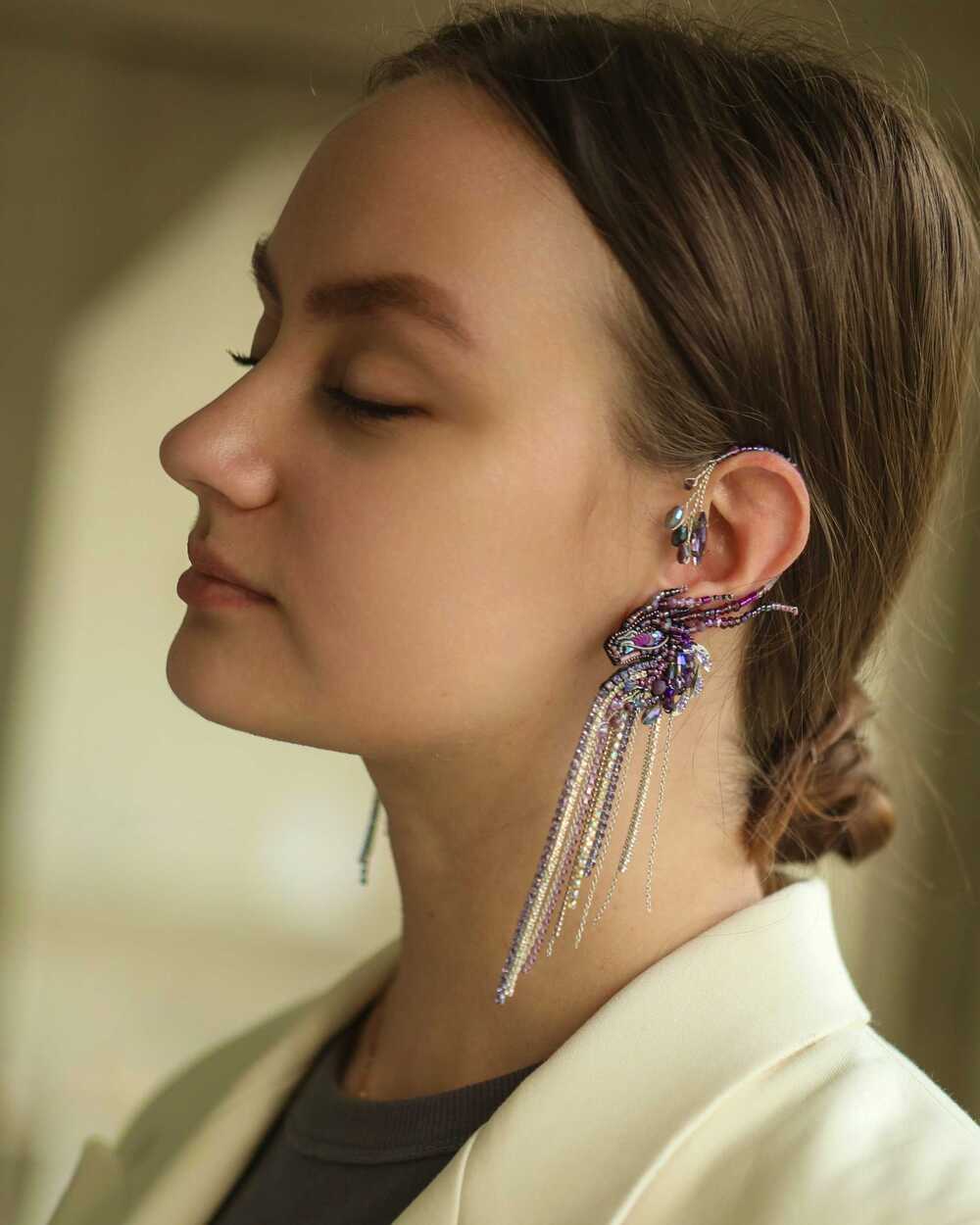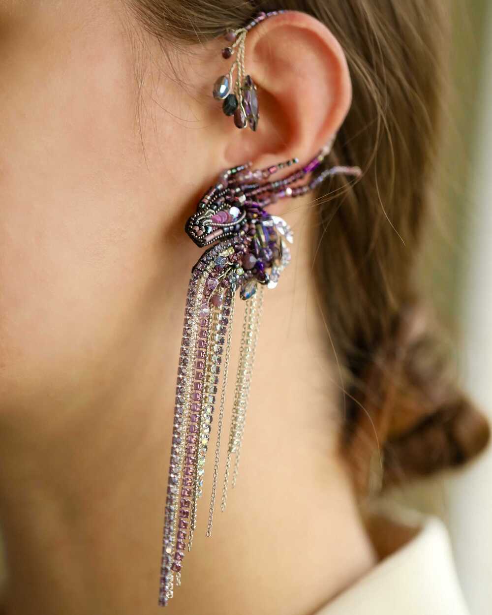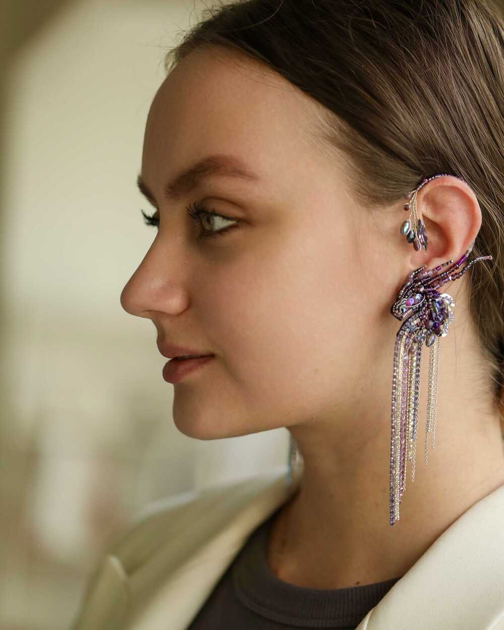 Главная серьга в виде дракона имеет декорированную дугу-кафф, которая заводится за ухо для удобства и плотной посадки.