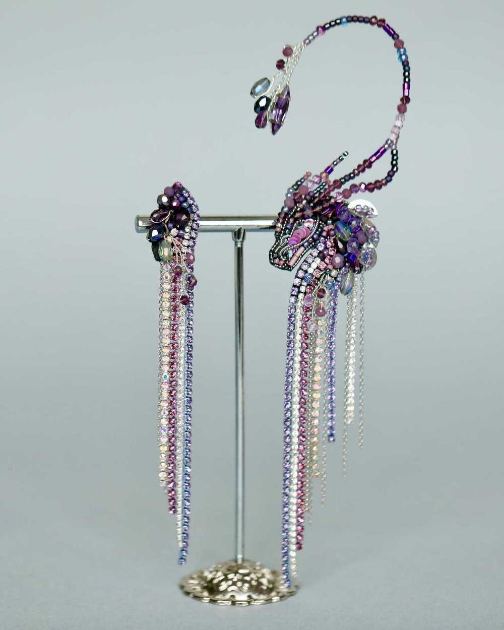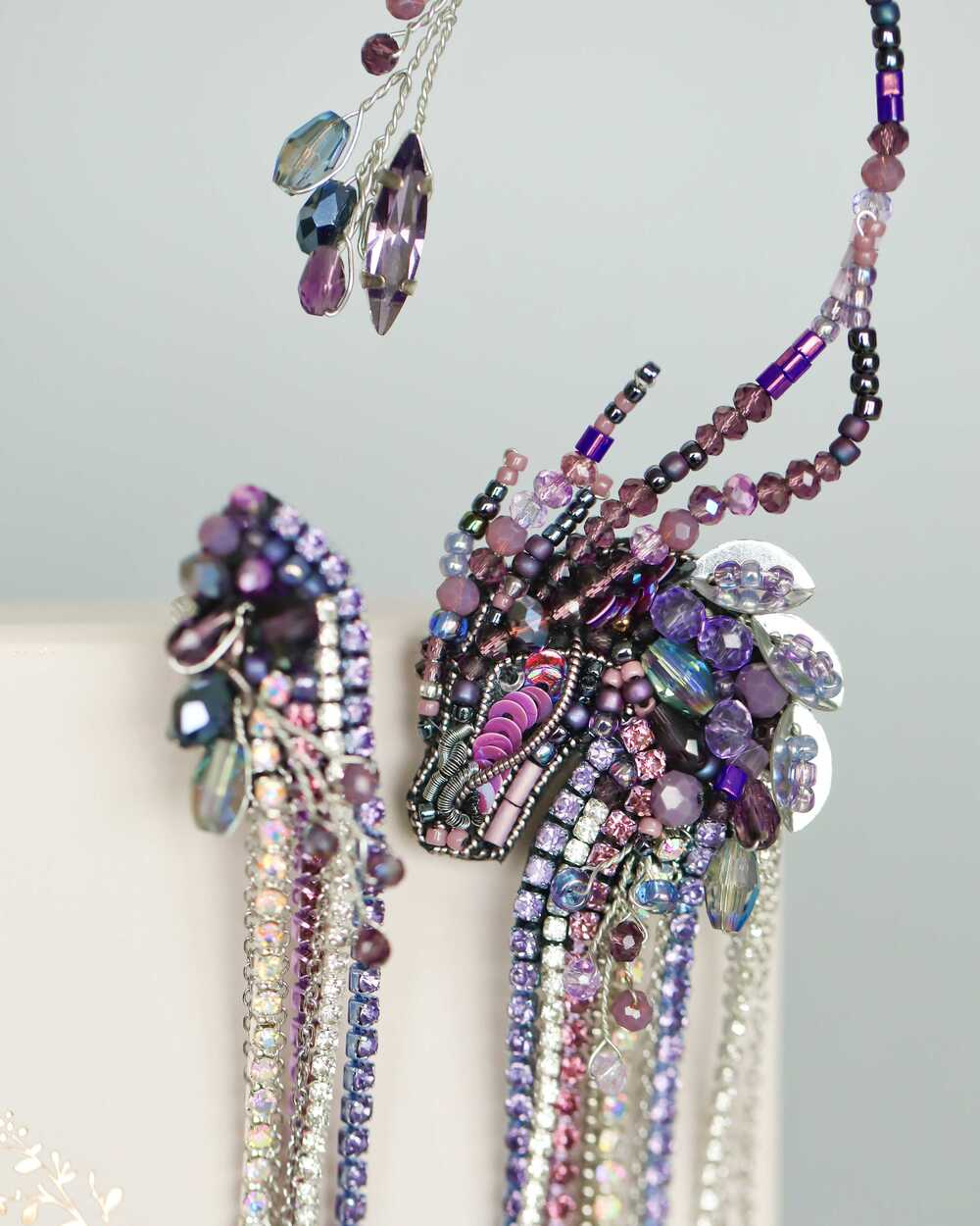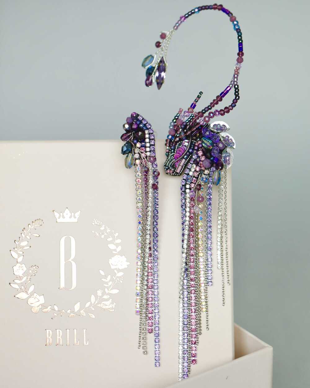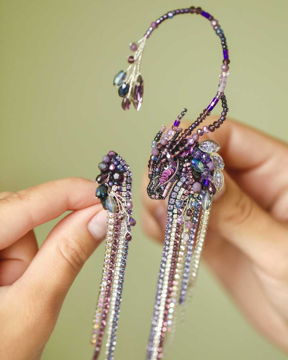 Главная серьга в виде дракона имеет декорированную дугу-кафф, которая заводится за ухо для удобства и плотной посадки.