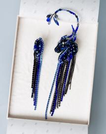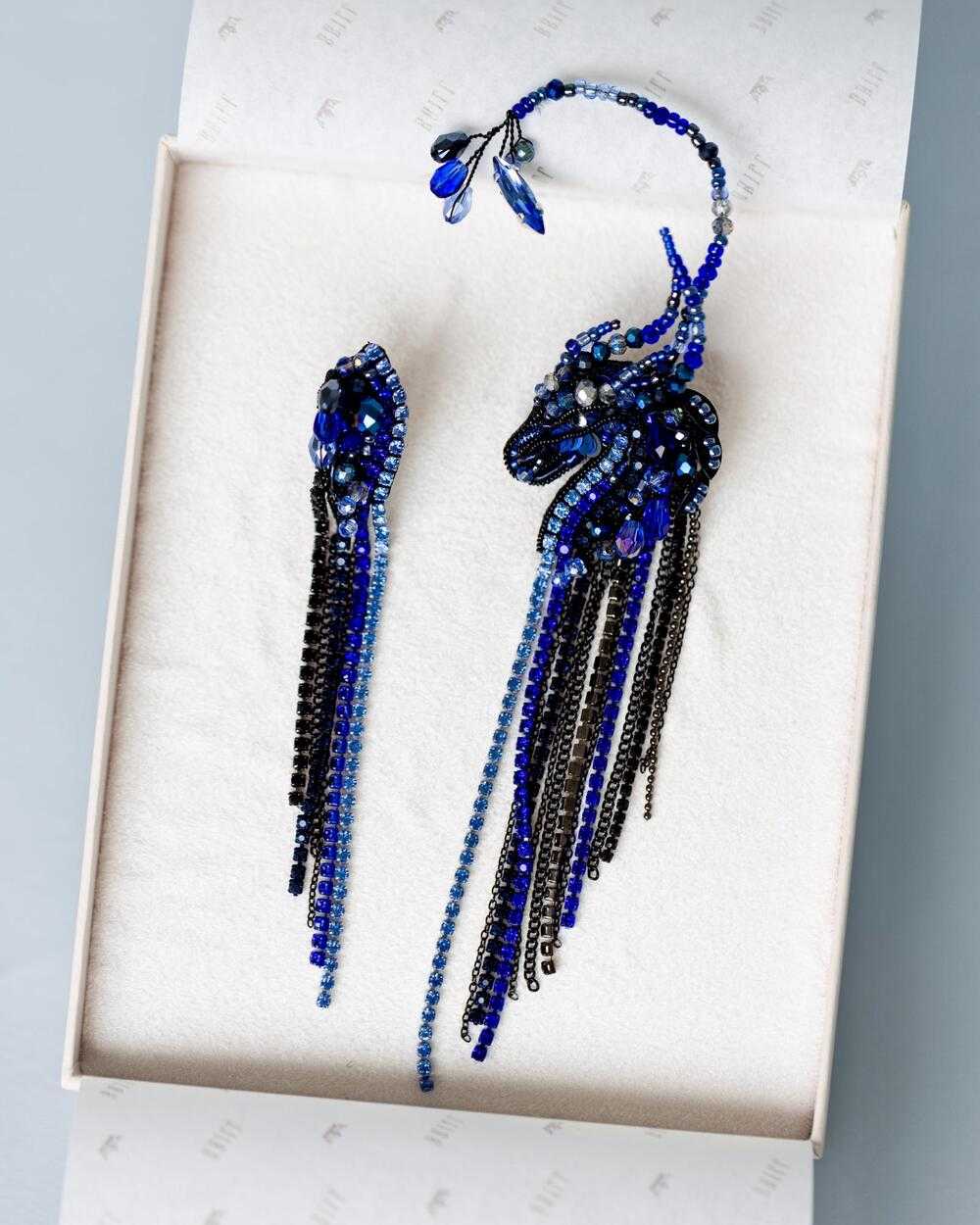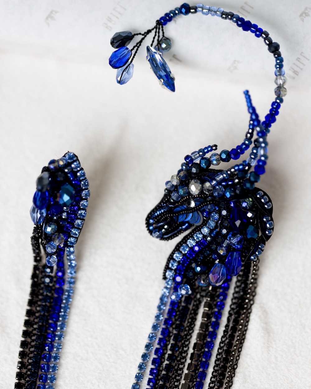 Главная серьга в виде дракона имеет декорированную дугу-кафф, которая заводится за ухо для удобства и плотной посадки.