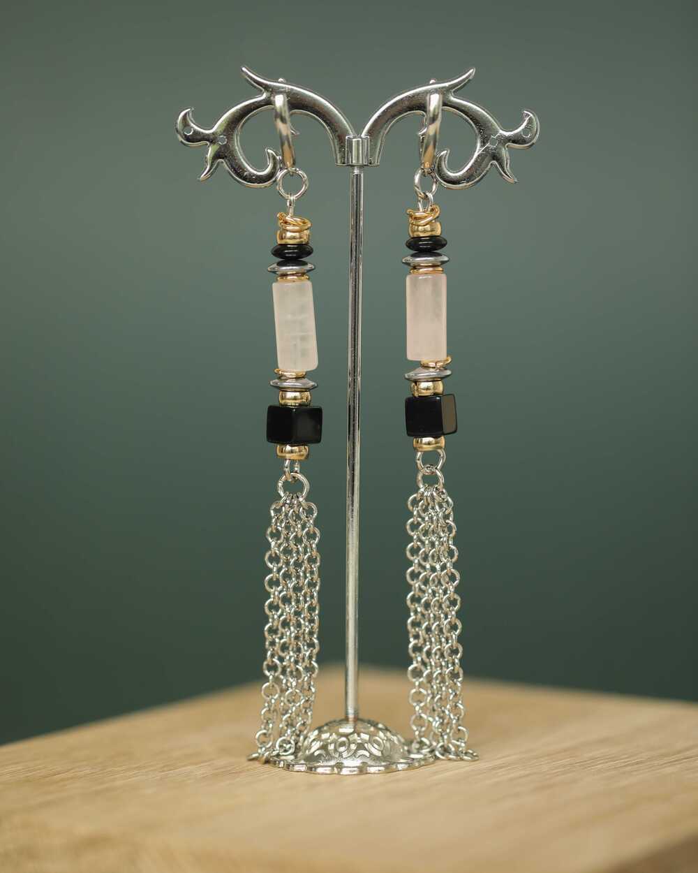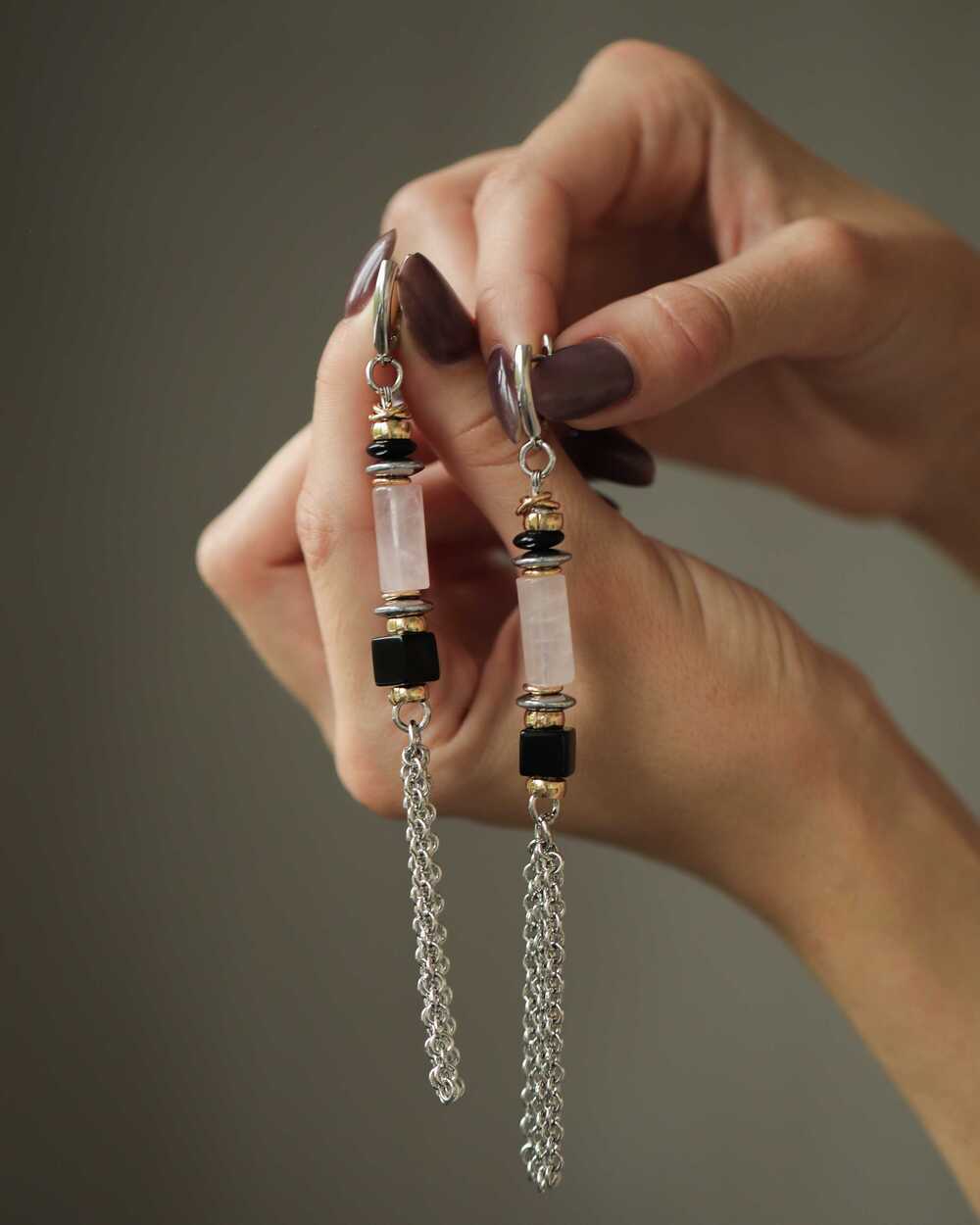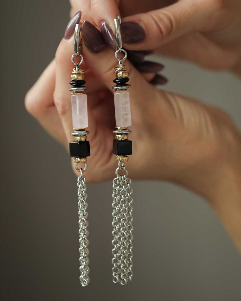 Розовый кварц, черный агат, нержавеющая сталь и латунь с покрытием