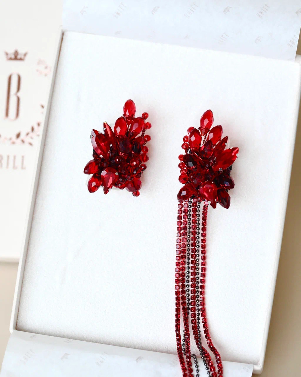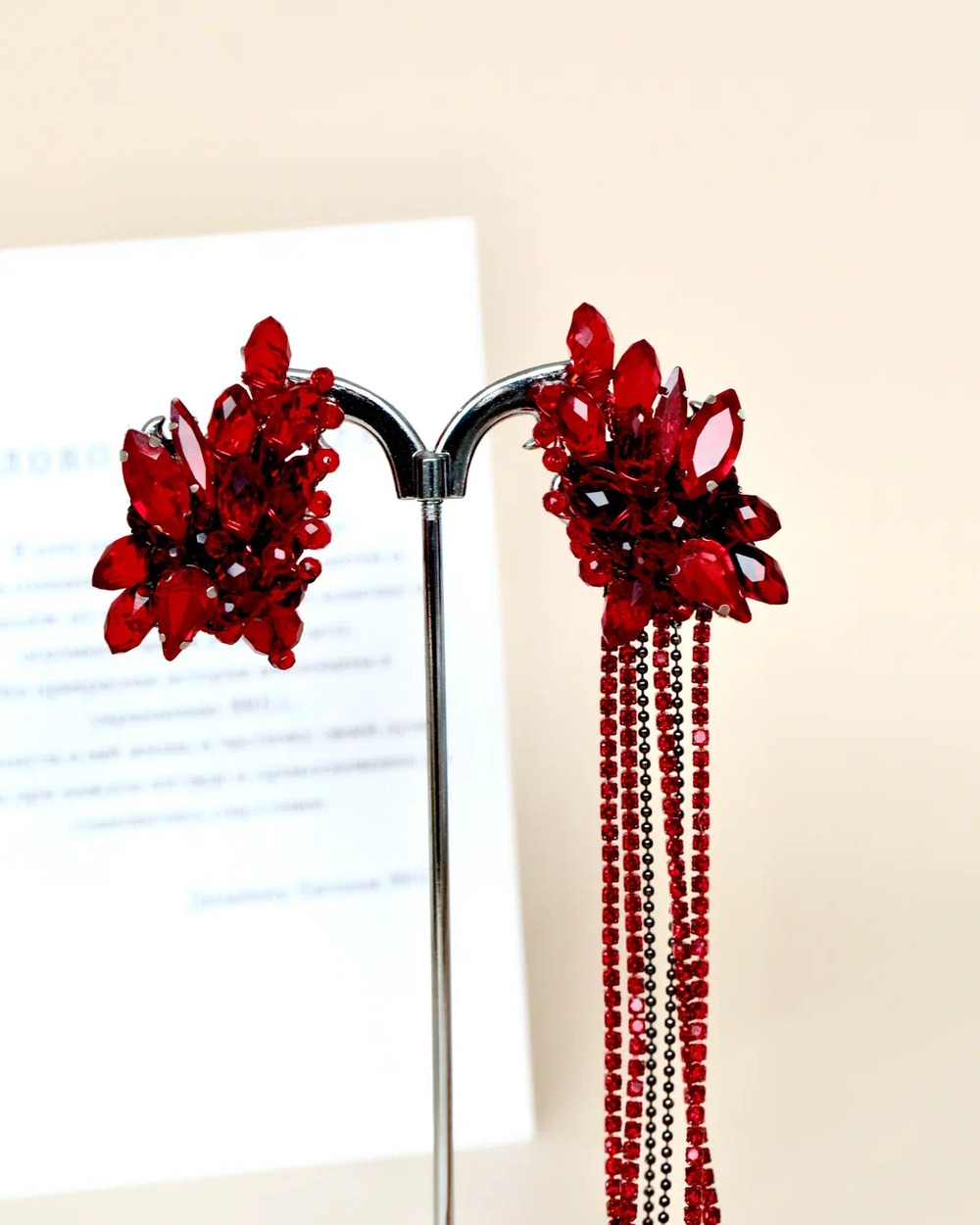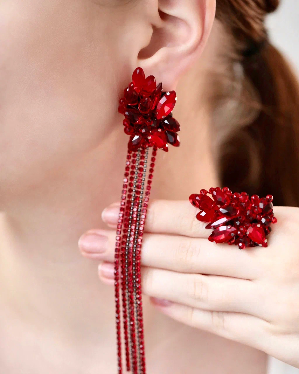 Мы долго вынашивали образ идеальных вечерних серёг. Они должны были быть как вспышка — яркими, страстными, заметными. Так появился этот фантазийный цветок цвета кармина, цвета спелой вишни и вина.