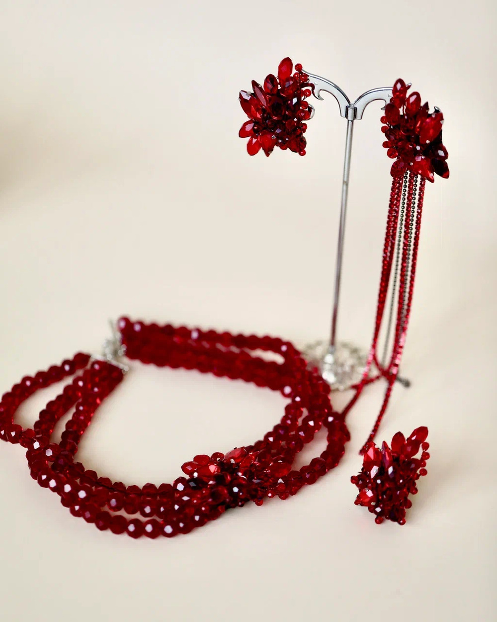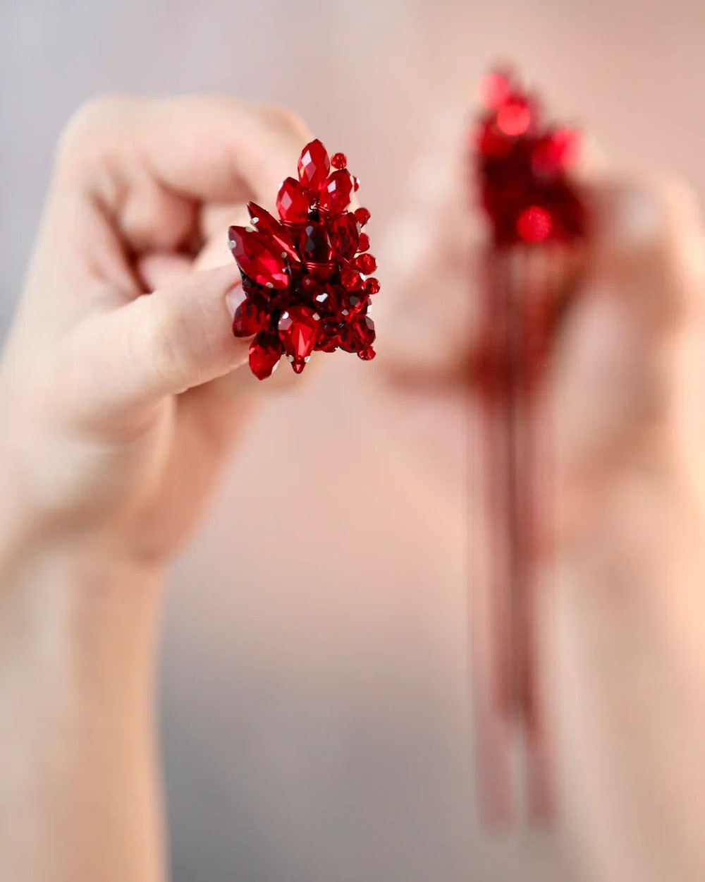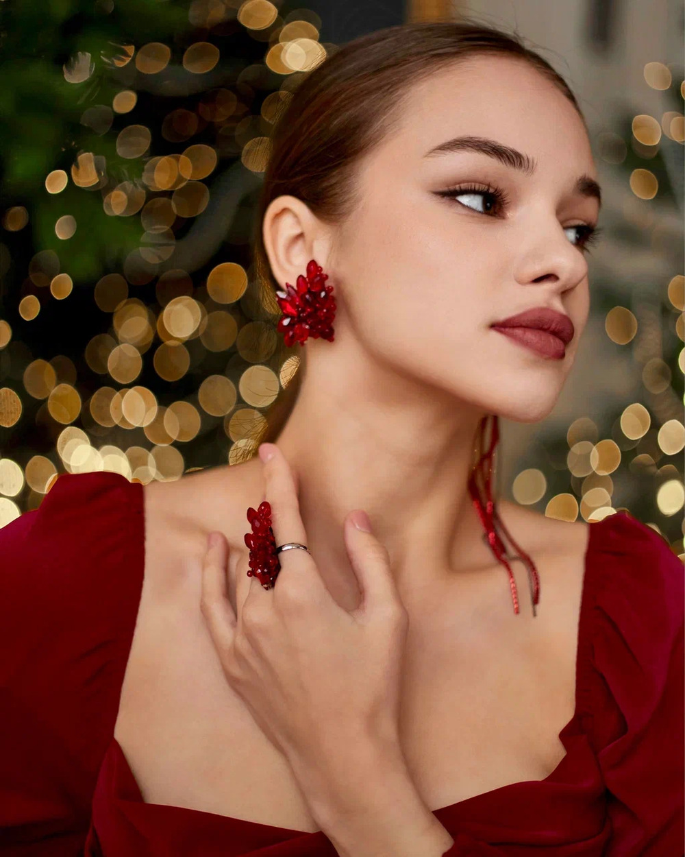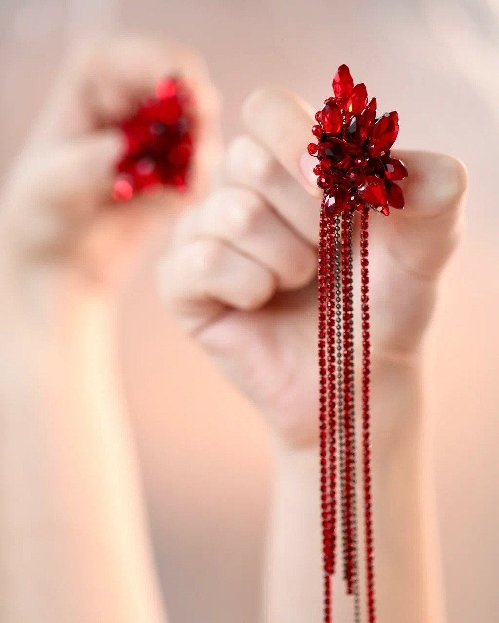 Мы долго вынашивали образ идеальных вечерних серёг. Они должны были быть как вспышка — яркими, страстными, заметными. Так появился этот фантазийный цветок цвета кармина, цвета спелой вишни и вина.