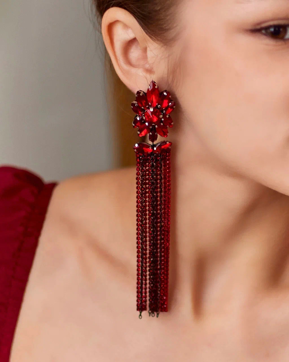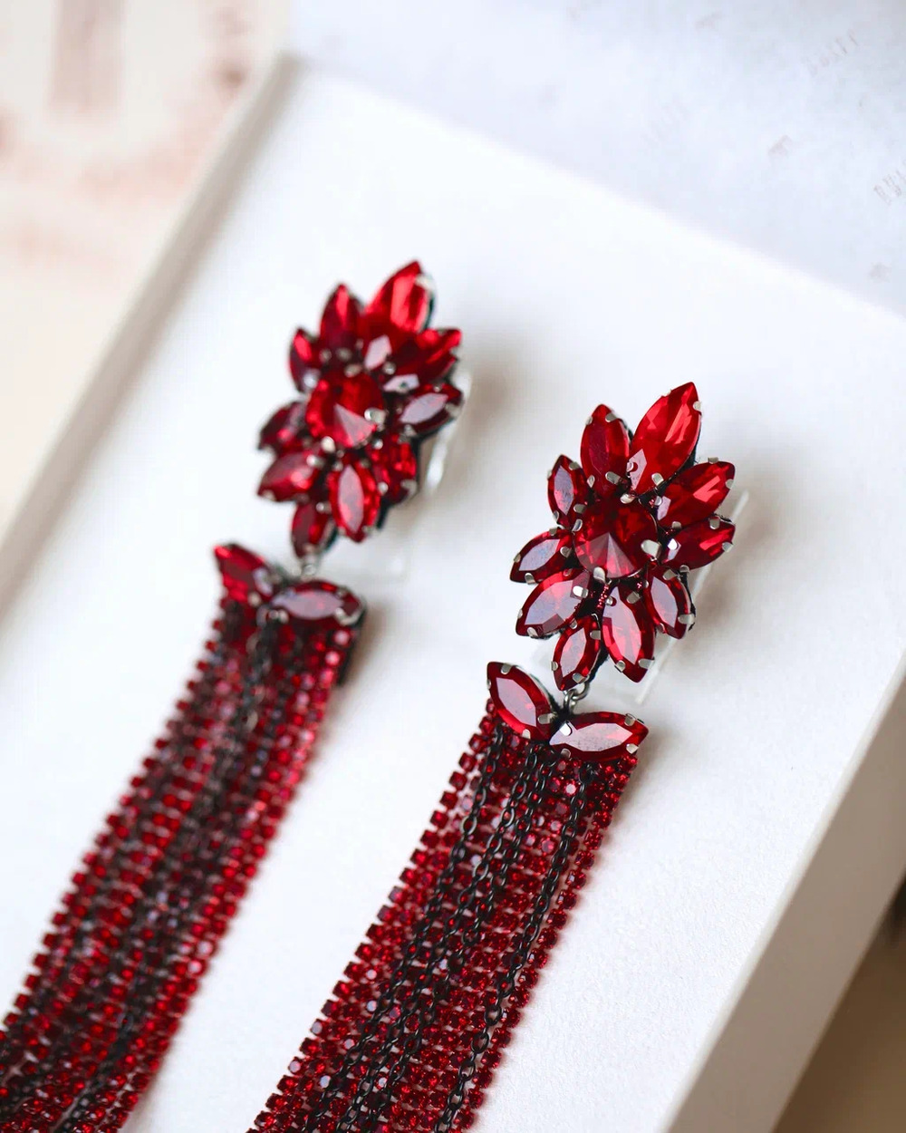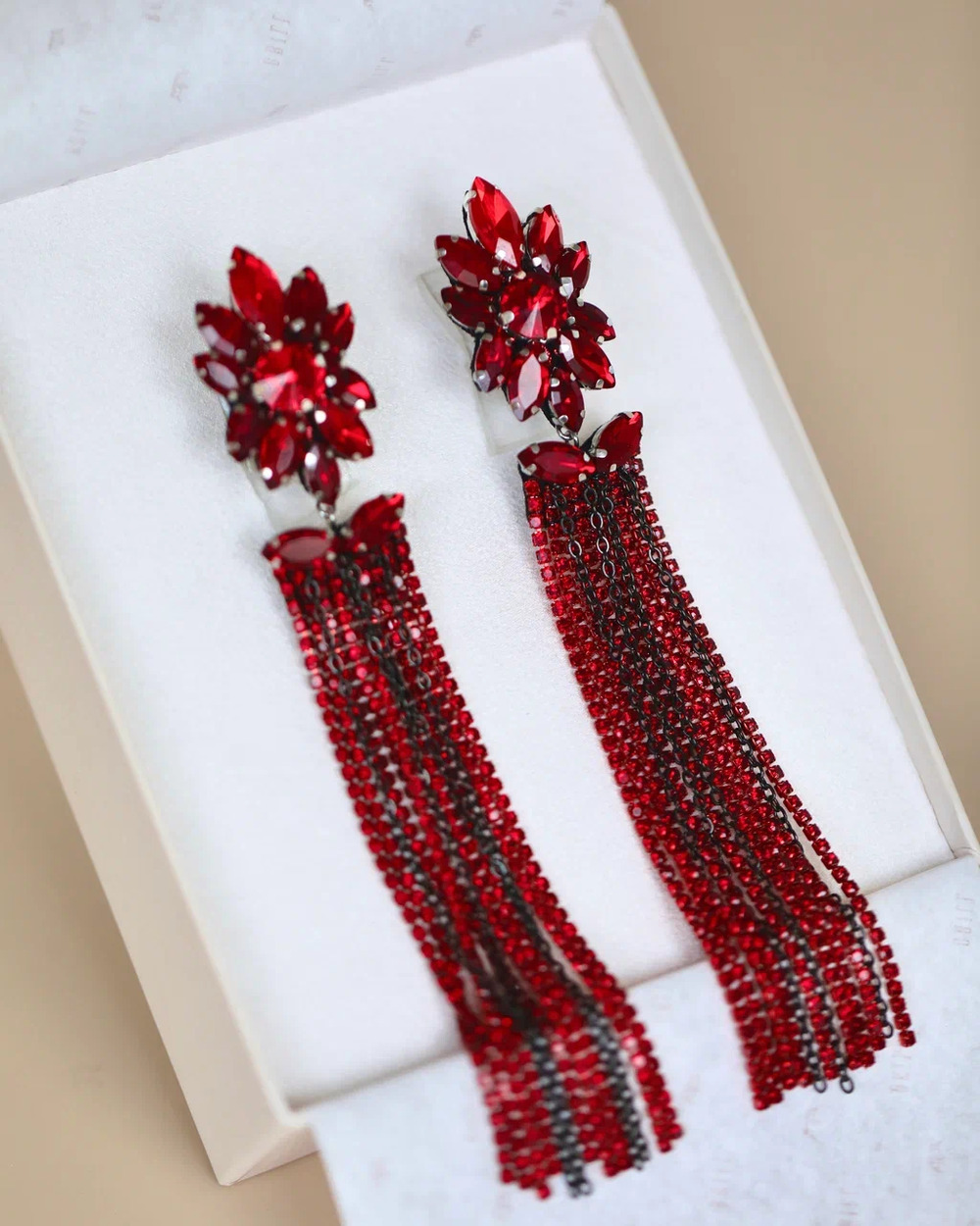 Серьги «Карнелия» созданы для ваших шикарных вечерних выходов… Их главная фишка — сочный красный цвет и длинные, переливающиеся цепочки со стразами. Они красиво блестят при каждом движении и сразу притягивают взгляды.