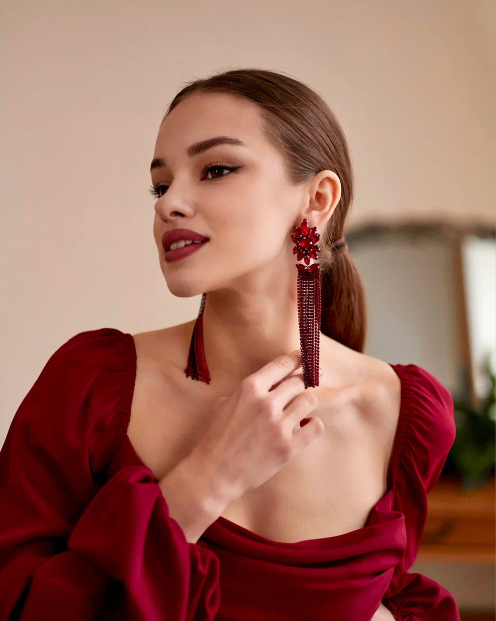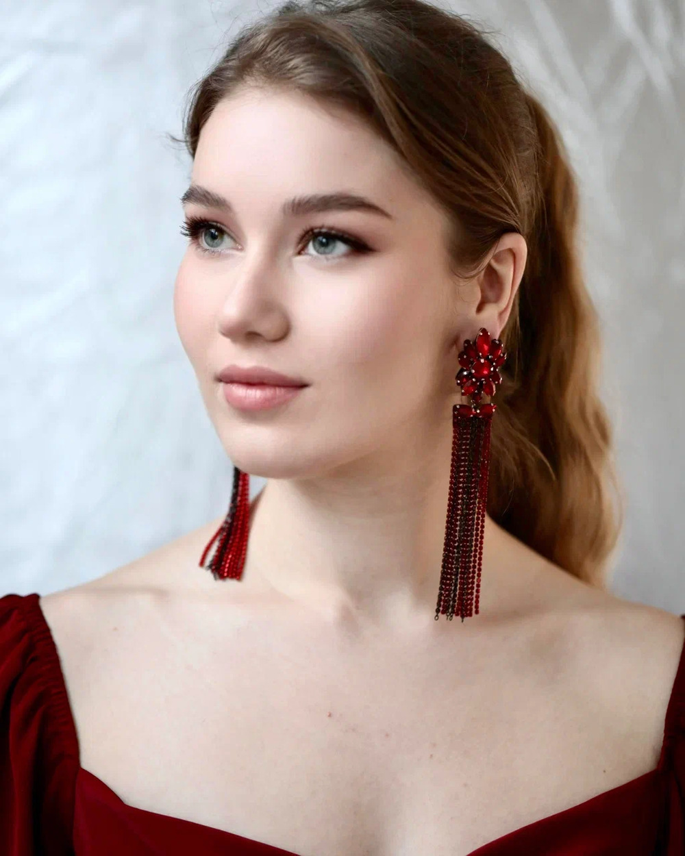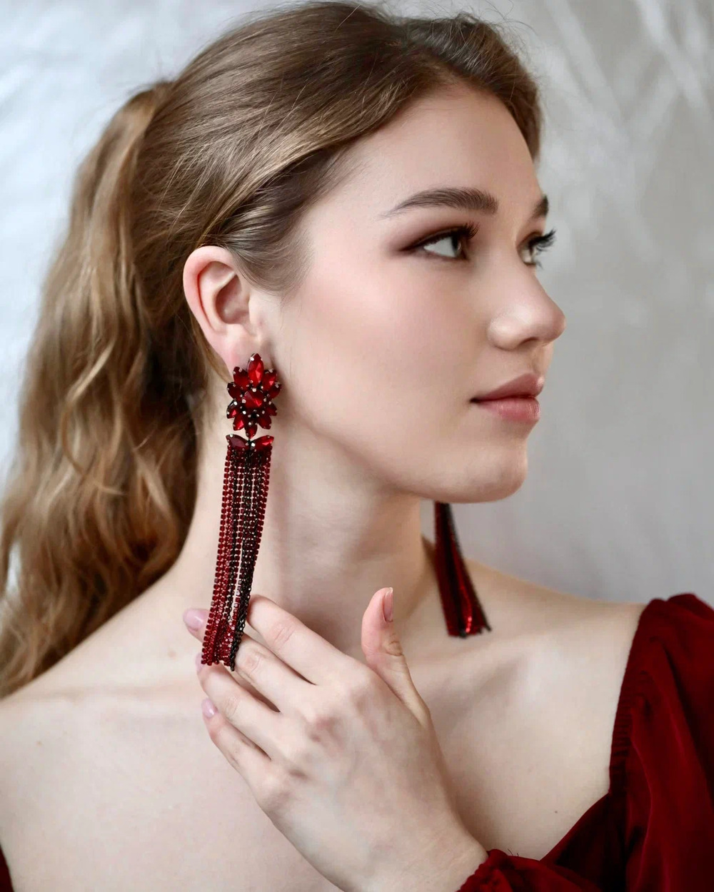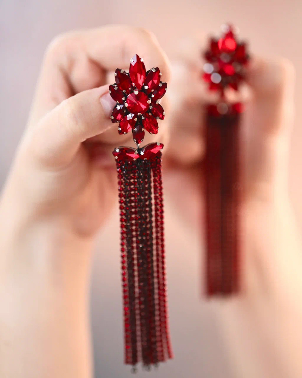 Серьги «Карнелия» созданы для ваших шикарных вечерних выходов… Их главная фишка — сочный красный цвет и длинные, переливающиеся цепочки со стразами. Они красиво блестят при каждом движении и сразу притягивают взгляды.
