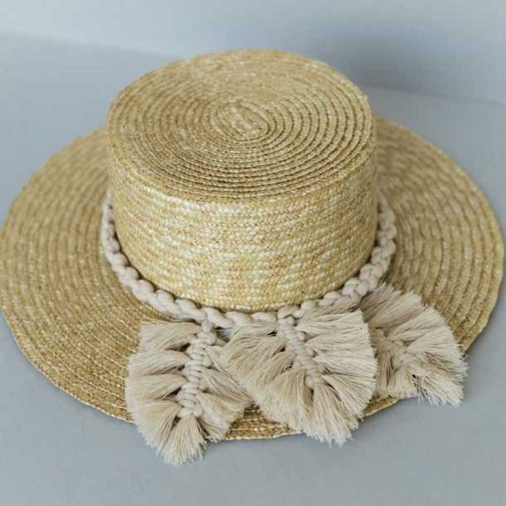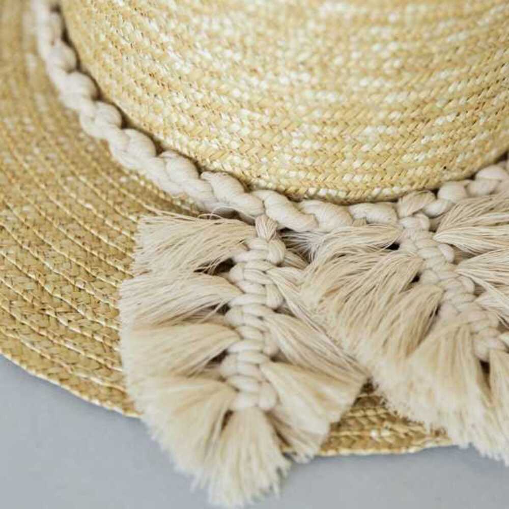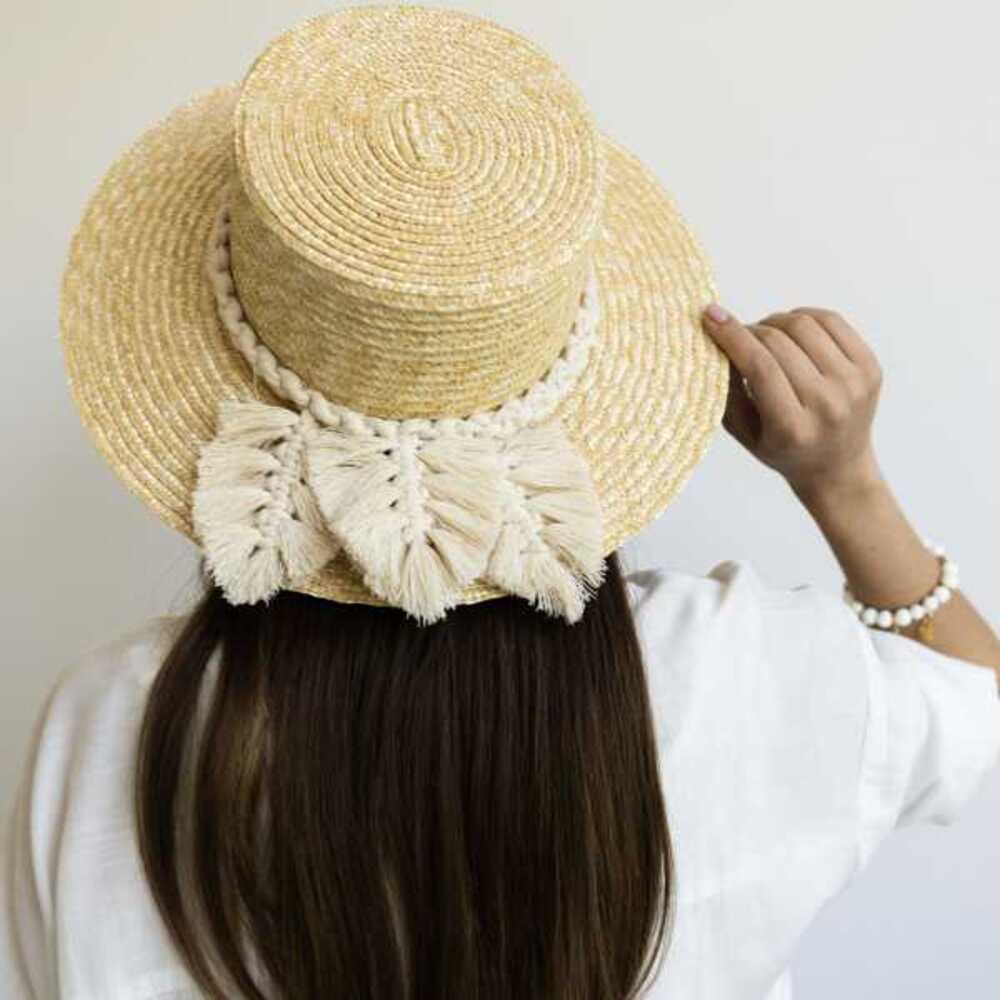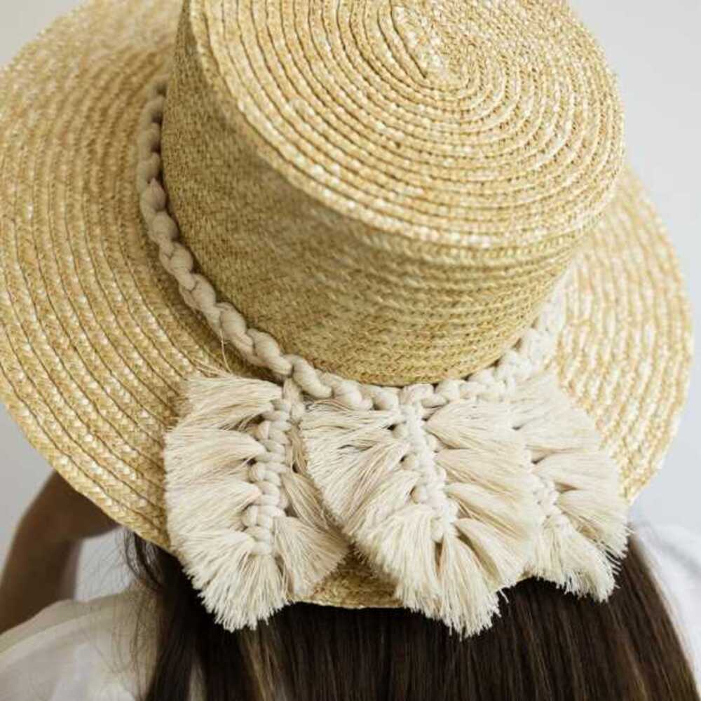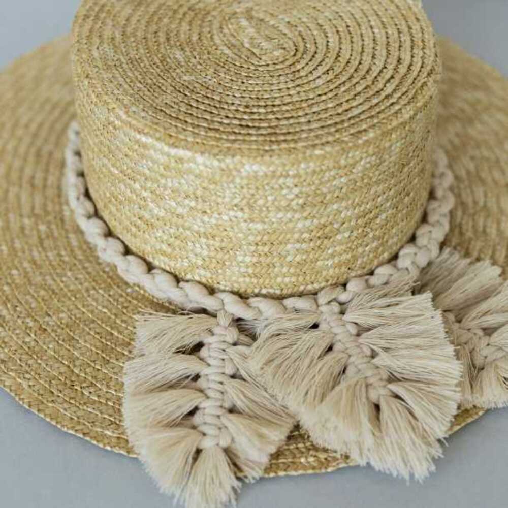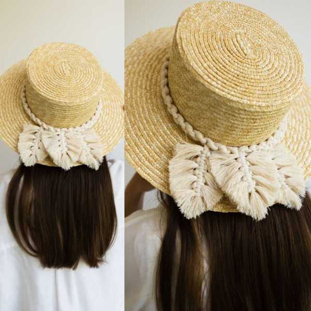 Шляпа выполнена из натуральной соломки. Декор шляпы выполнен с использованием техники плетения - макраме. Нити хлопковые.
