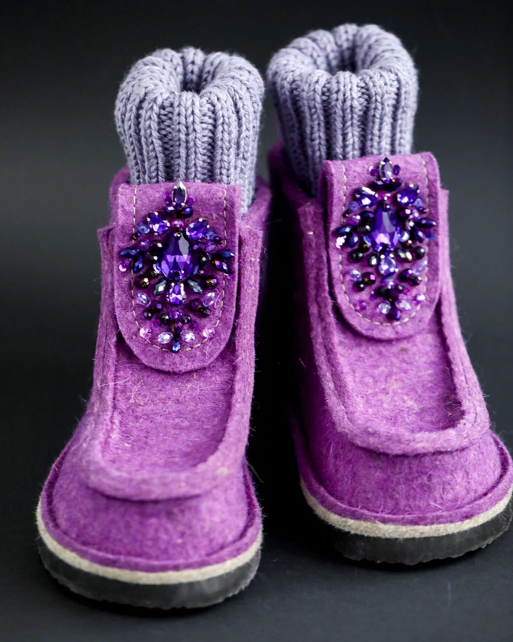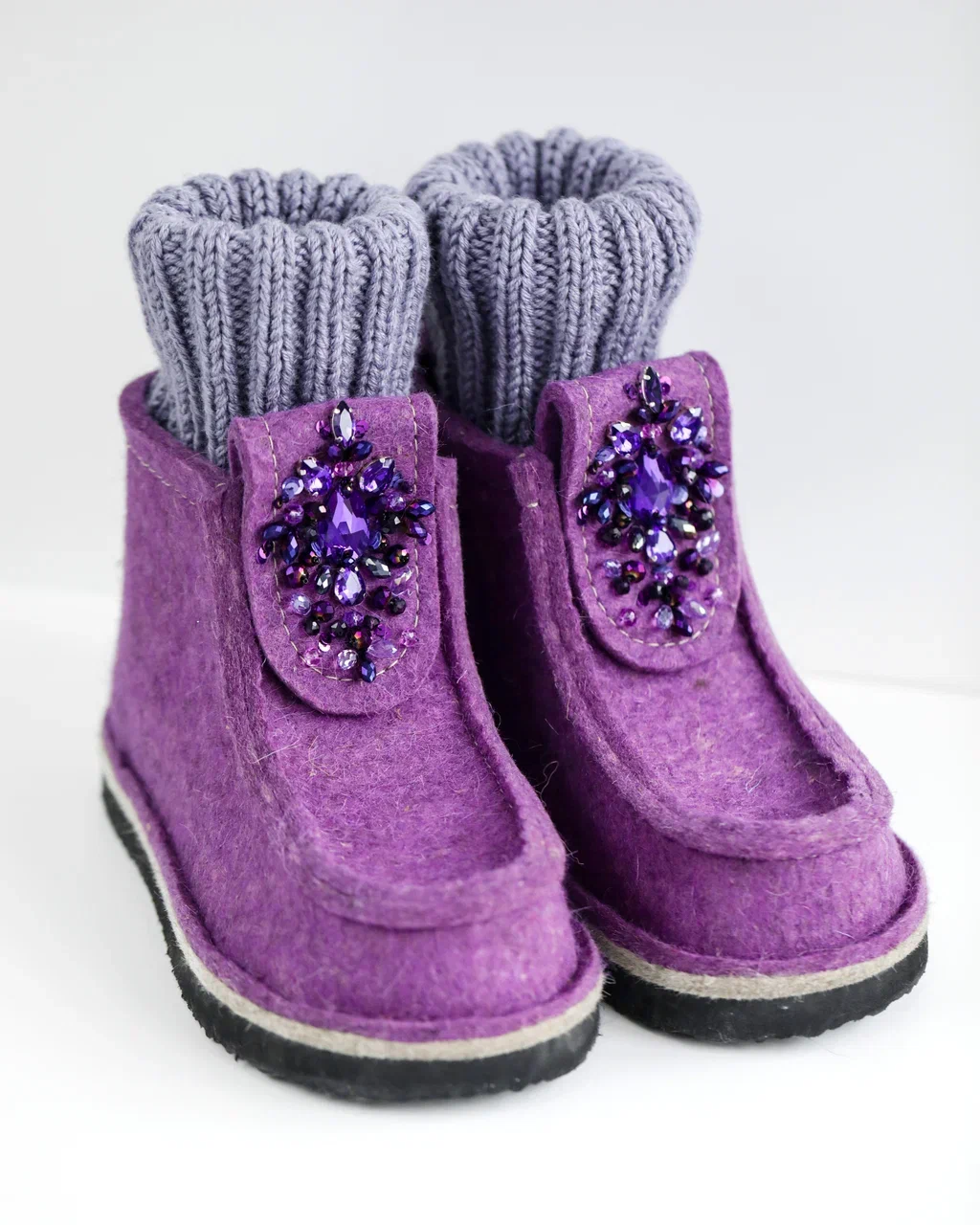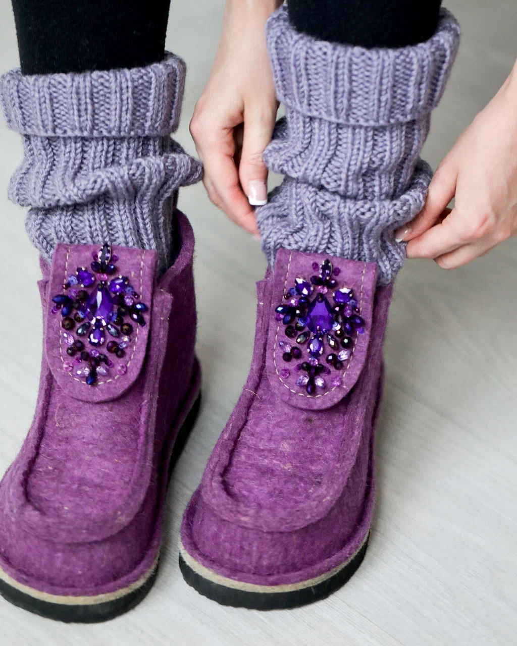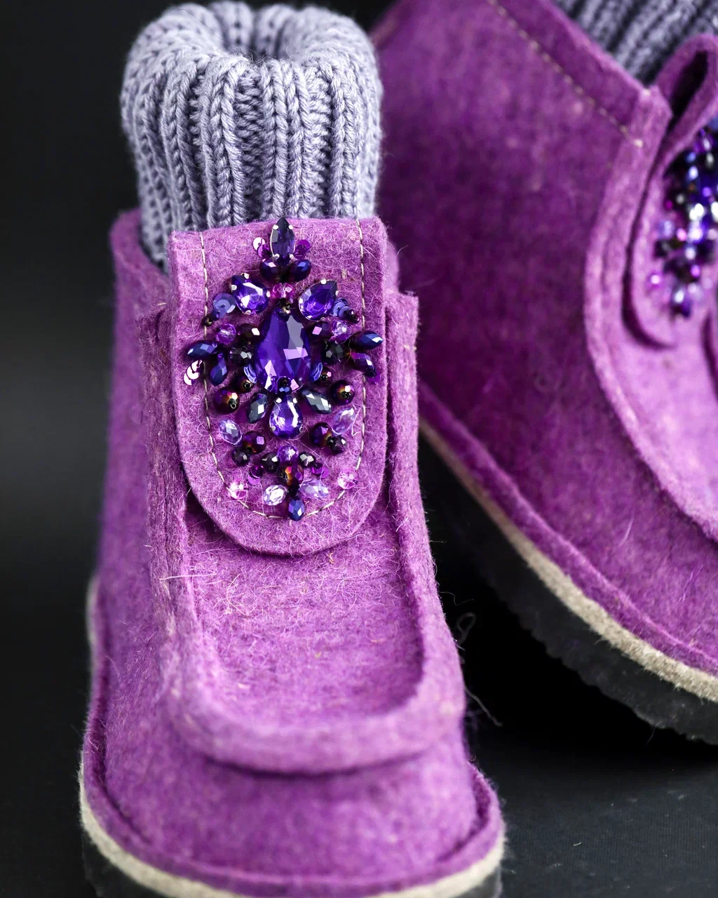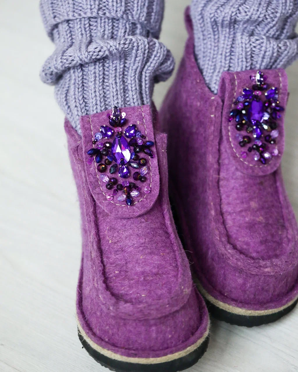 Оригинальные ВАЛЕШИ® от производителя мы украсили авторской вышивкой ручной работы бренда BRILL. Граненые бусины из чешского стекла в цвет войлока гармонично добавили женственности этой уютной и очень удобной обуви. В дополнение к ВАЛЕШАМ® вы можете выбрать полуносочки ручной вязки, которые закрывают верхнюю часть щиколотки для дополнительного тепла.