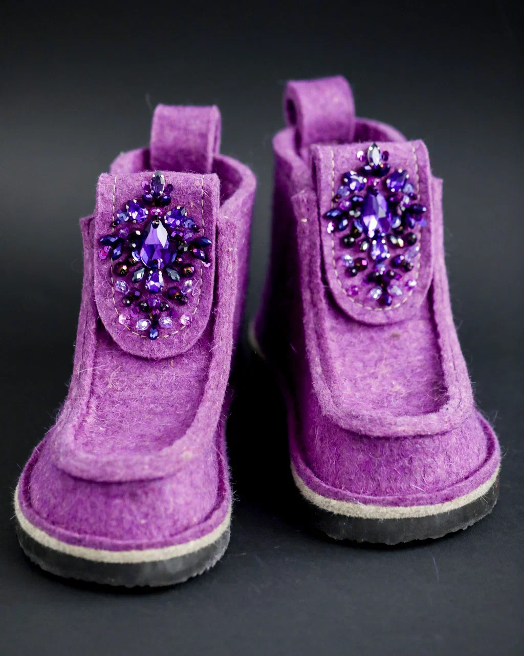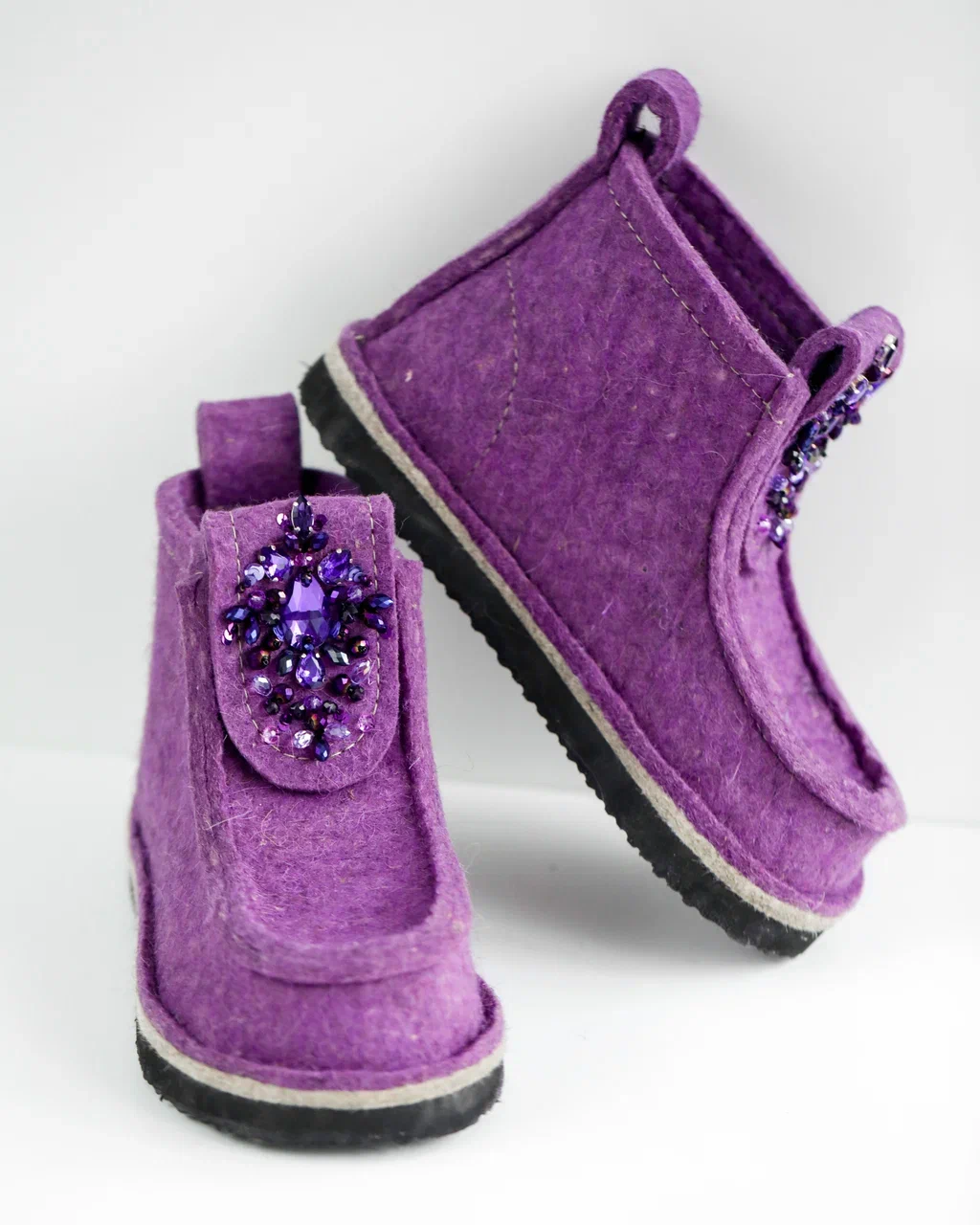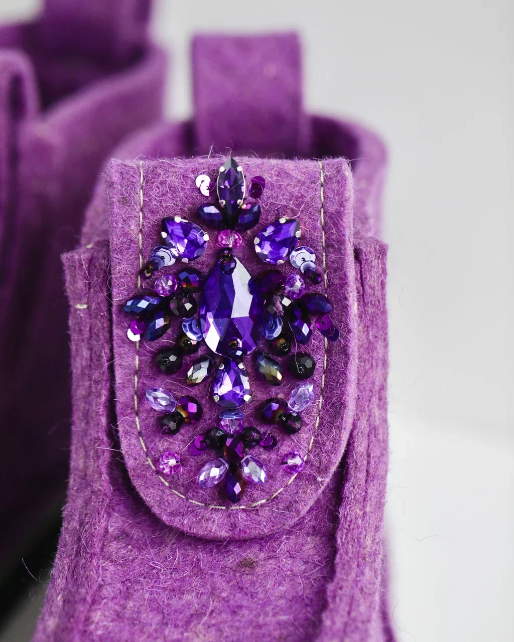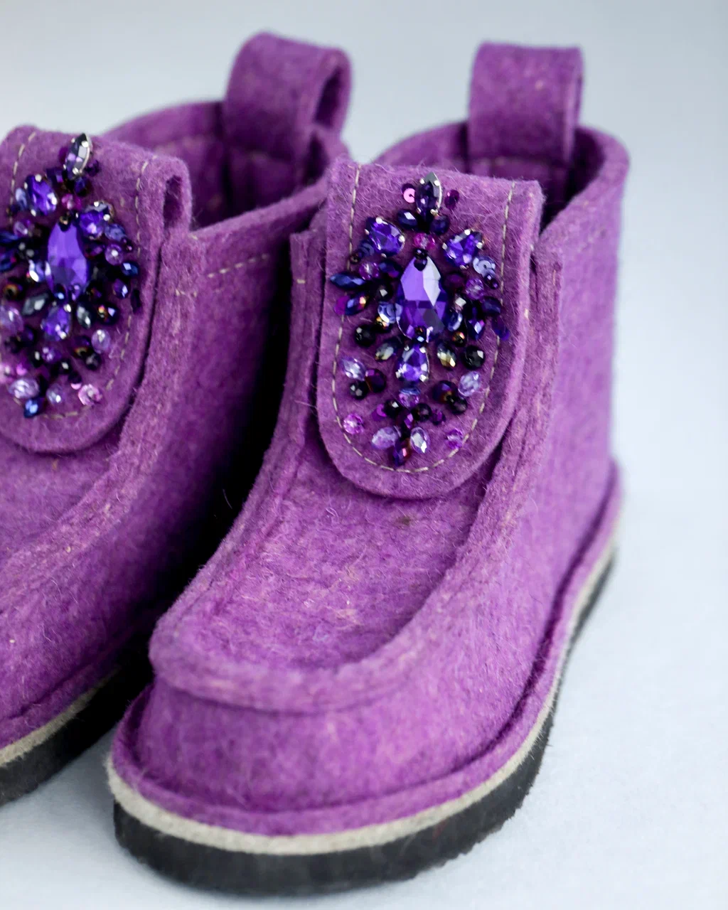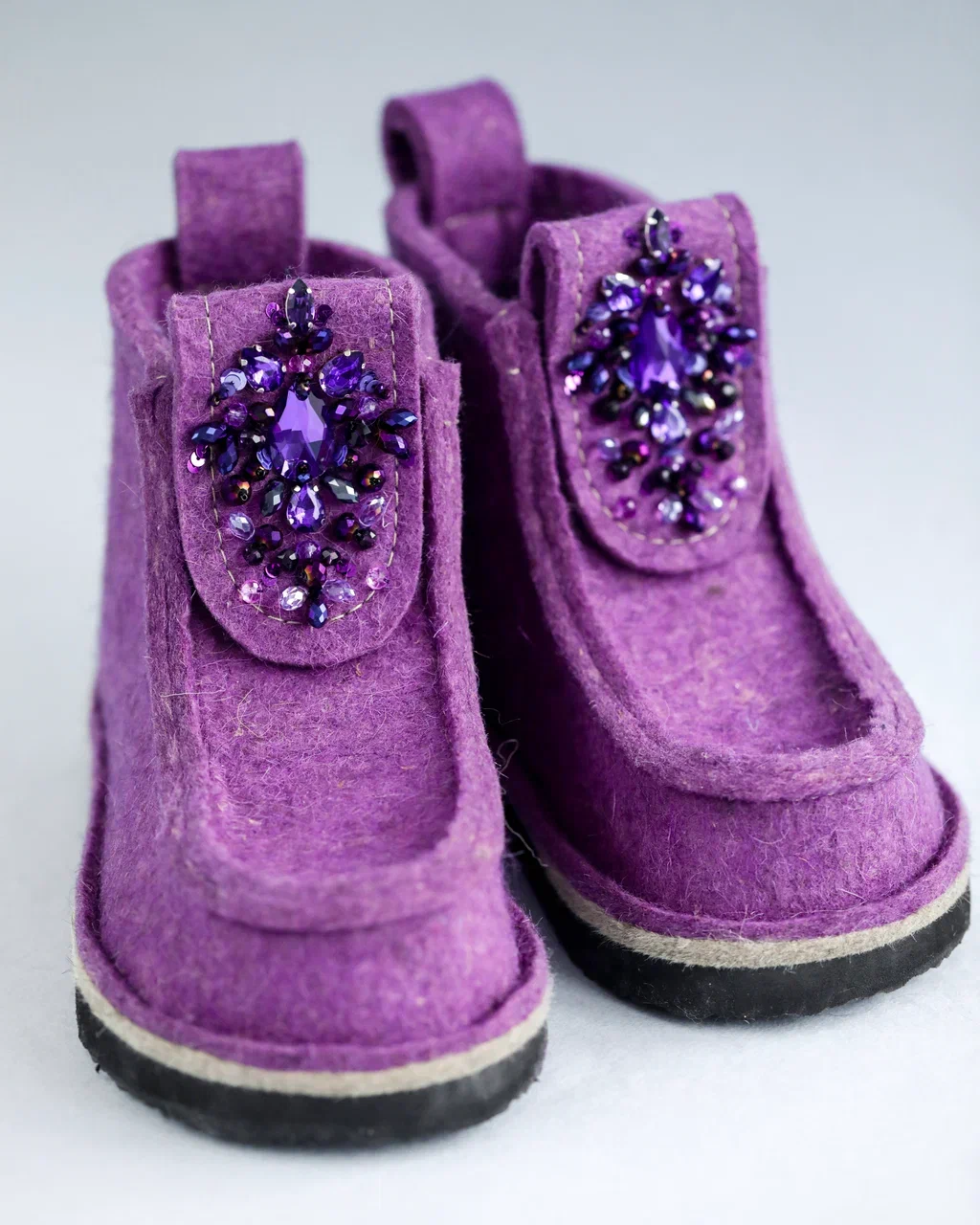 Оригинальные ВАЛЕШИ® от производителя мы украсили авторской вышивкой ручной работы бренда BRILL. Граненые бусины из чешского стекла в цвет войлока гармонично добавили женственности этой уютной и очень удобной обуви. В дополнение к ВАЛЕШАМ® вы можете выбрать полуносочки ручной вязки, которые закрывают верхнюю часть щиколотки для дополнительного тепла.